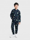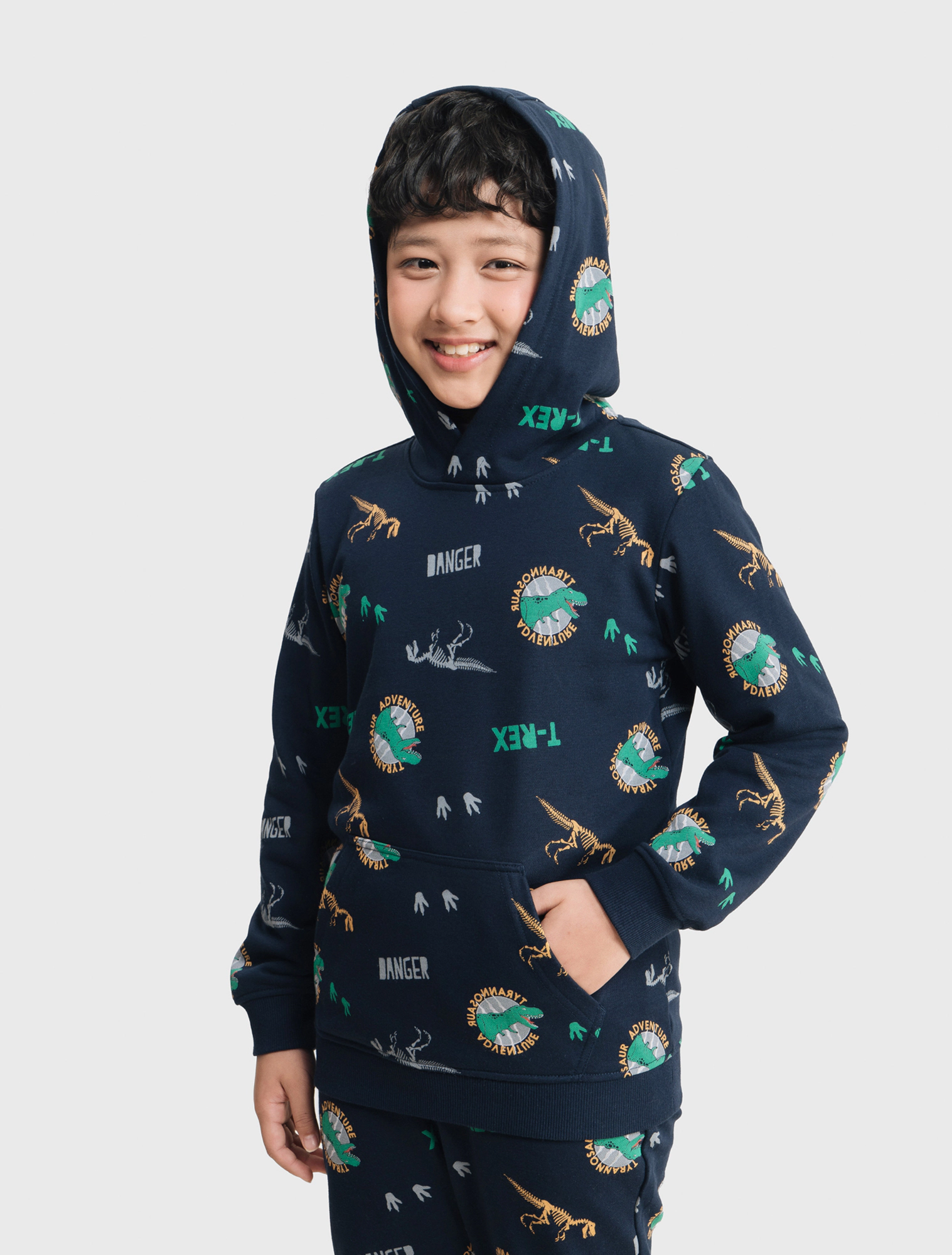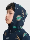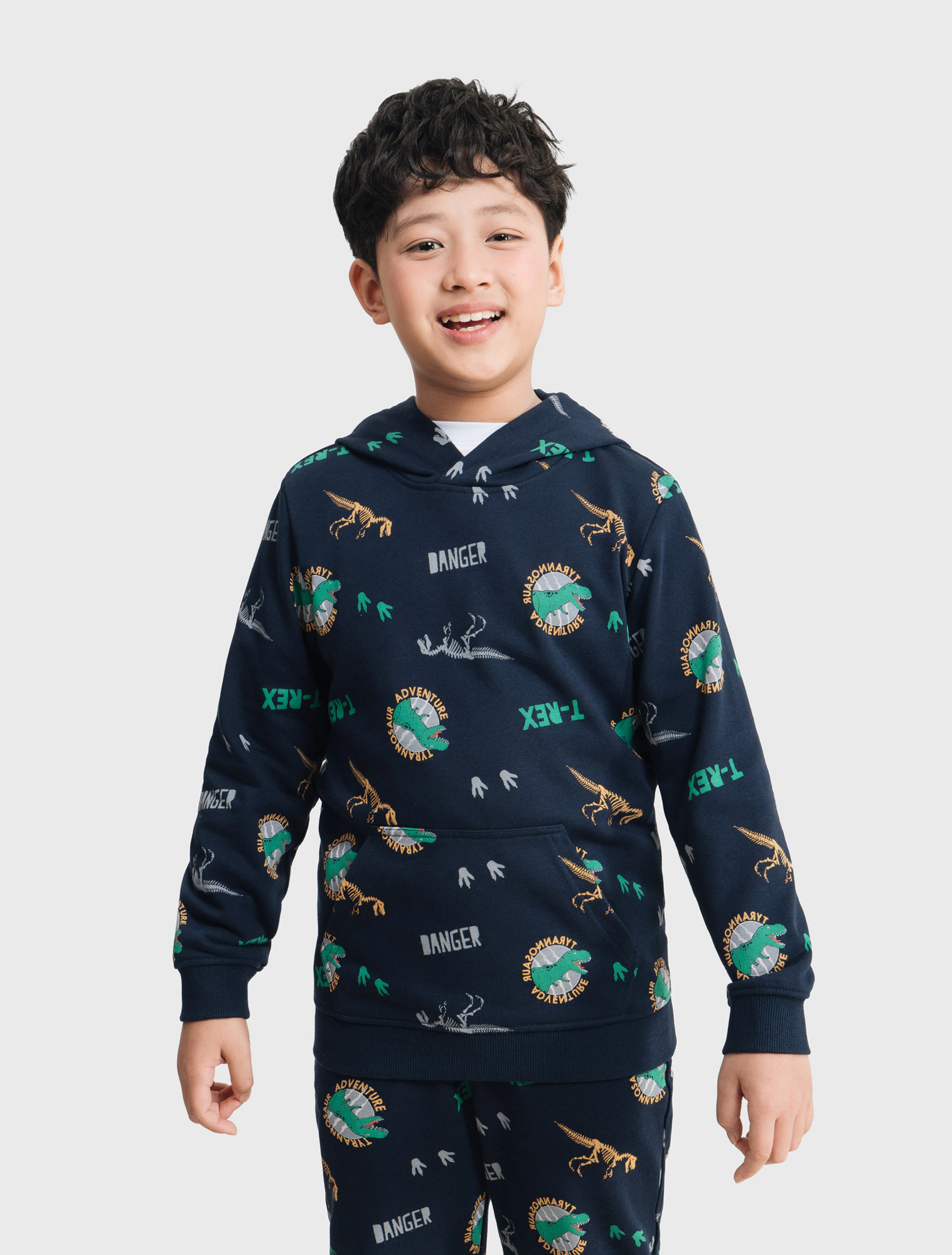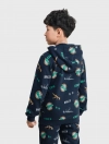 Áo nỉ bé trai có túi ốp, chất liệu vảy cá hình in tràn khủng long phù hợp với sơ thích của các bạn nhỏ.