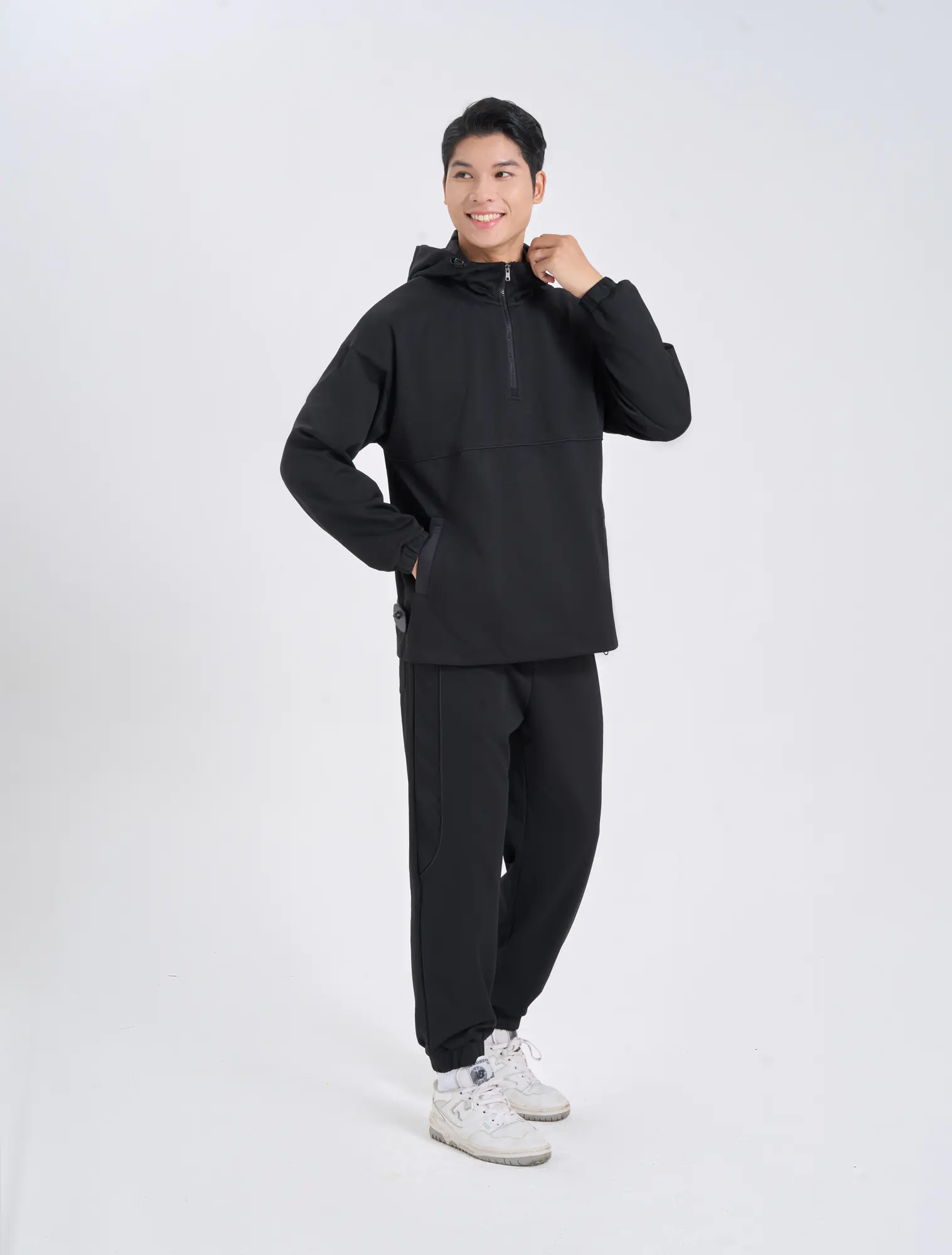 Áo khoác nỉ có mũ, dài tay, chui đầu mở khóa lửng. Có 2 túi thân trước phối vải gió, gấu luồn chun co giãn. Phù hợp nhiều hoàn cảnh sử dụng.