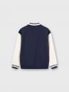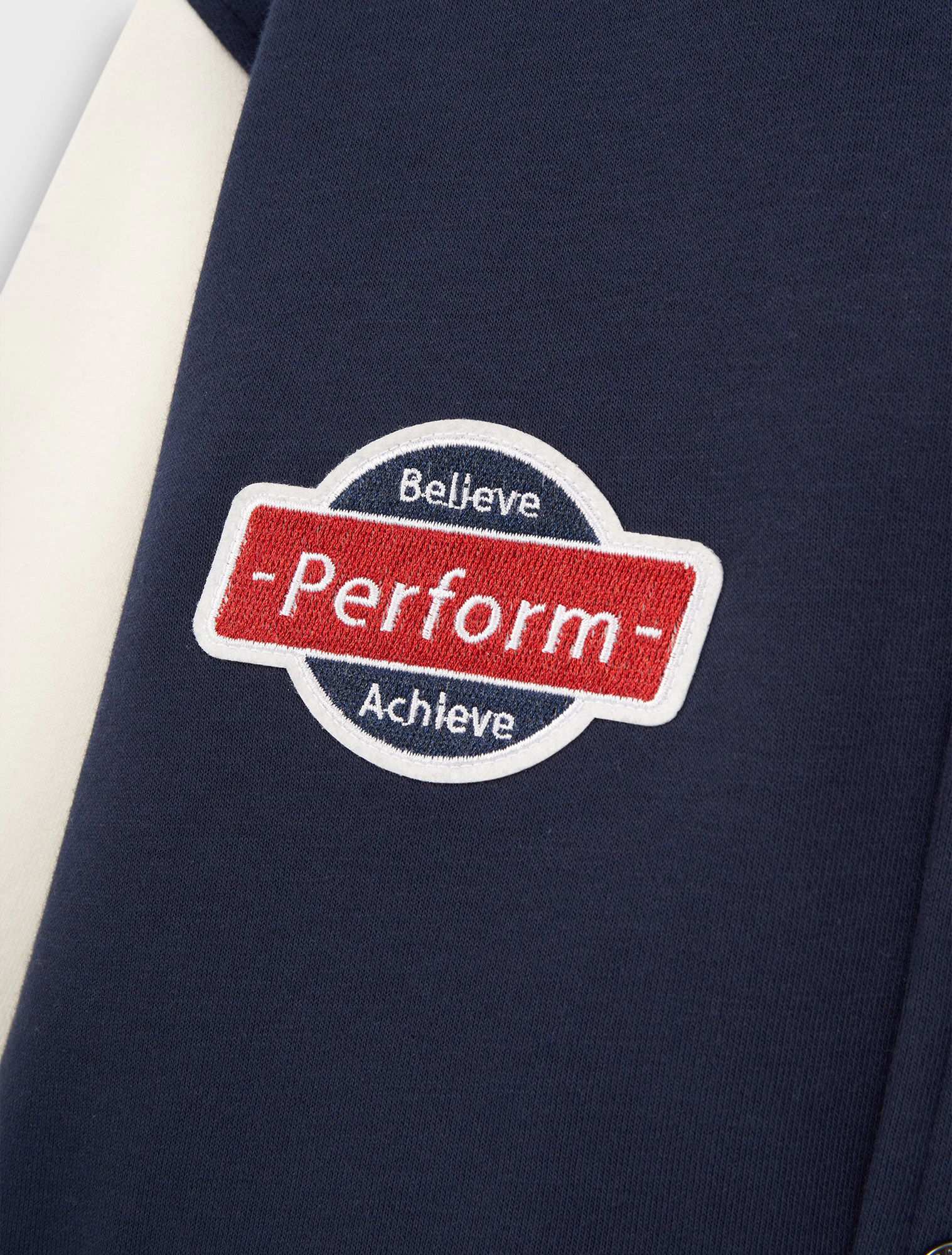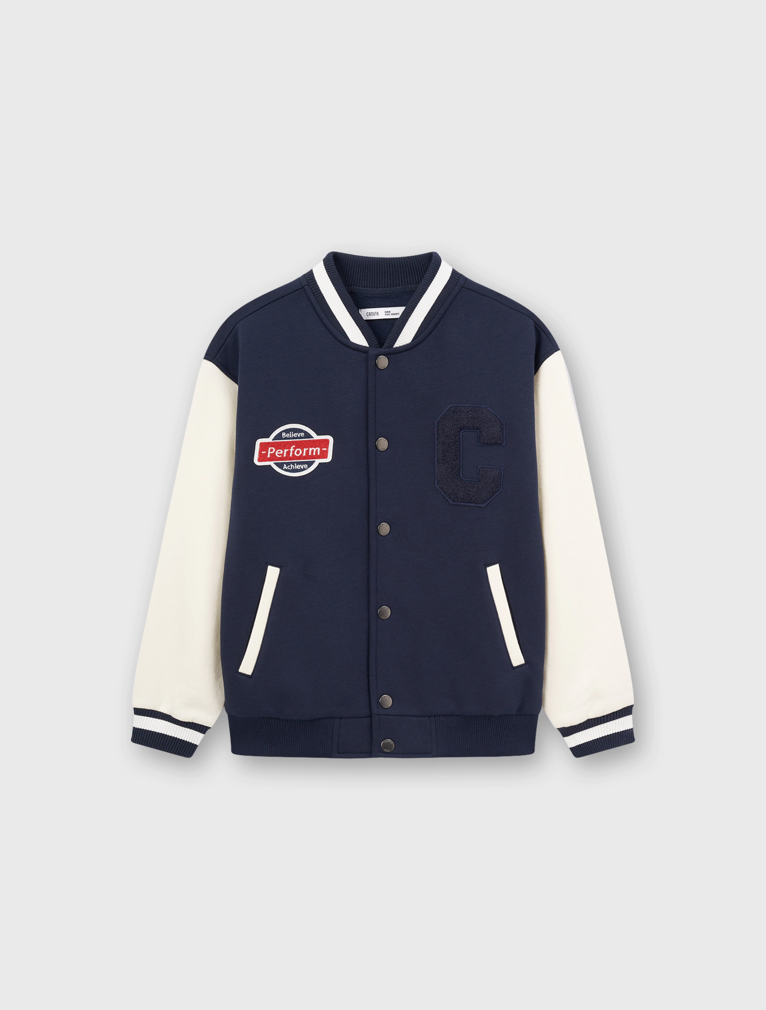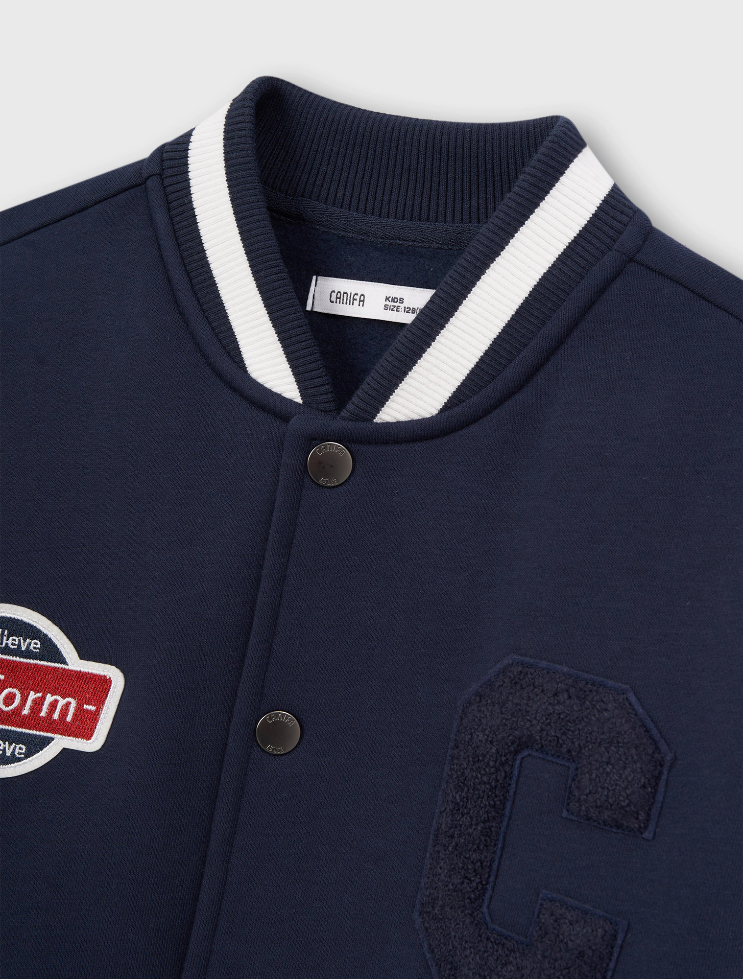 Áo khoác bé trai đính patch trang trí được may bằng chất liệu vải cào bông ấm áp. Cổ, gấu tay bằng bo kẻ. Tay phối màu khỏe khoắn.Túi viền phía trước. Cài khuy bấm phía trước.