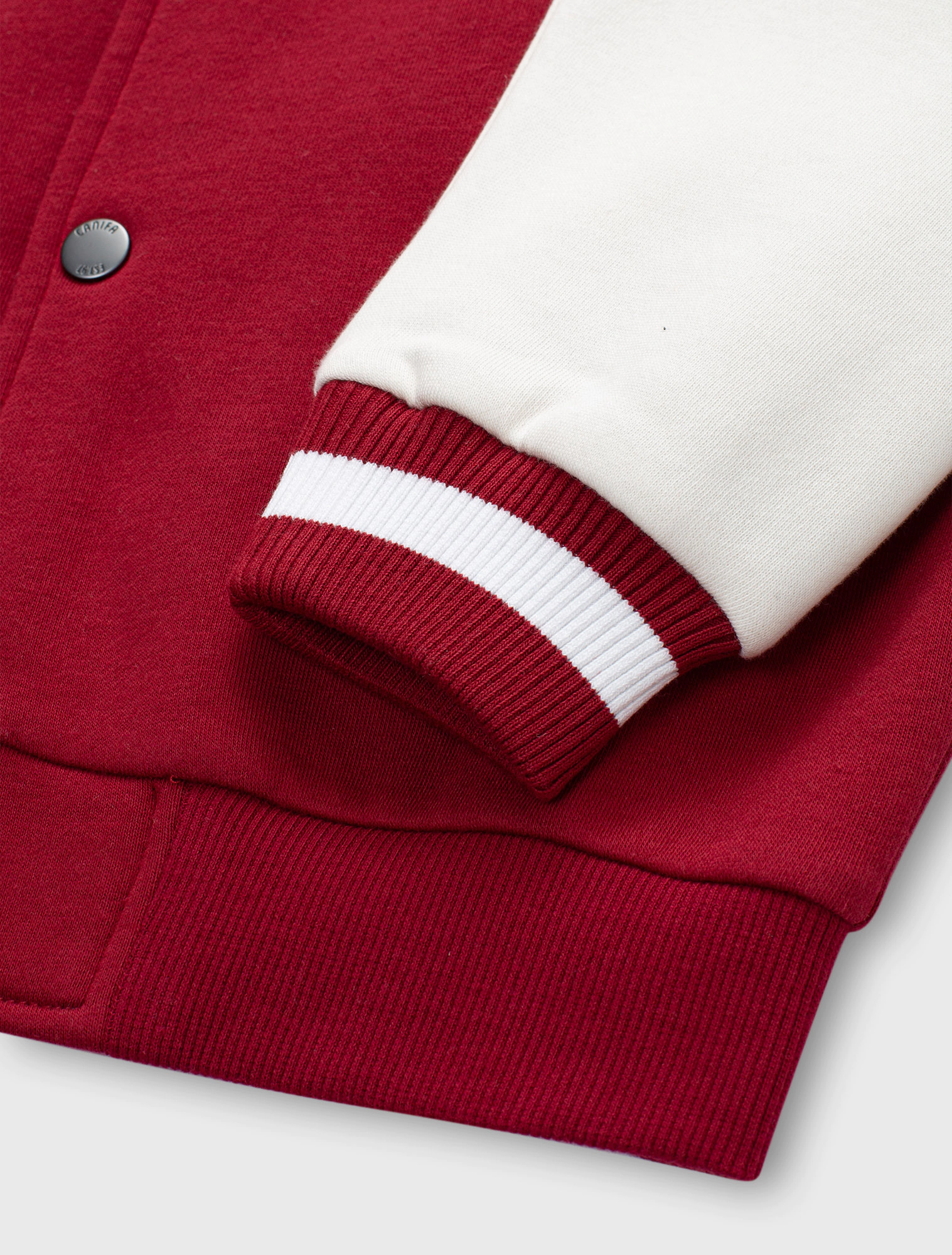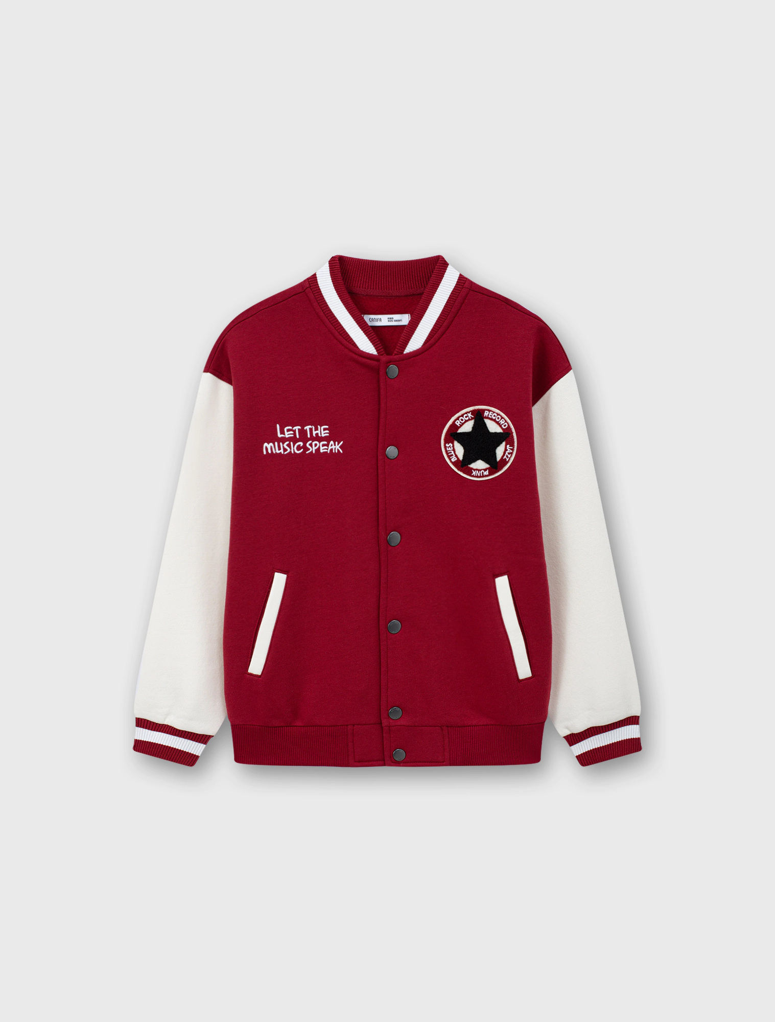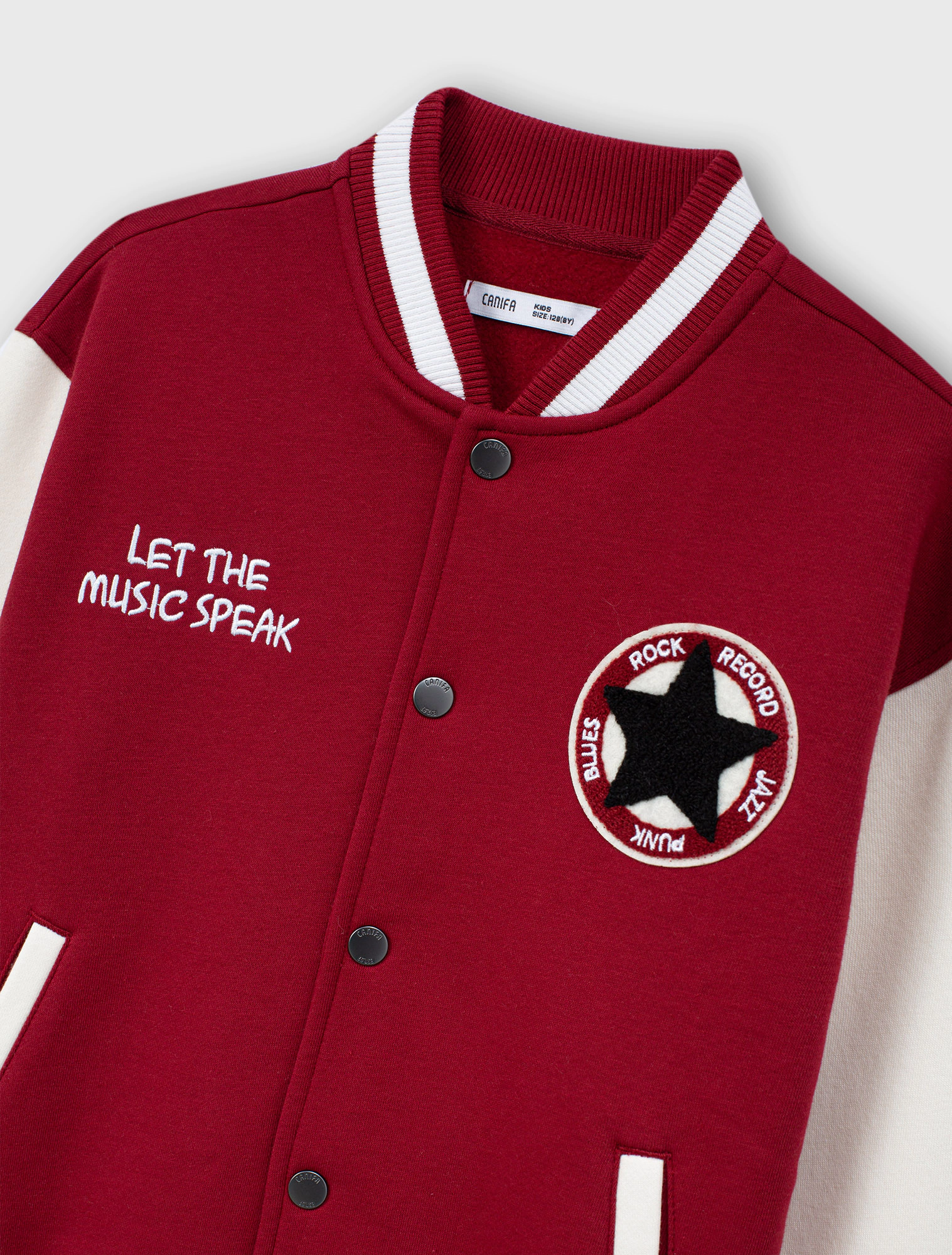 Áo khoác bé trai đính patch trang trí được may bằng chất liệu vải cào bông ấm áp. Cổ, gấu tay bằng bo kẻ. Tay phối màu khỏe khoắn.Túi viền phía trước. Cài khuy bấm phía trước.