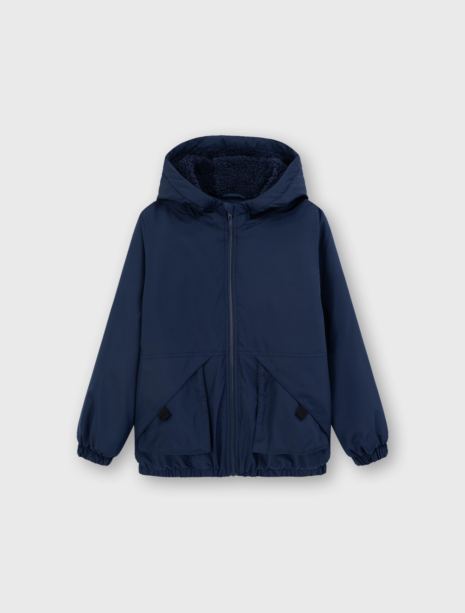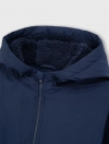 Áo khoác bé trai 2 lớp chất liệu vải chống thấm nước, có mũ trùm đầu, dài tay. Cài khóa kéo, chun gấu và cửa tay giúp tăng khả năng cản gió. Có hai túi có nắp kiểu dáng mới lạ. Lót lông bên trong.
