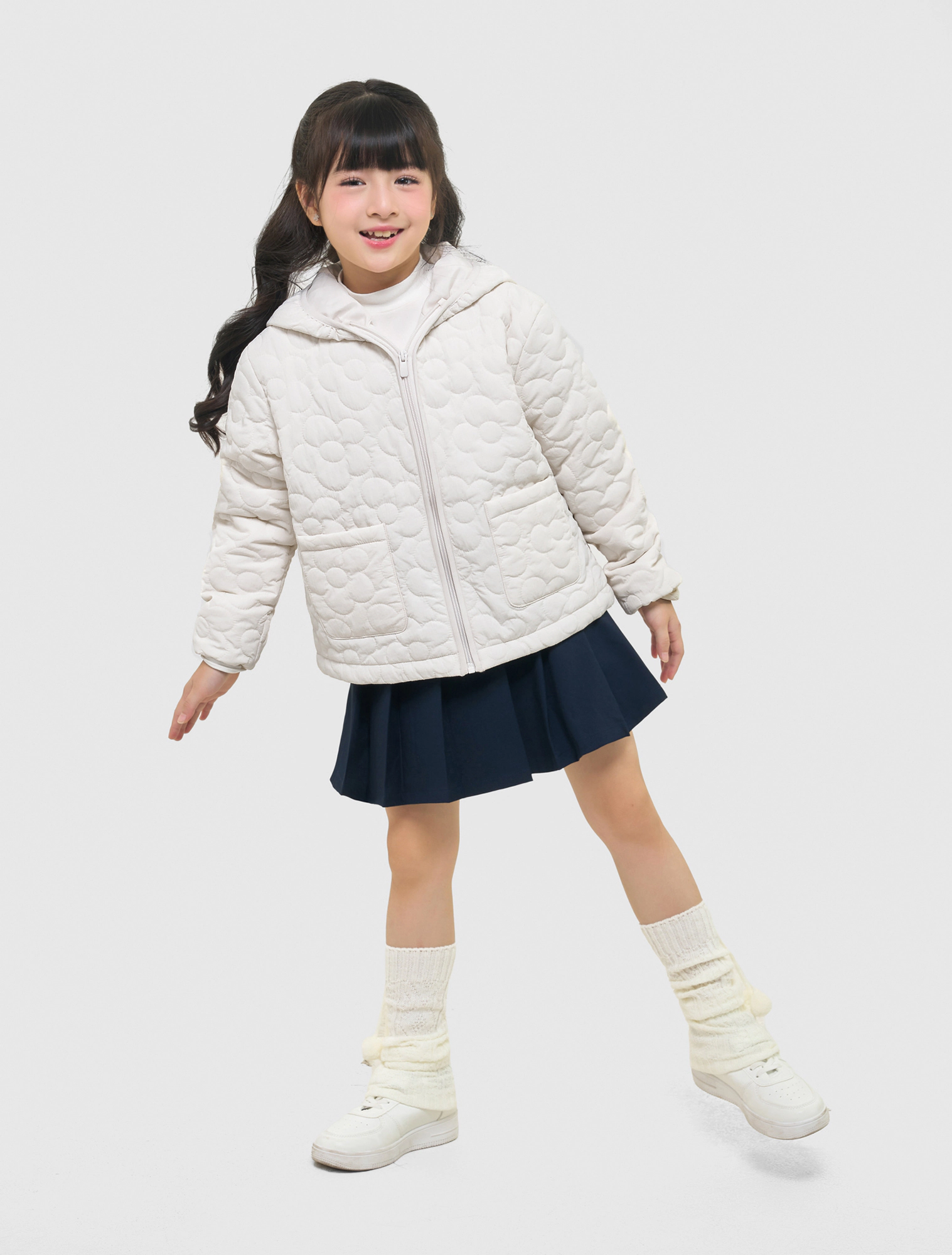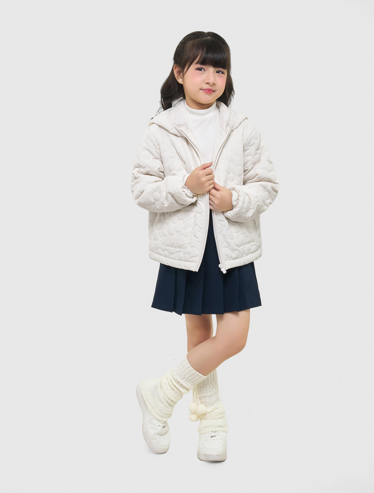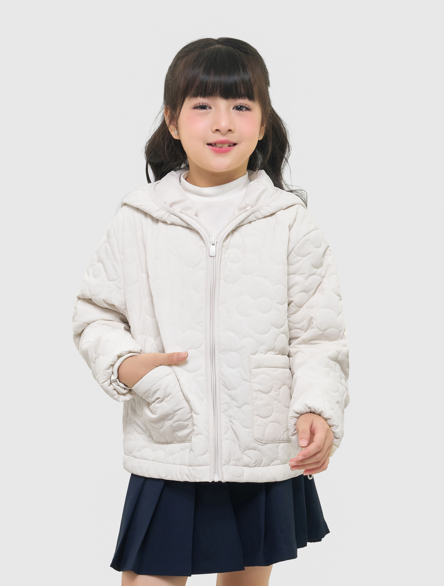 Áo khoác chần bông có mũ bé gái chống thấm nước. Phom dáng cơ bản dễ mặc. Bước chần bông có họa tiết hình hoa và bươm bướm dễ thương, màu sắc tươi sáng phù hợp bé gái. Áo chần bông độ dày trung bình, có 2 túi ốp thân trước, gấu áo rút chun linh hoạt.
