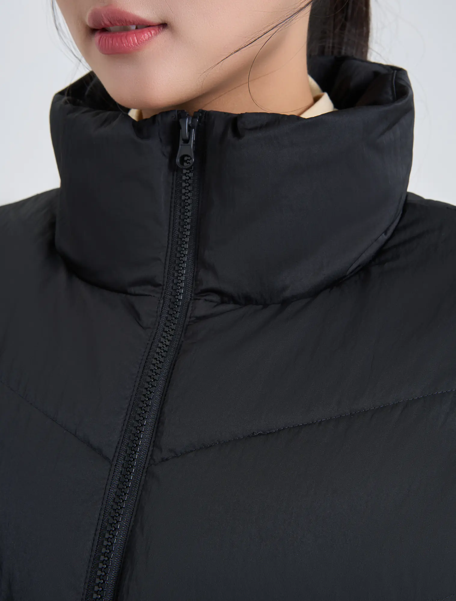 Áo khoác gilet bông thổi kéo khóa của nữ, chi tiết rút eo, có thể thay đổi kiểu mặc cho người sử dụng. Phù hợp với thời tiết lạnh sâu và có khả năng chống thấm nhẹ.