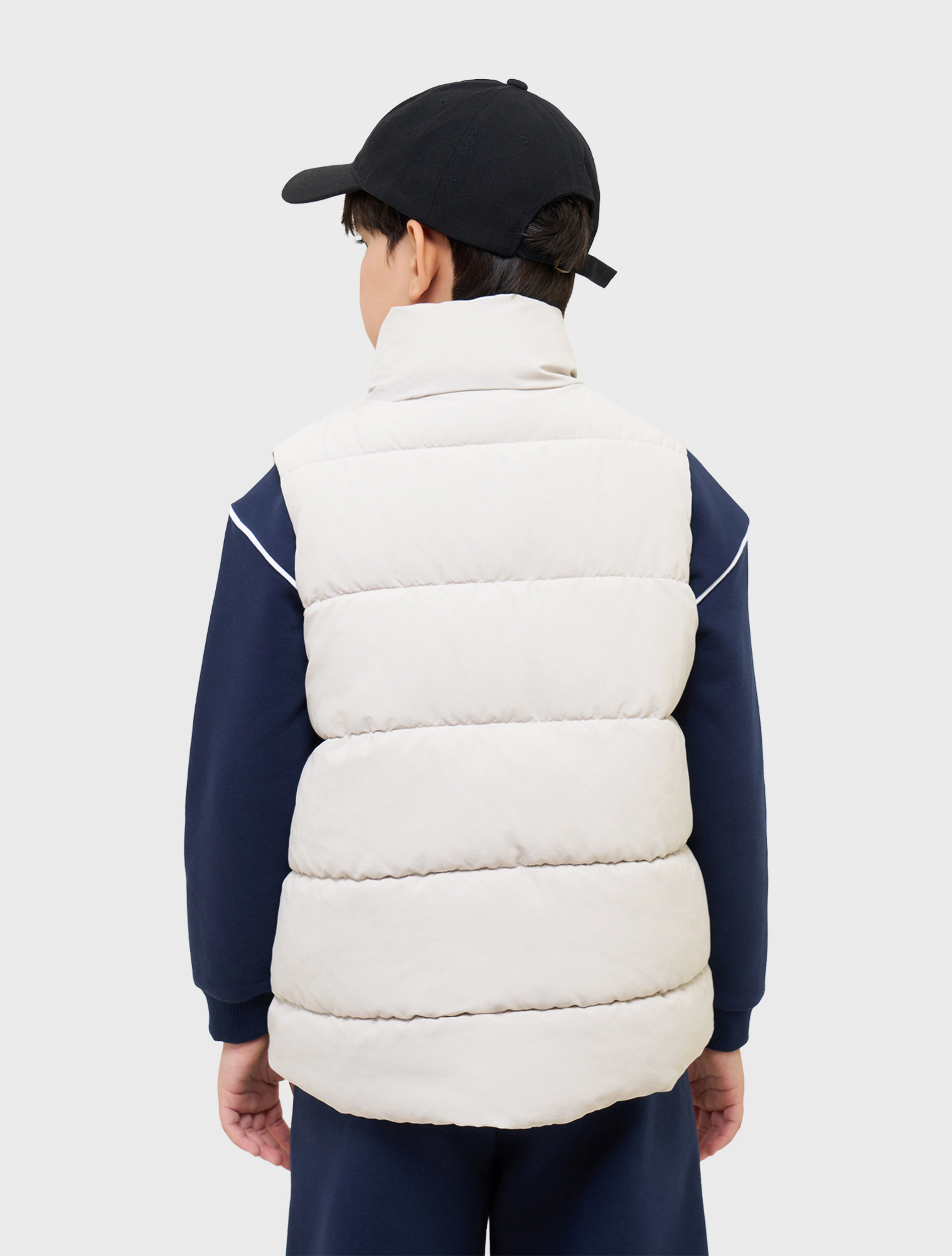 Áo gilet chất liệu vải đặc biệt chống thấm nước, có cổ cao, tay sát nách. Cài khóa kéo phía trước. Có hai túi kéo khóa phía trước, đính nhãn cao su trang trí ở bên.