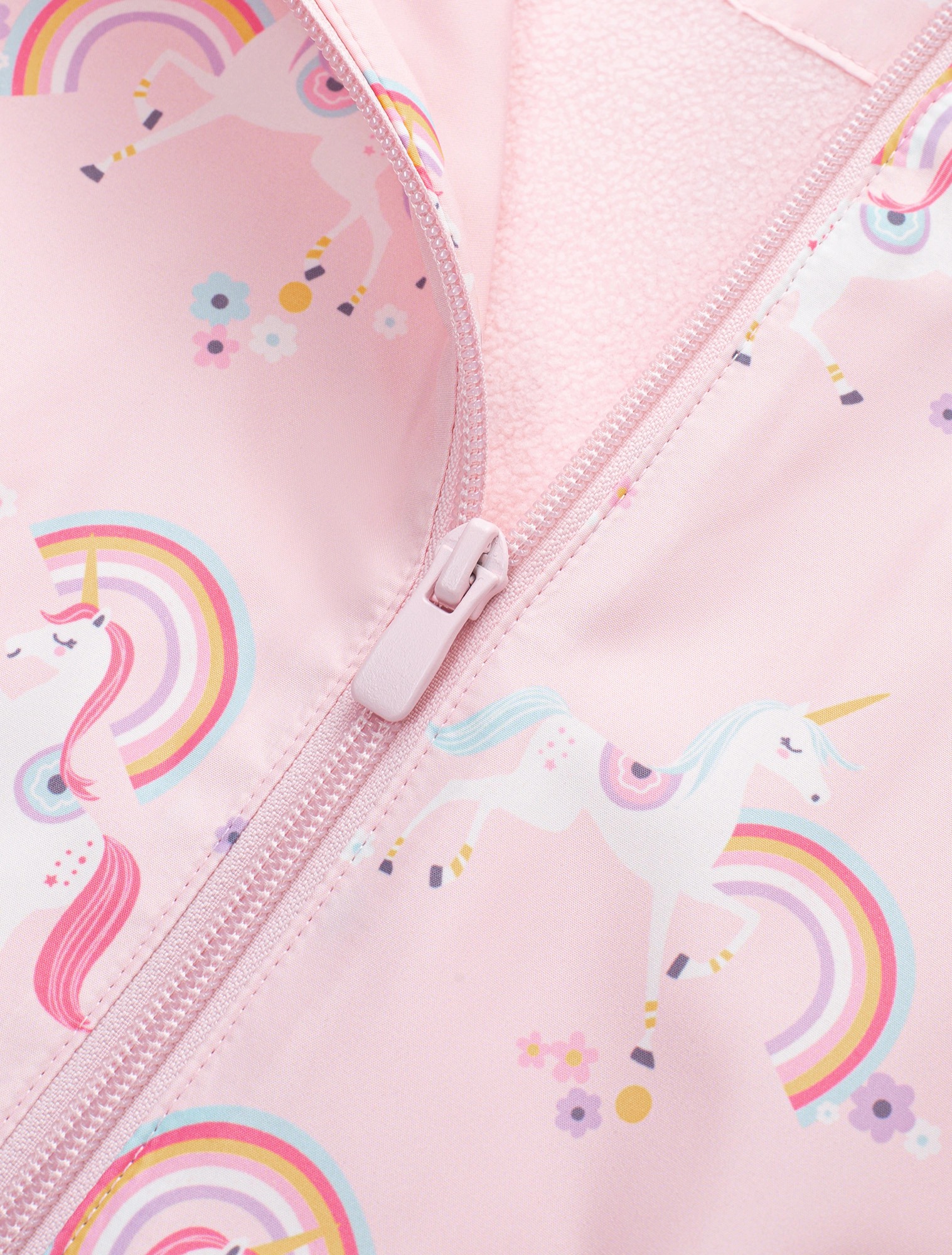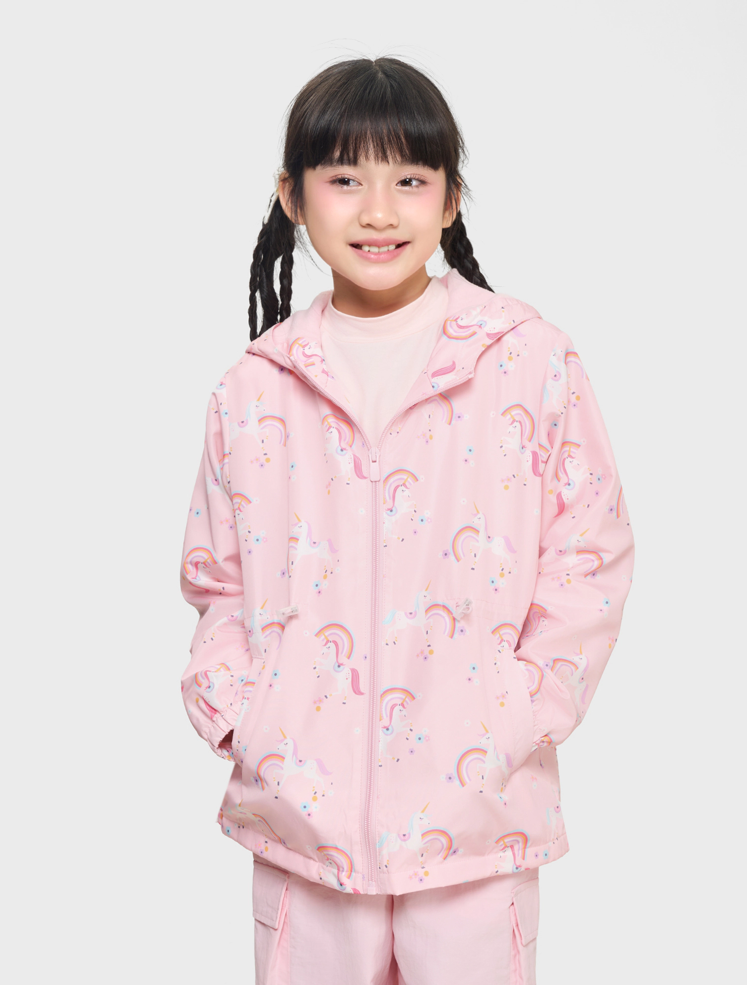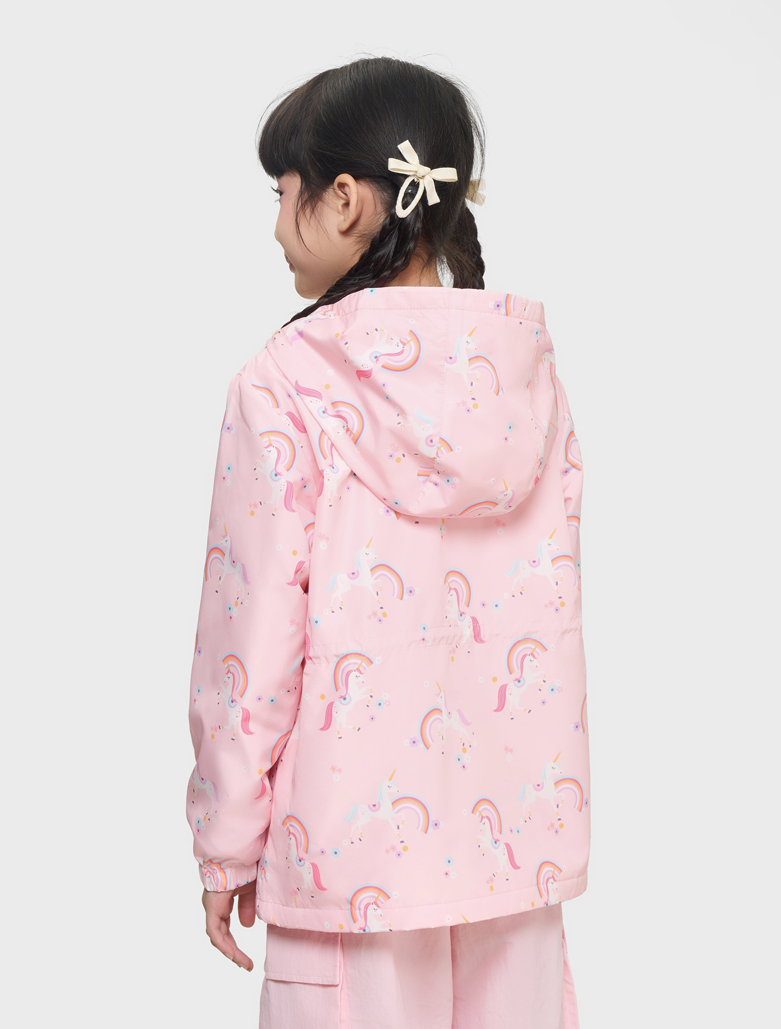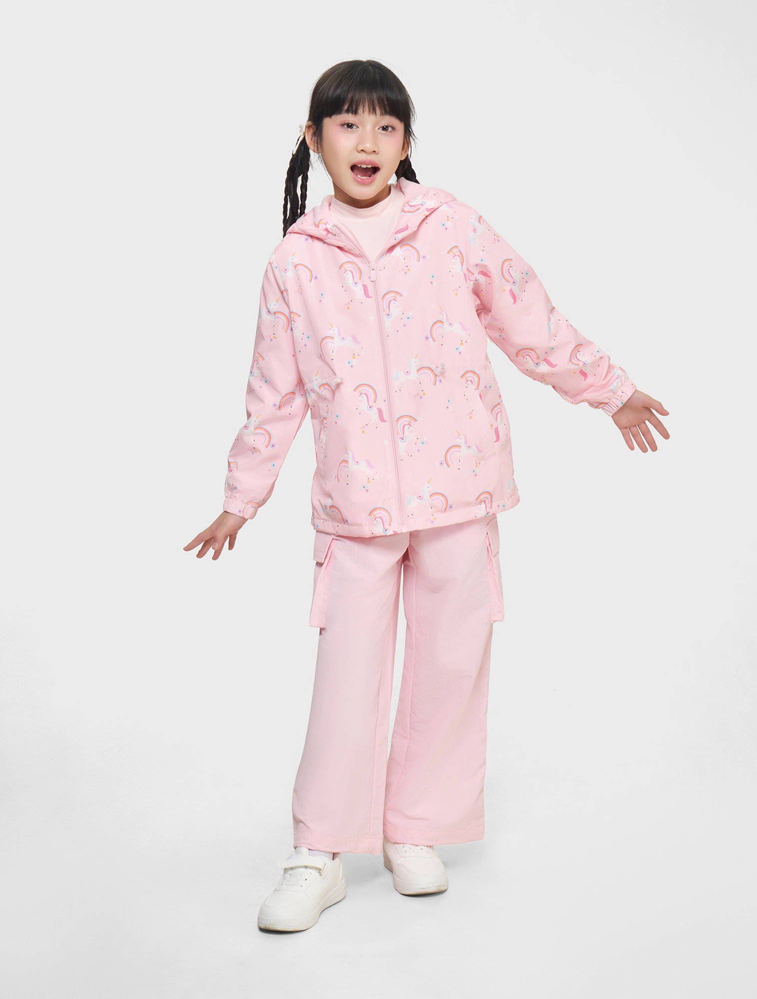 Áo khoác gió có mũ bé gái. Phom dáng cơ bản dễ mặc. Mặt trong lót nỉ ấm áp. Màu sắc tươi sáng, họa tiest dễ thương