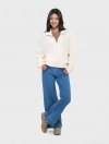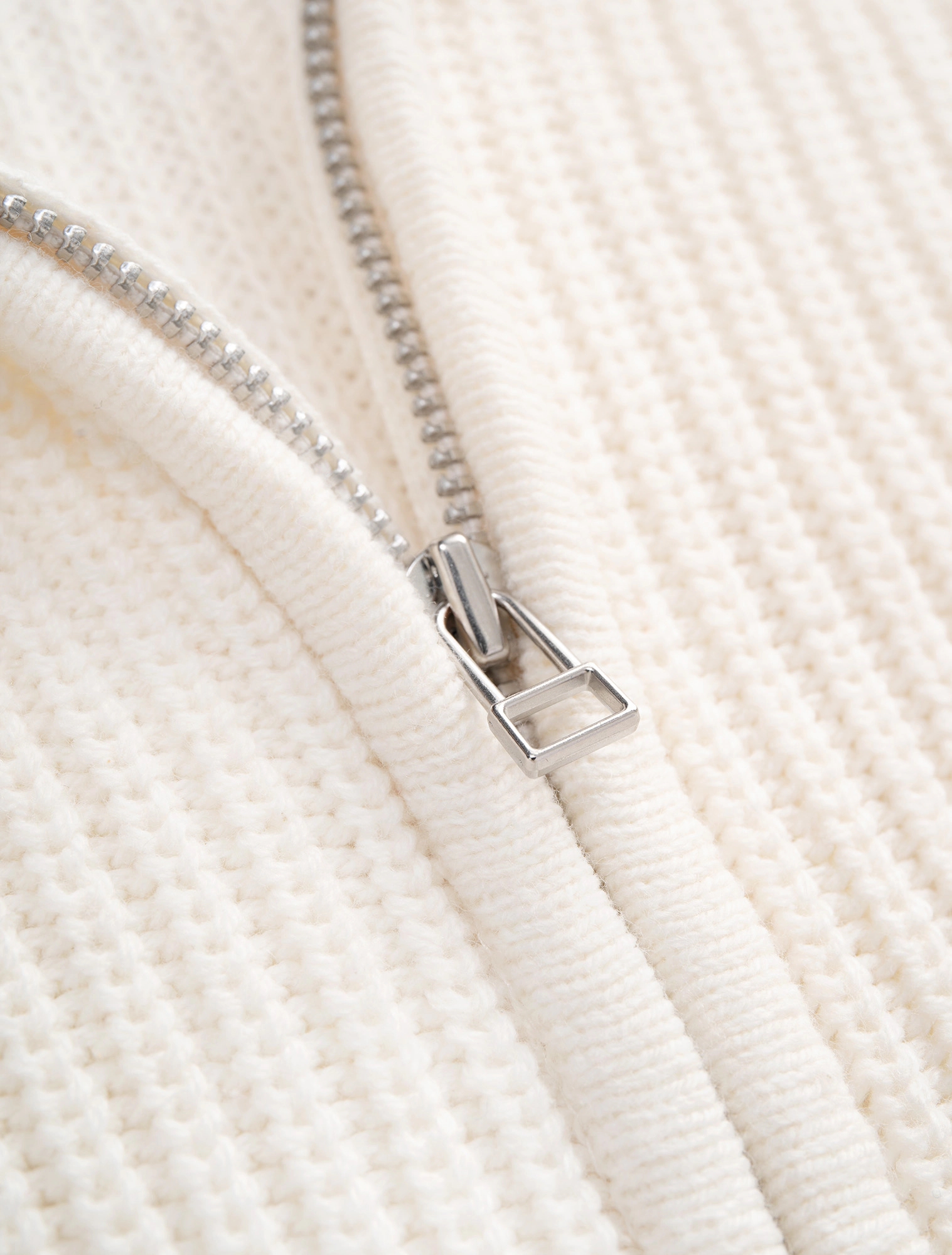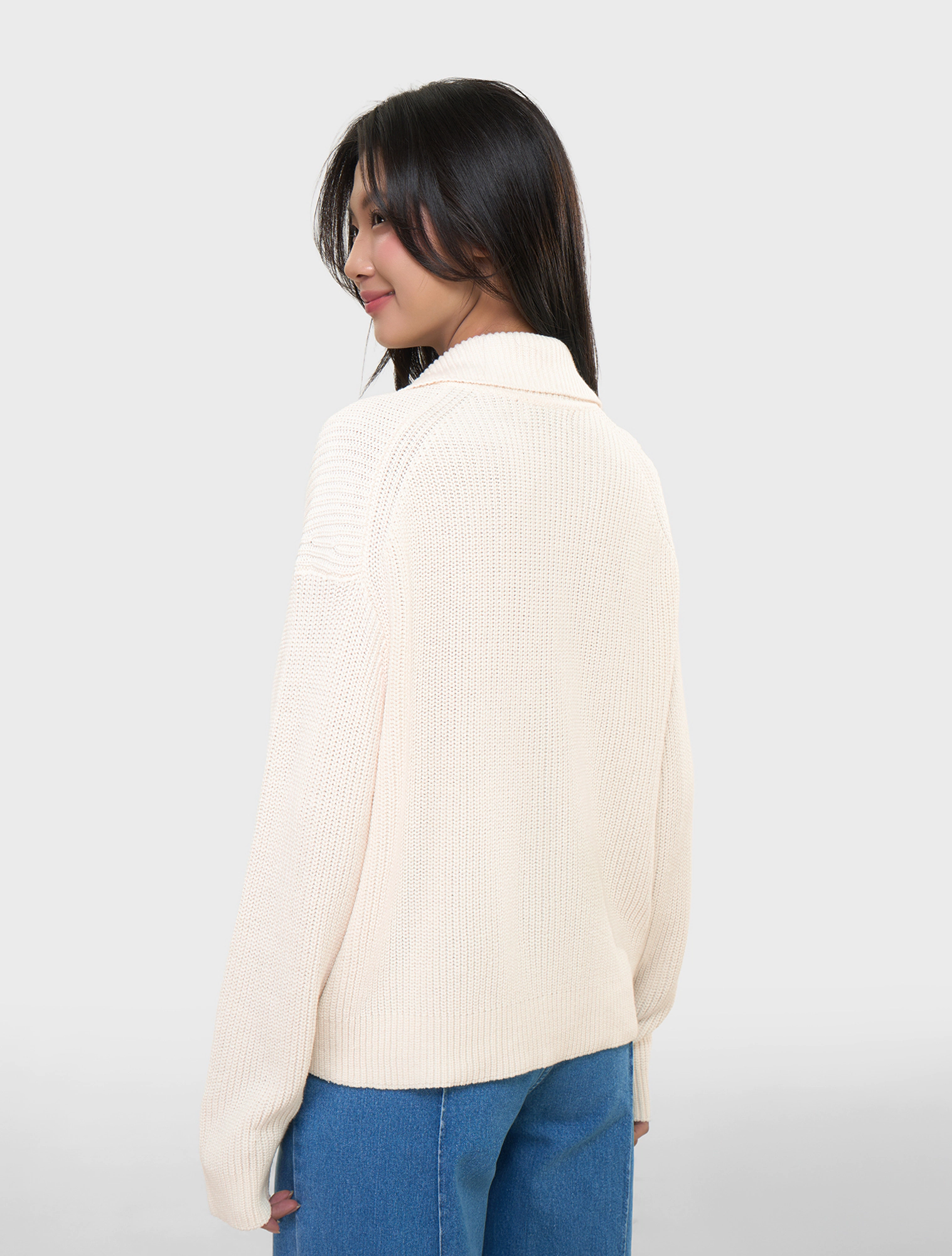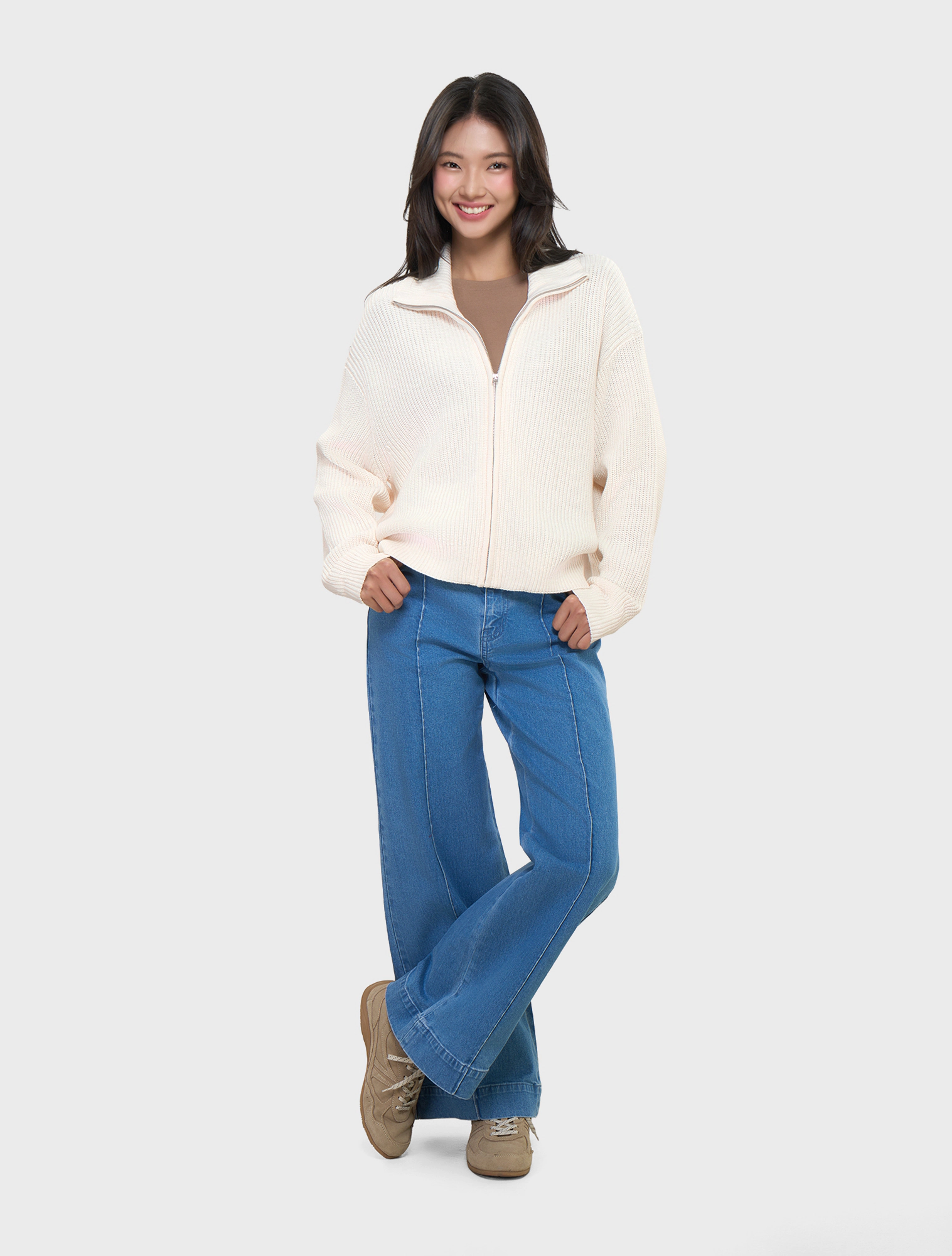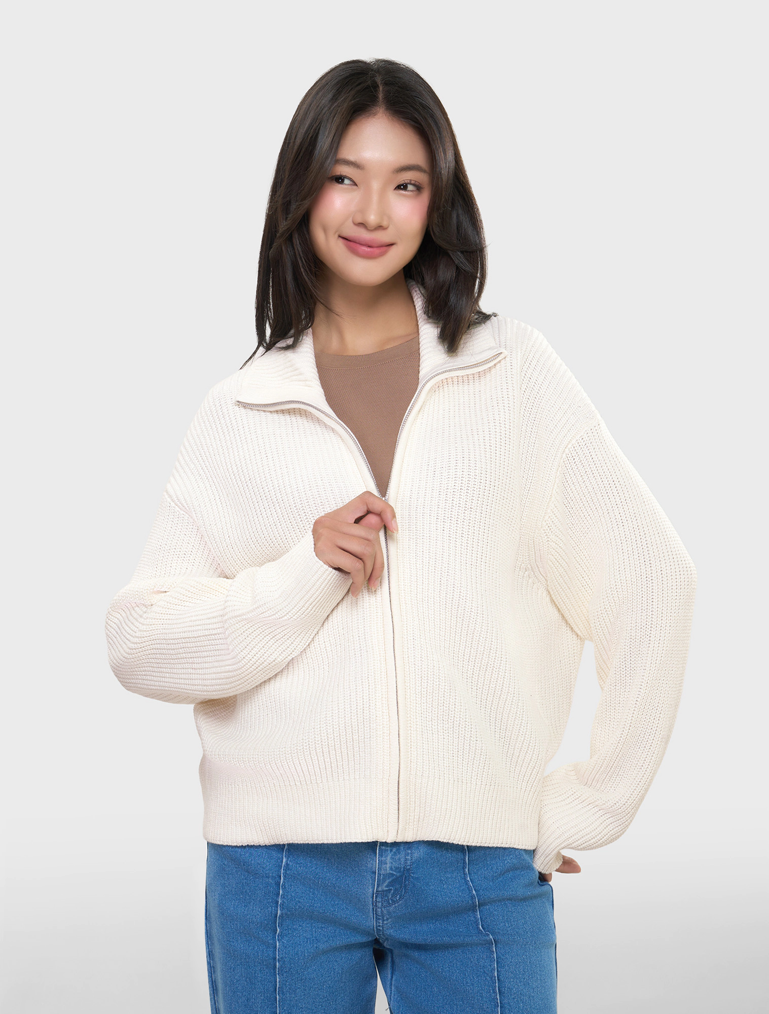 Áo khoác len nữ dài tay có khóa kéo. Dáng áo rộng vừa, chất liệu dệt len mềm mại, ấm áp. Hoàn cảnh sử dụng linh hoạt.