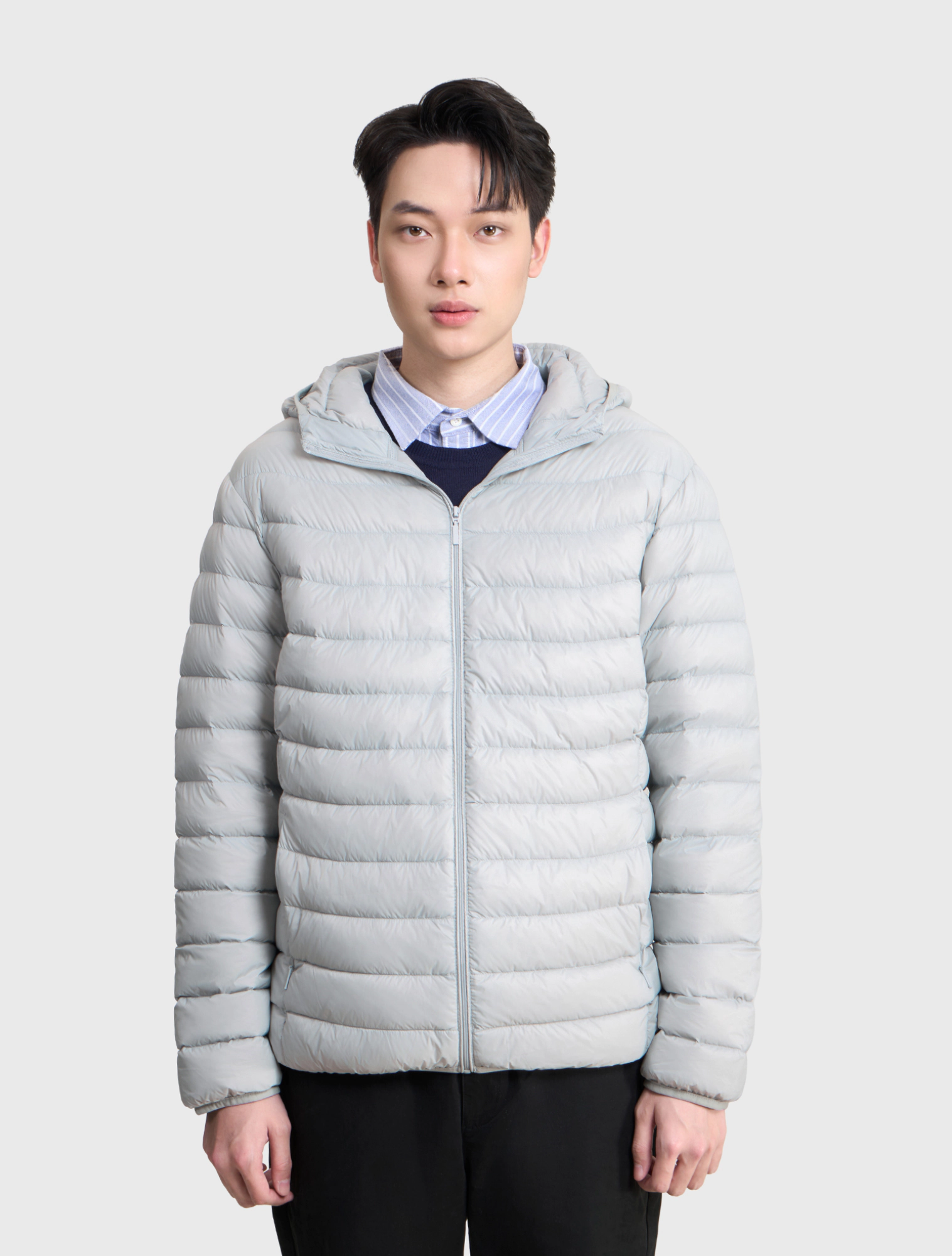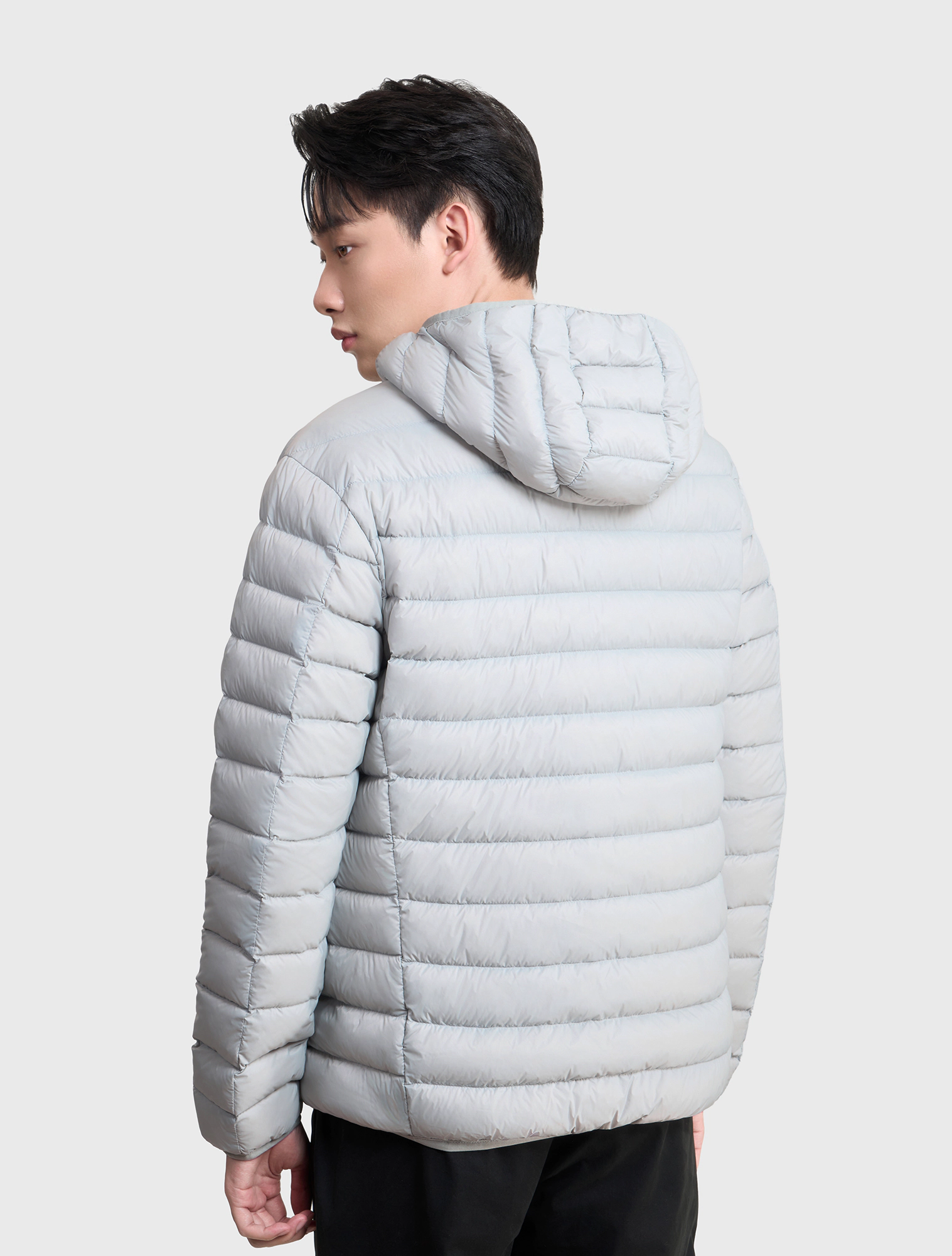Áo khoác lông vũ nam có mũ, chống thấm nước. Phần cửa tay và gấu thân bo chun kín tránh thoát nhiệt khi mặc.
