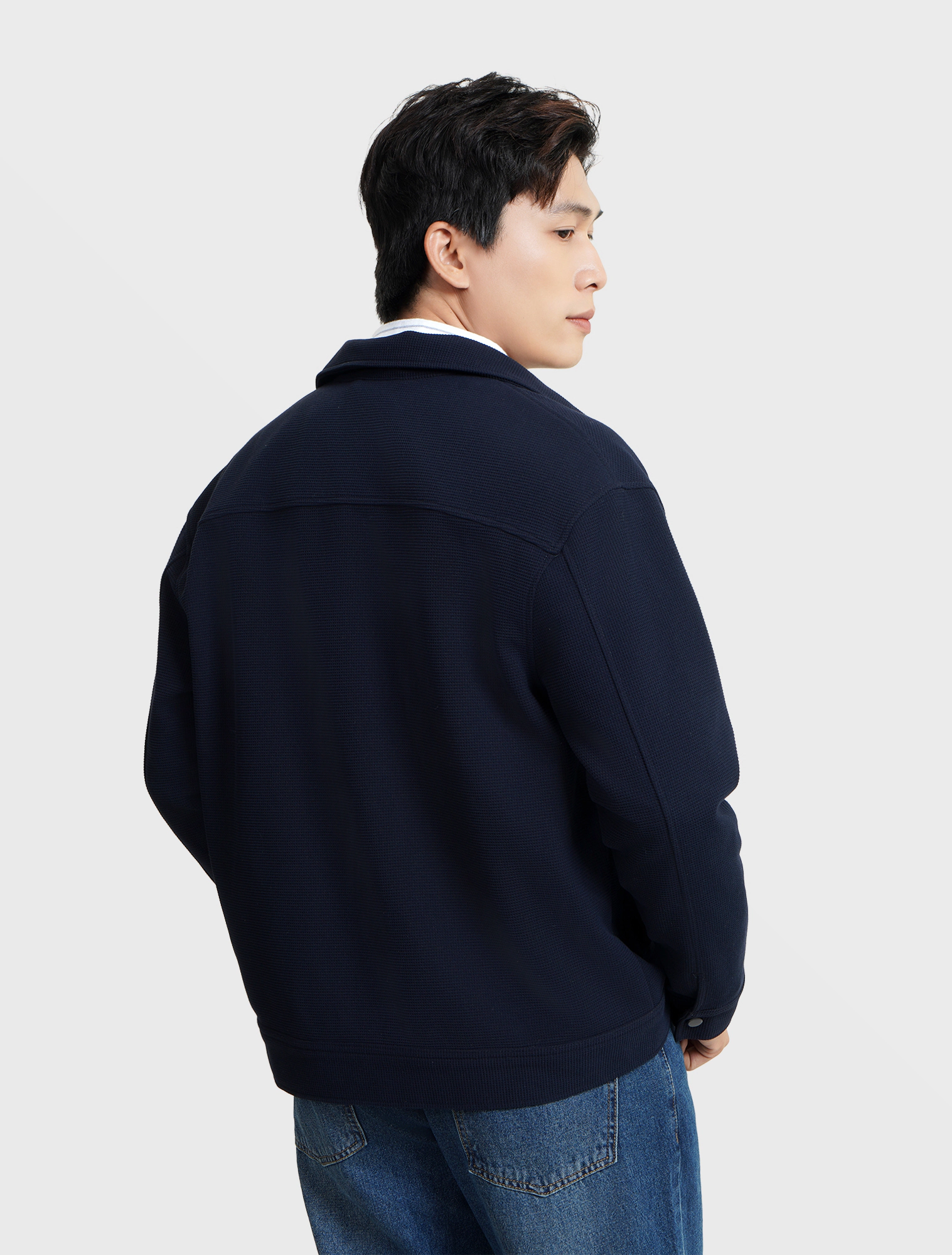 Áo khoác nam dệt kim bề mặt waffle với họa tiết tổ ong đặc trưng, mang lại cảm giác thoáng khí nhưng vẫn giữ ấm tốt. Chất liệu mềm mại, co giãn nhẹ, phom gọn gàng dễ mặc. Thiết kế tối giản và hiện đại, phù hợp cho cả đi làm lẫn dạo phố.