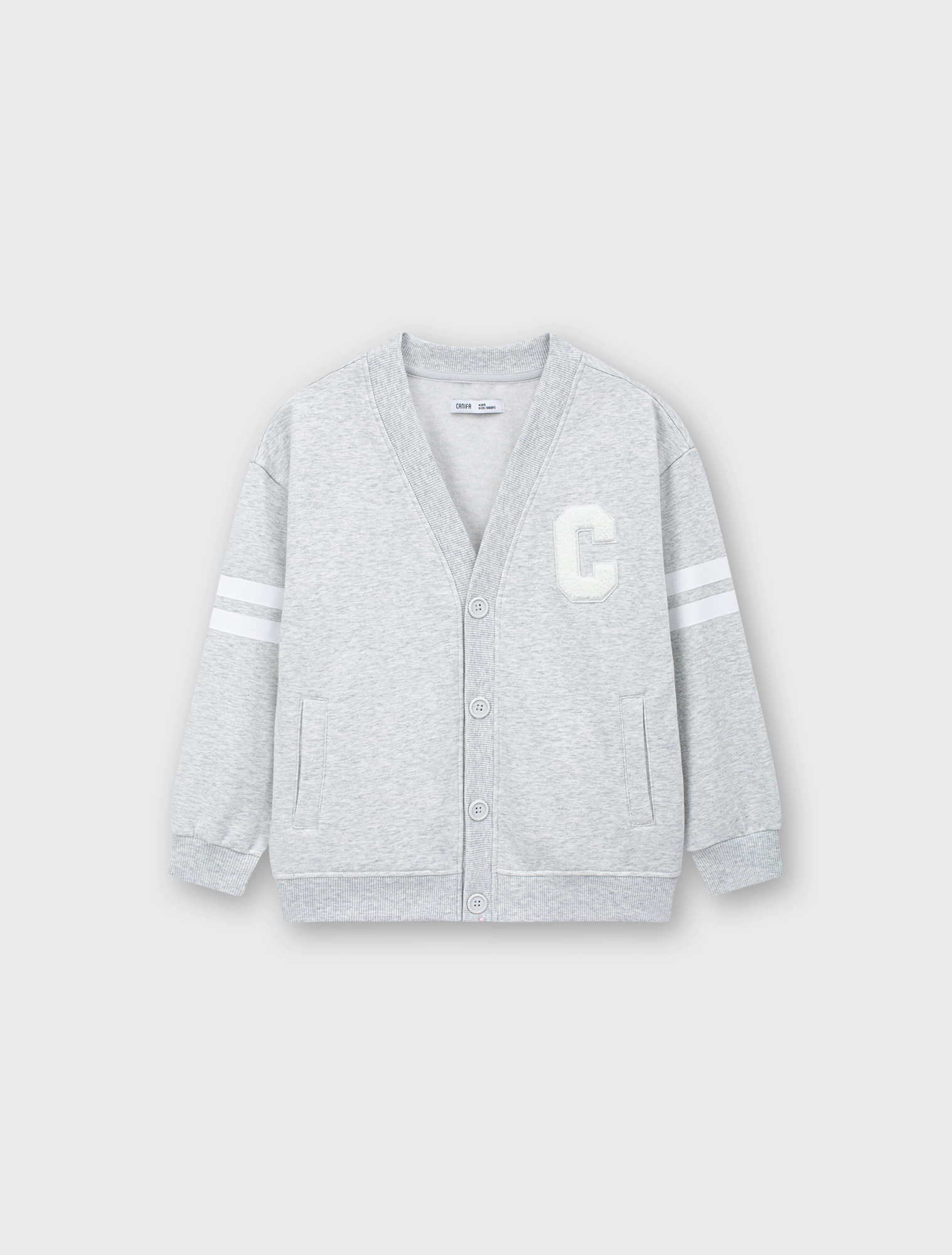 Áo khoác bé trai cadigan cài cúc trước. Tay dài hình in thêu trẻ trung. Gấu và cửa tay bo.