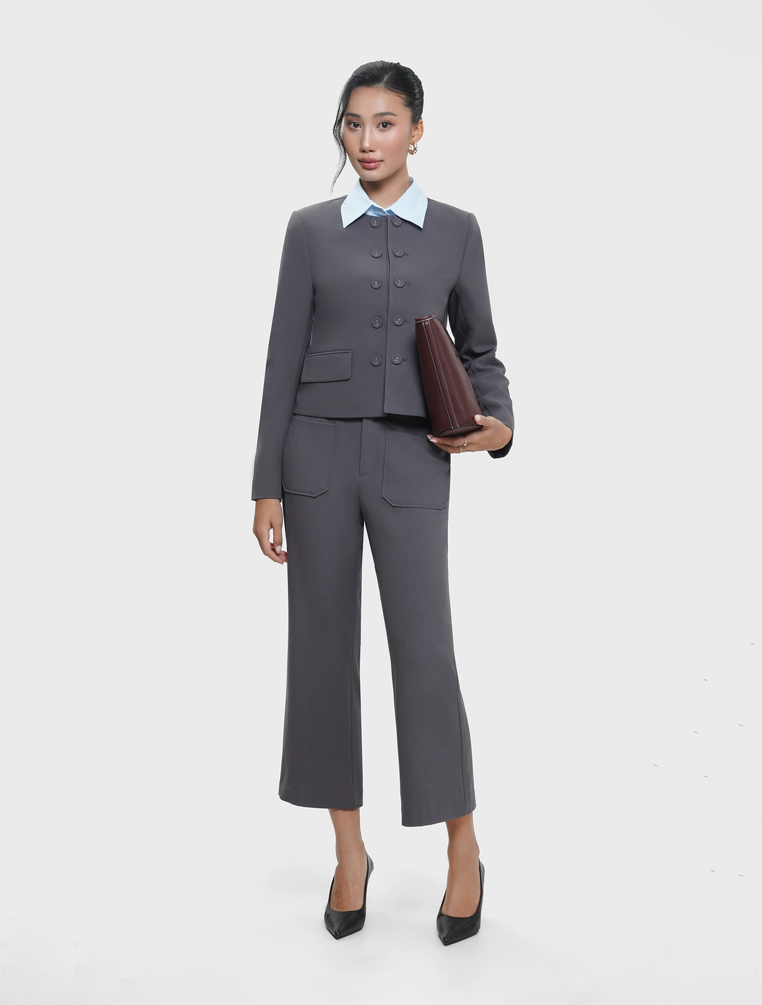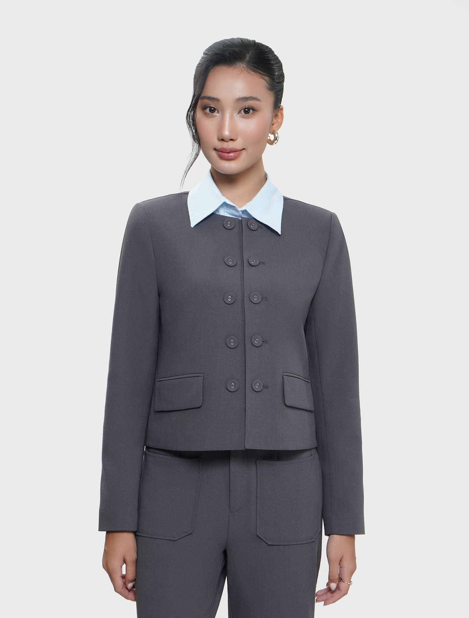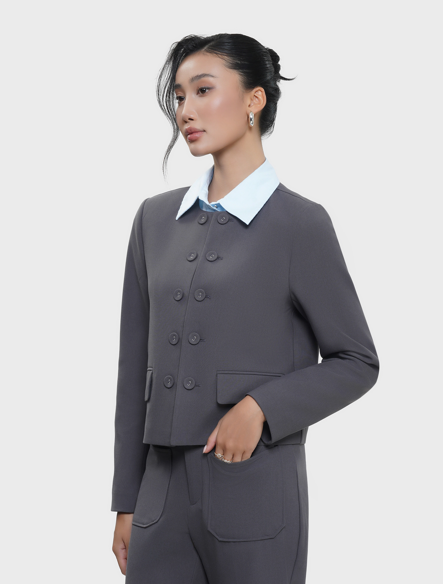 Áo khoác nữ 2 lớp cổ tròn dáng ngắn, rộng vừa, hai hàng cúc. Chất liệu mềm mại, dễ chịu, phù hợp môi trường công sở, dạo phố.