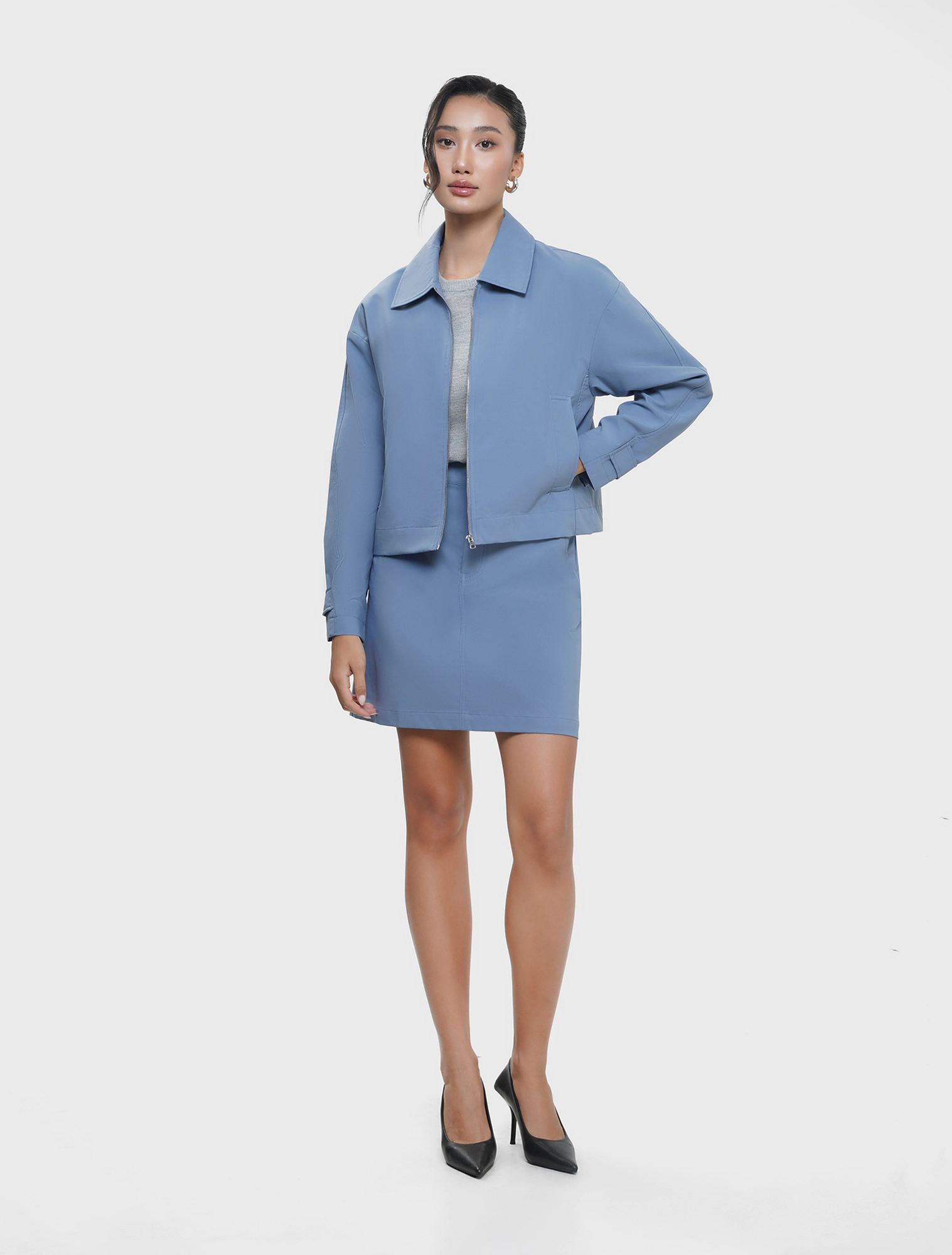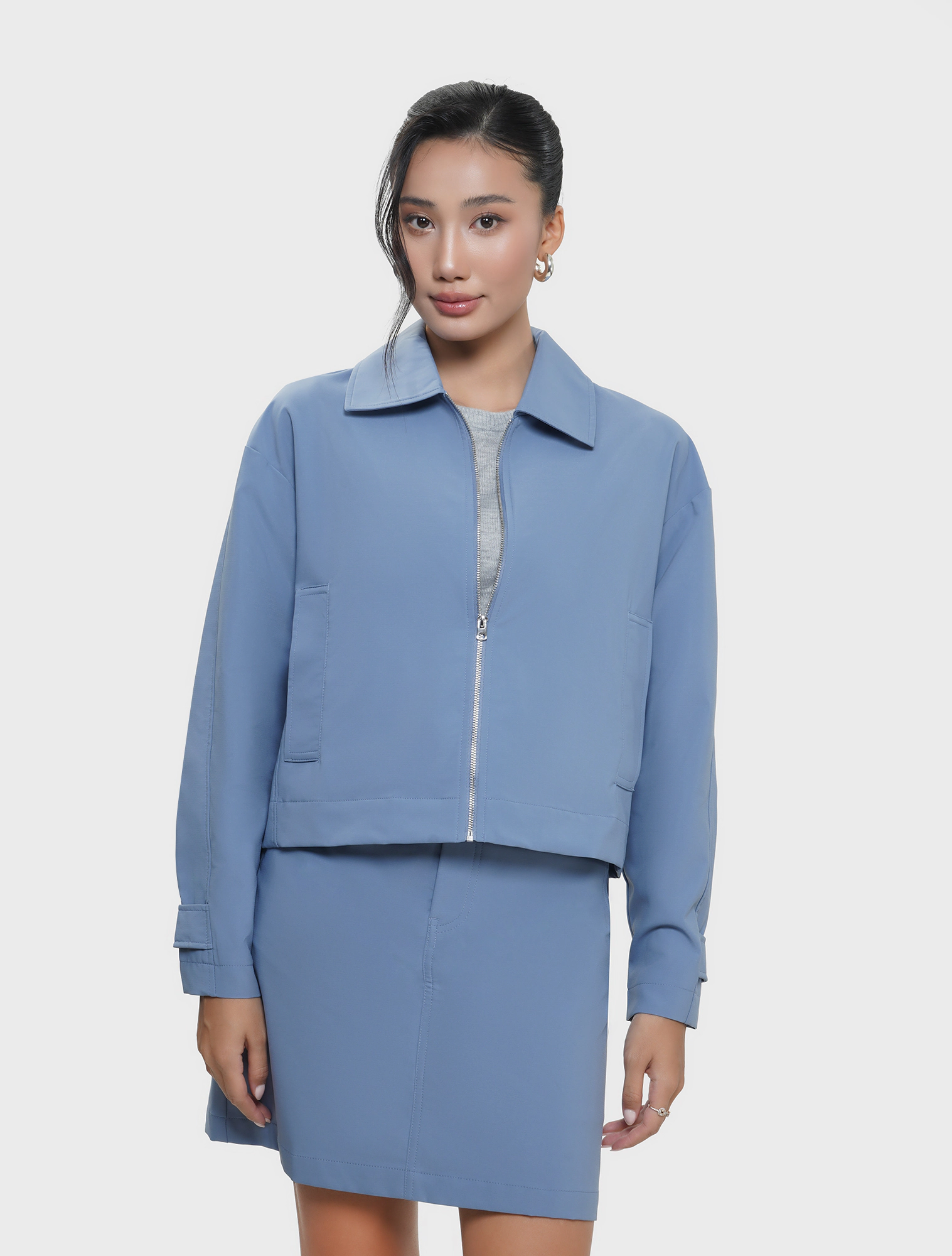 Áo khoác hai lớp dài tay, cổ bẻ, dáng suông. Chất liệu polyester thoải mái, phù hợp với thời tiết lạnh, mưa nhẹ.