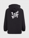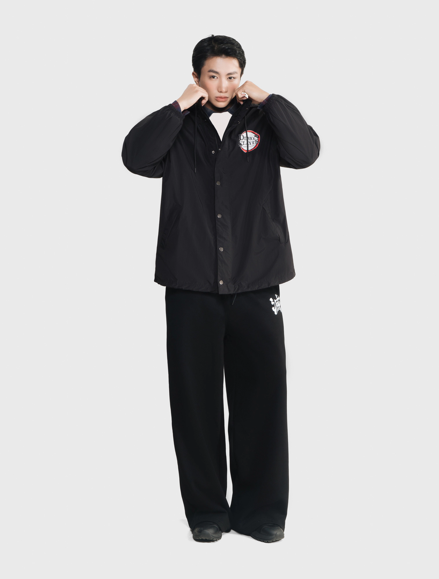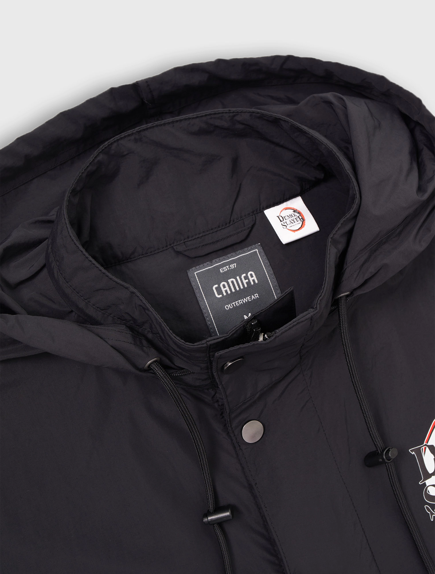 Áo khoác gió unisex người lớn. Phom áo relax thoải mái, hiện đại. Mũ áo có thể gấp gọn nhét vào cổ áo. Áo màu đen, hình in Demon Slayer thời trang, phù hợp cả nam và nữ.