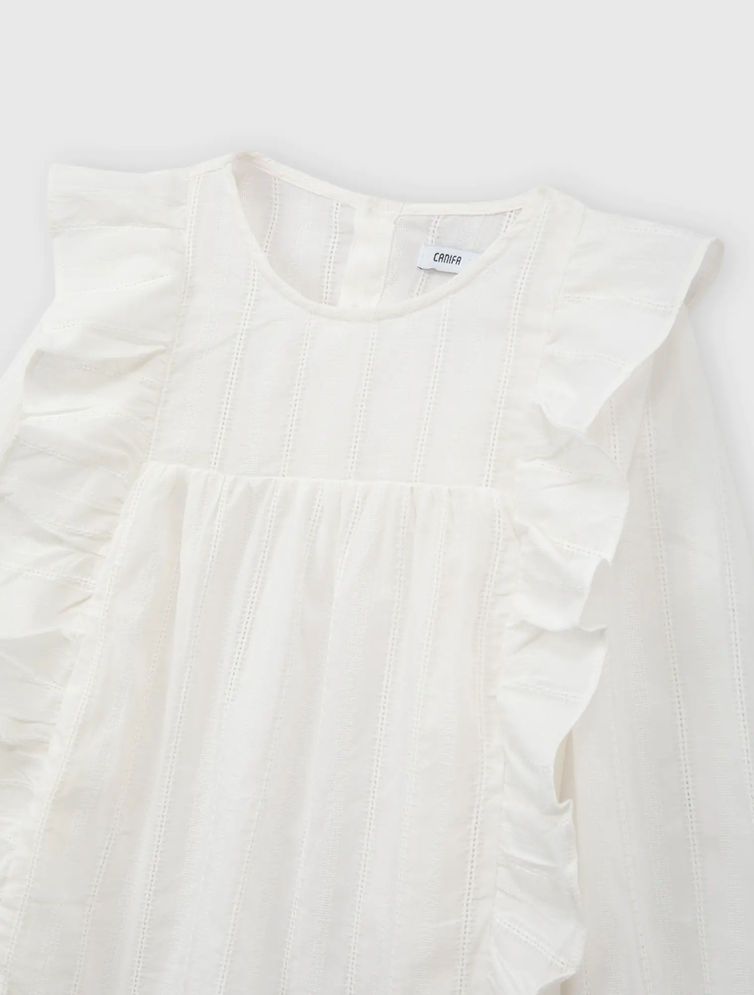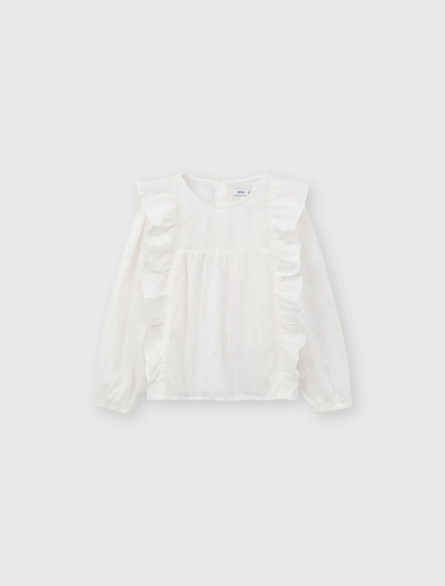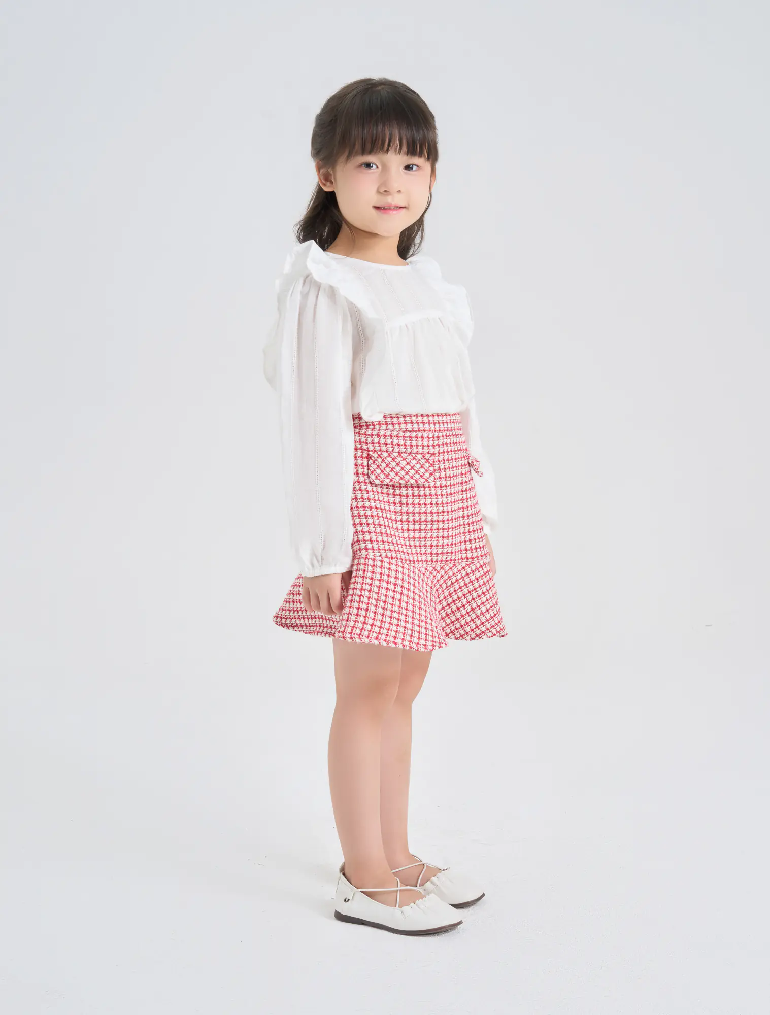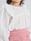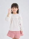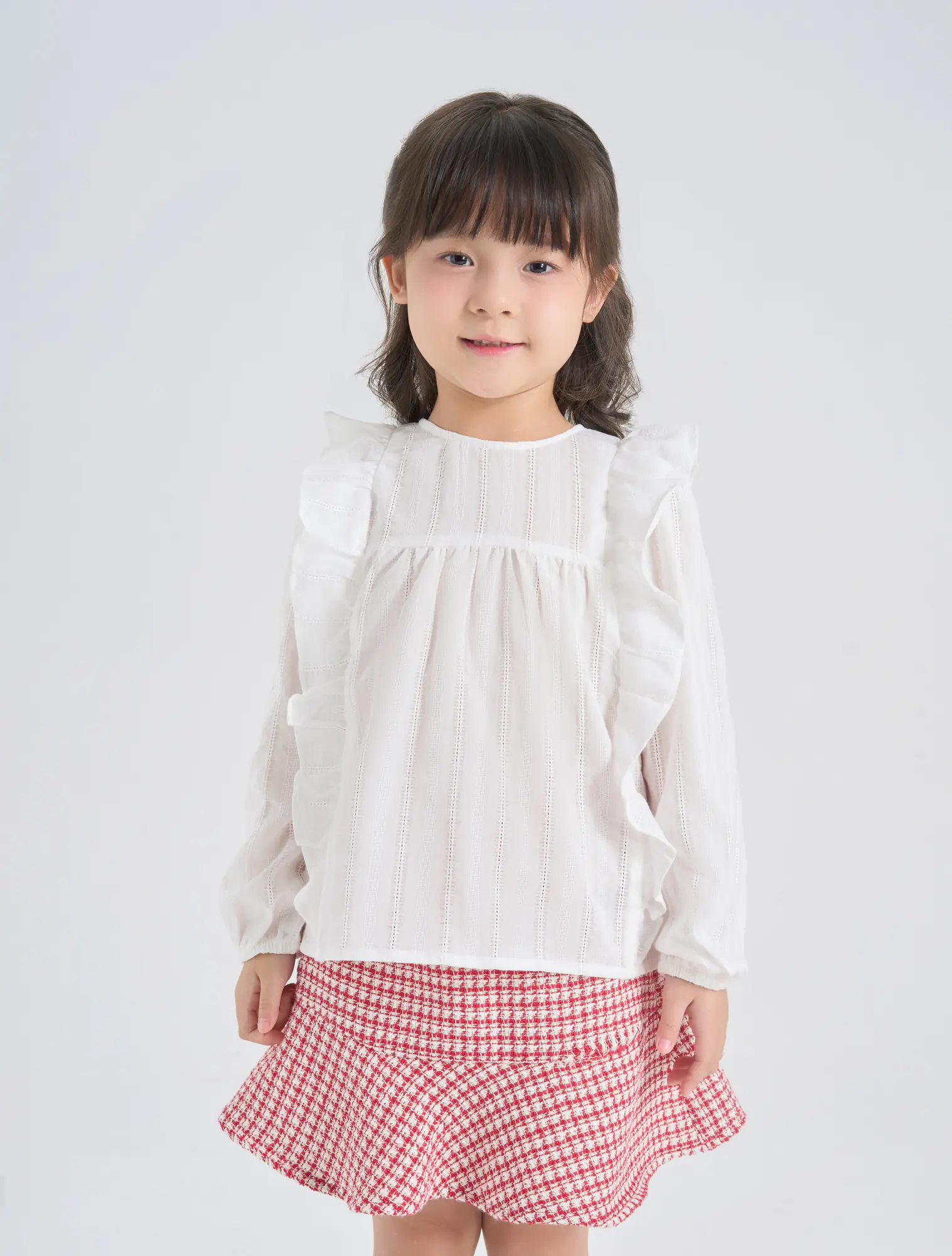 Áo kiểu bé gái phối bèo trước ngực tạo sự nữ tính, phù hợp phối với nhiều loại trang phục cho bé gái.