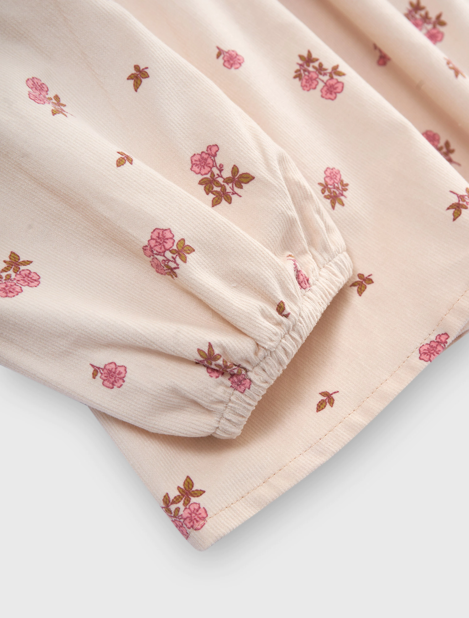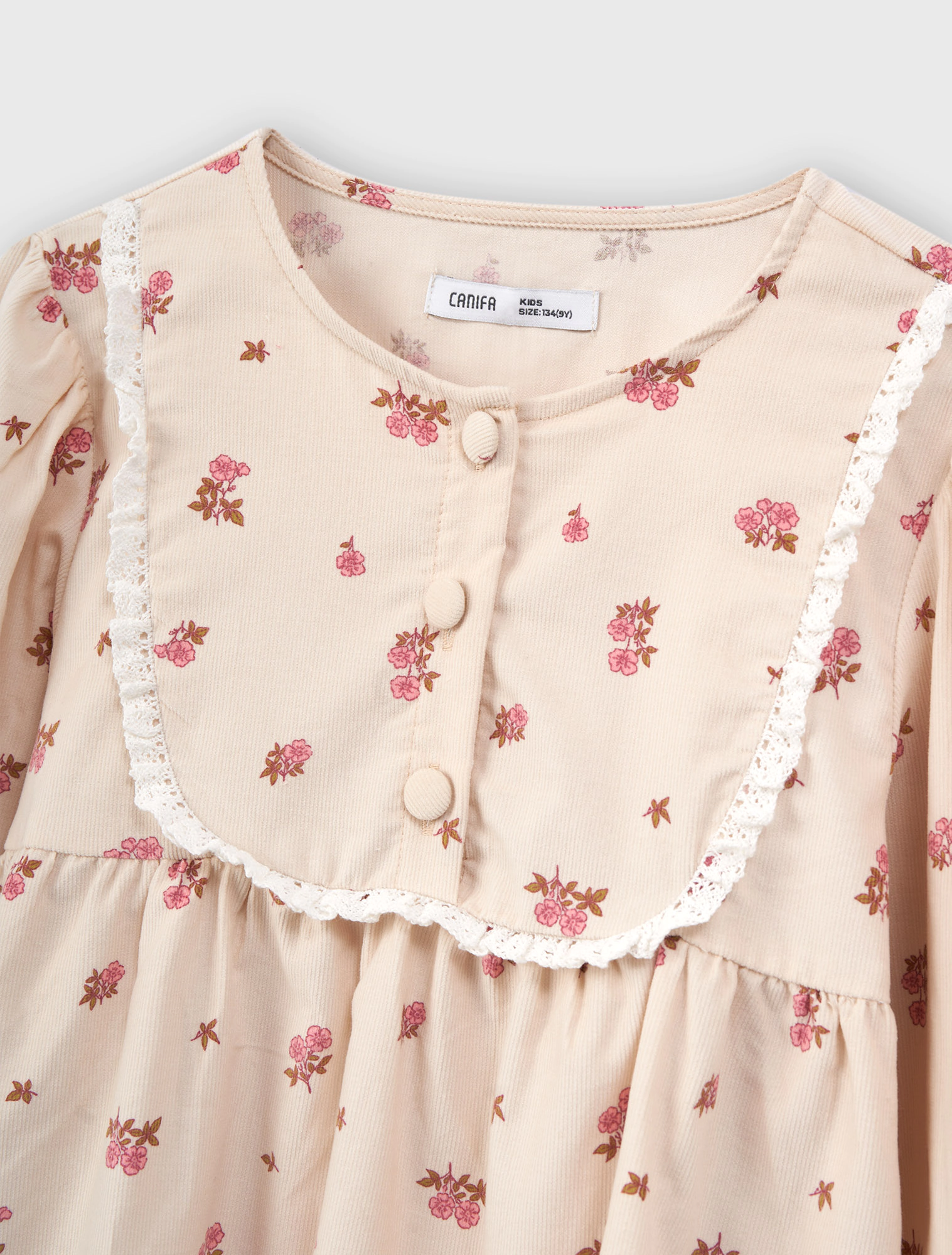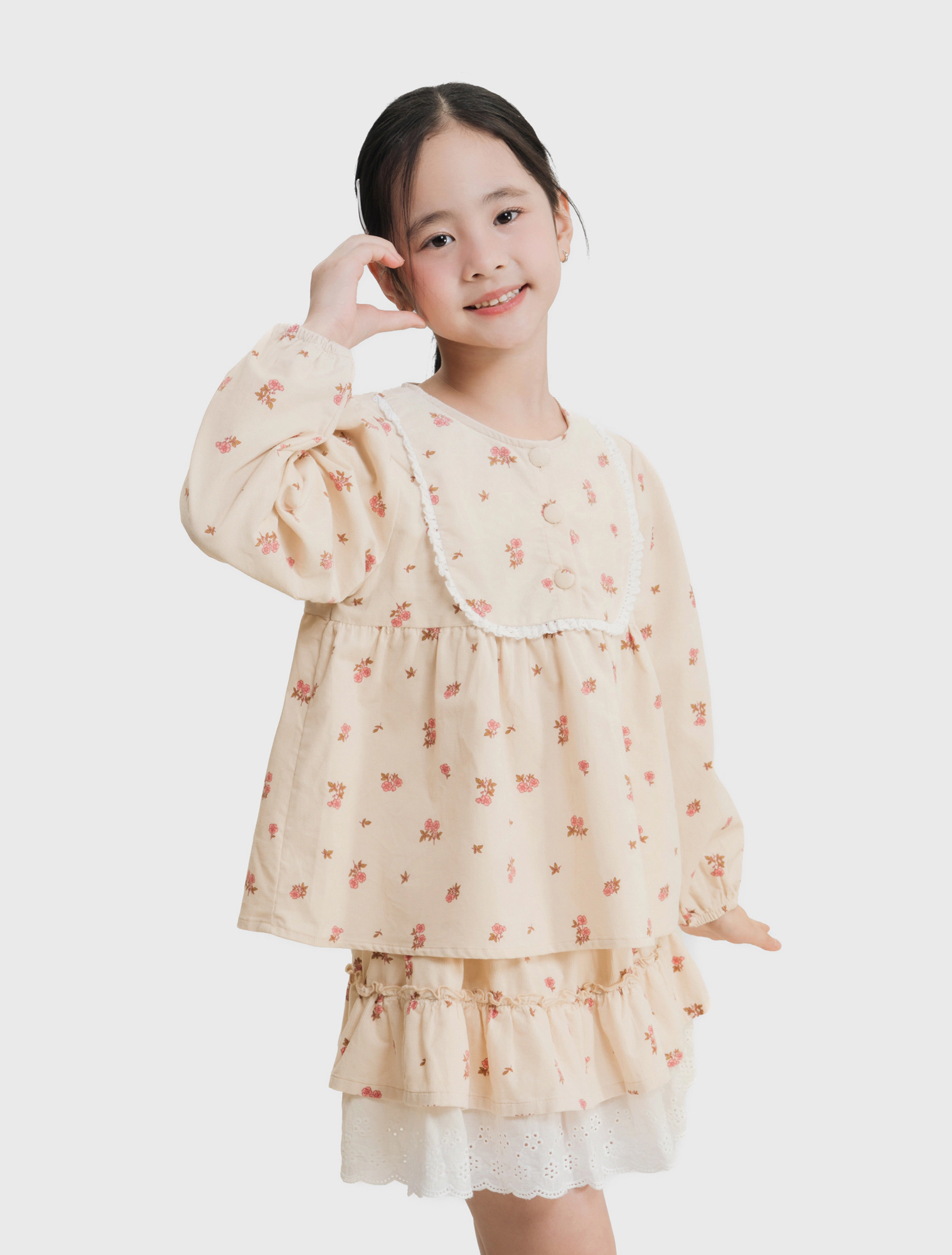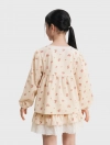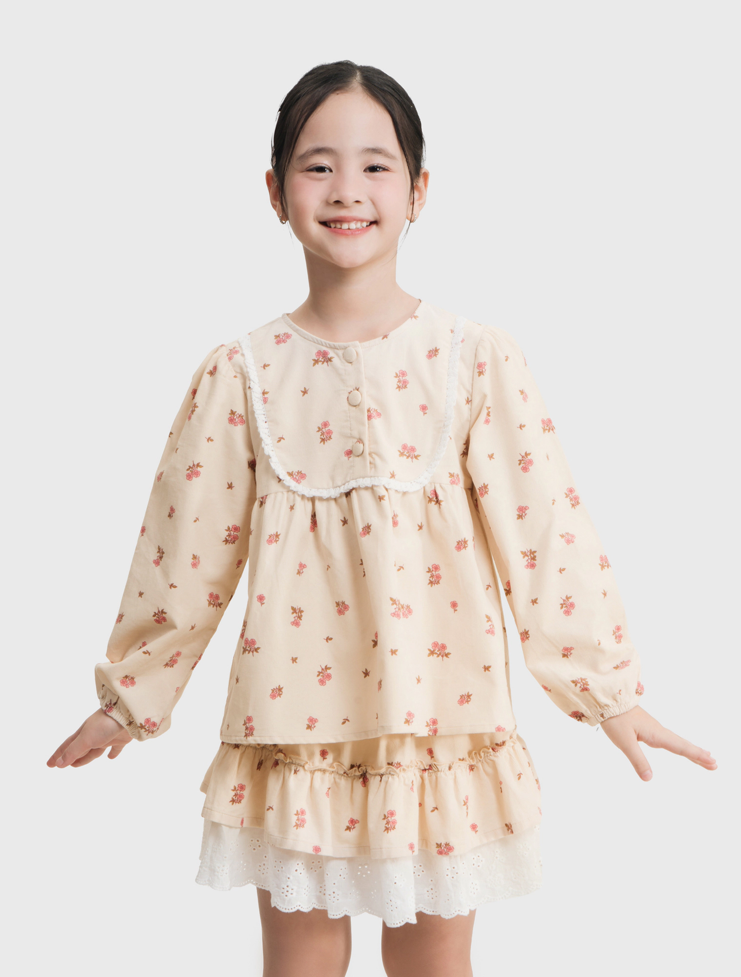 Áo kiểu bé gái hoạ tiết, có chi tiết ren ở ngực mang đến sự nữ tính.