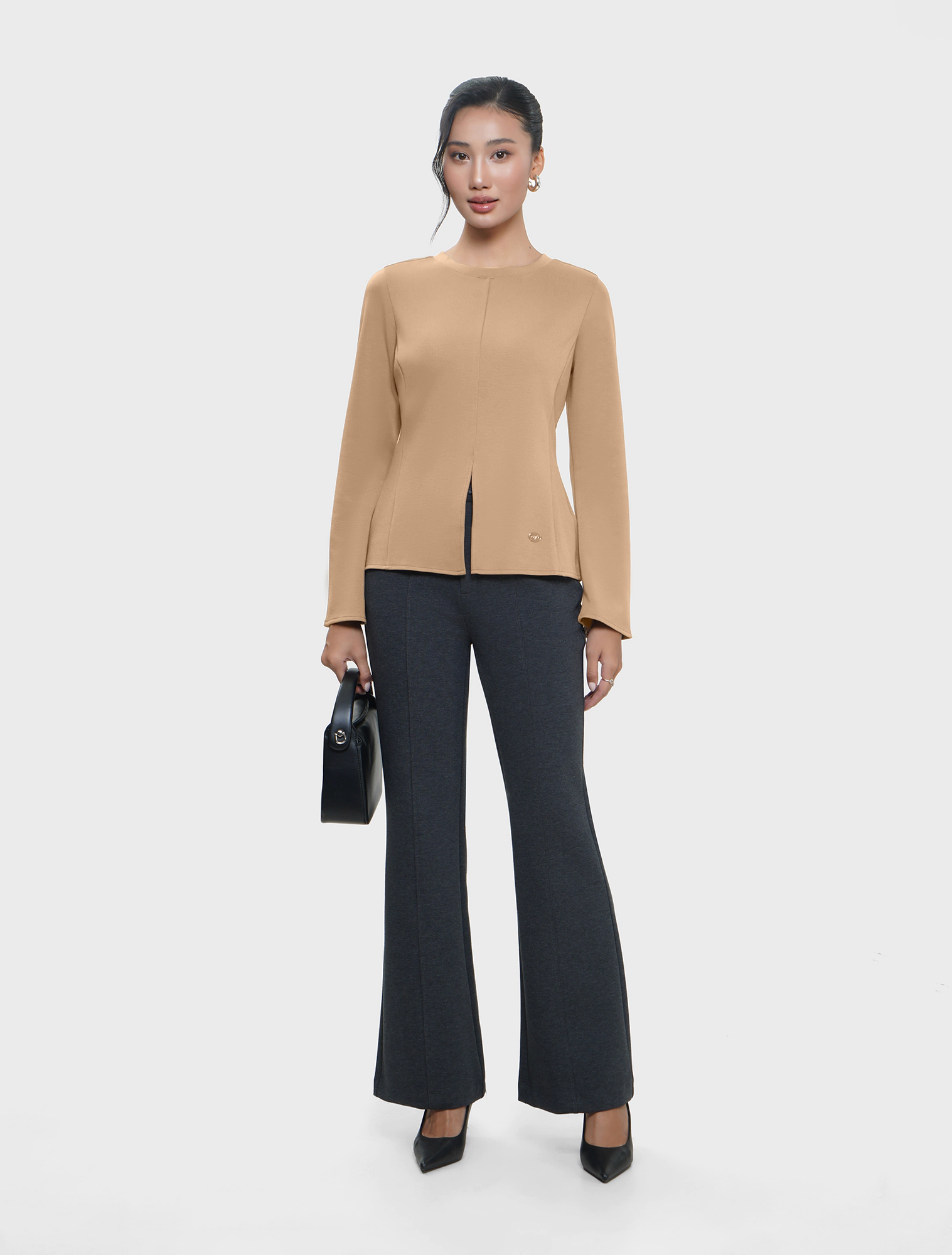Áo kiểu nữ dài tay, tay hơi loe nhẹ, cổ tròn.