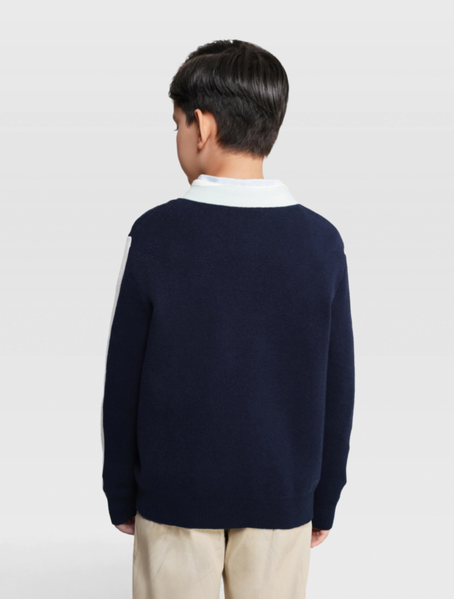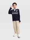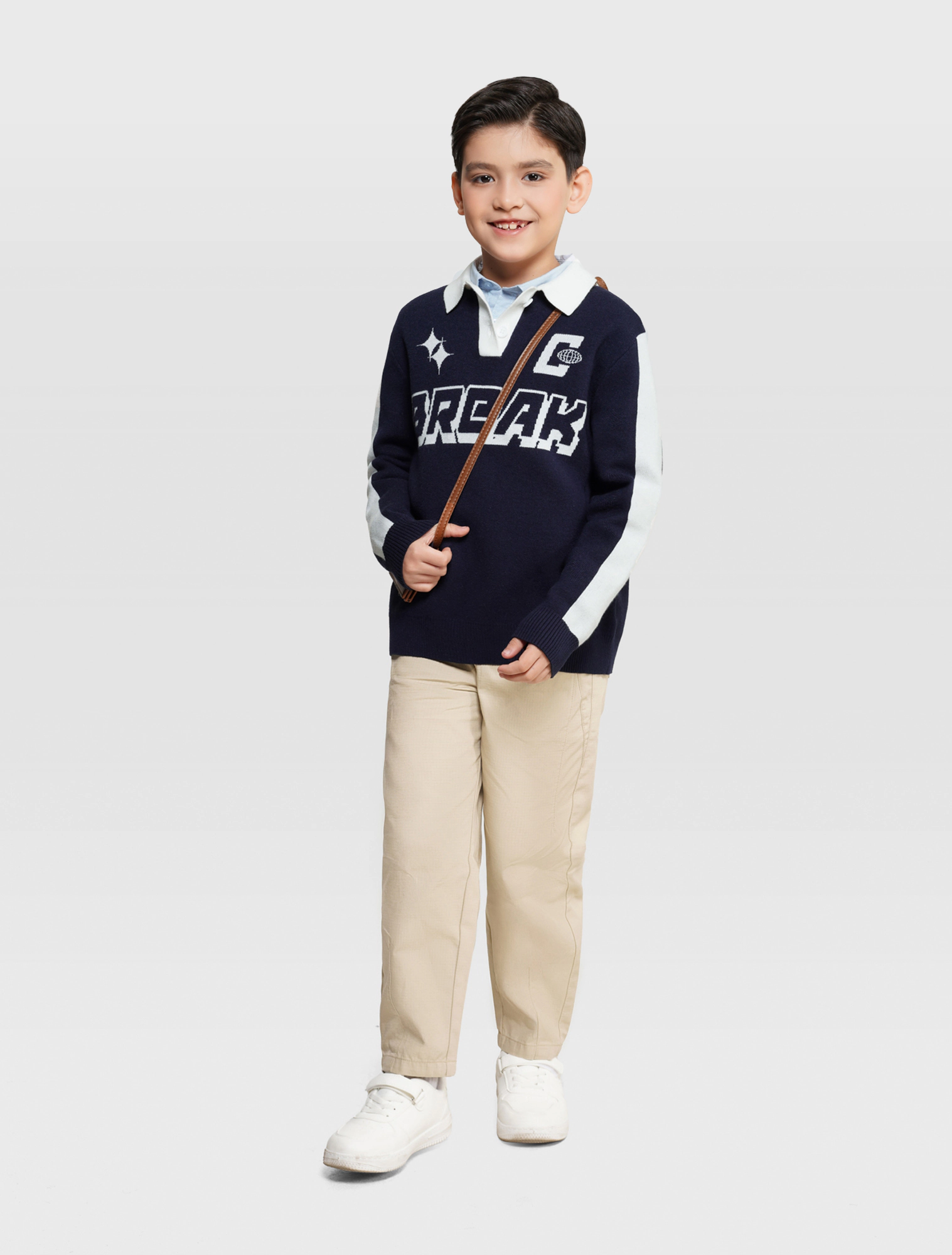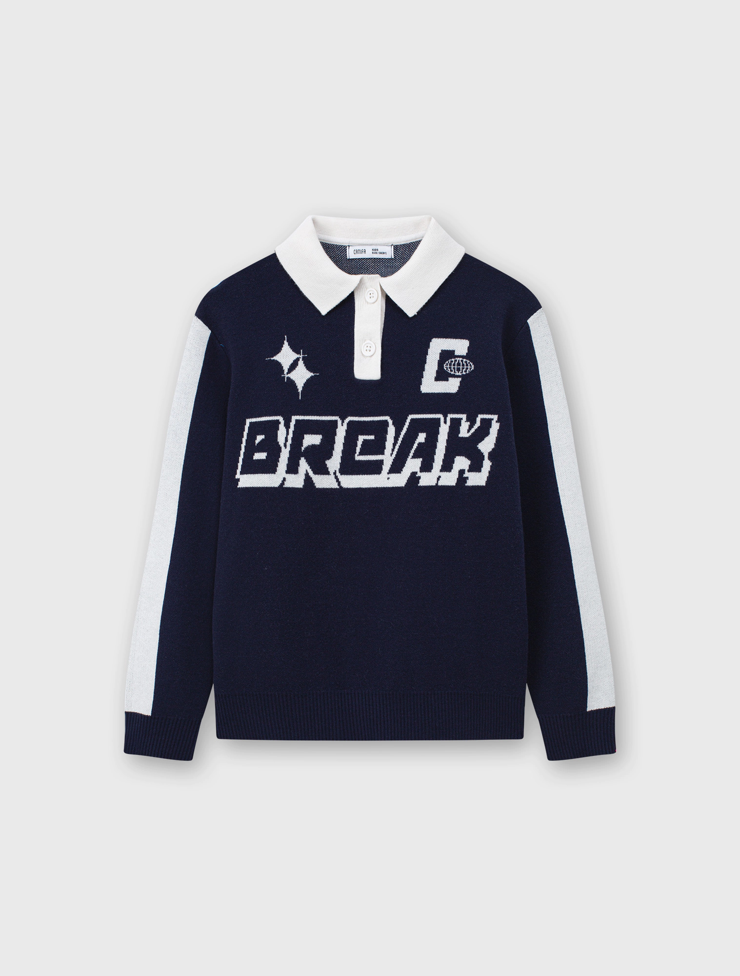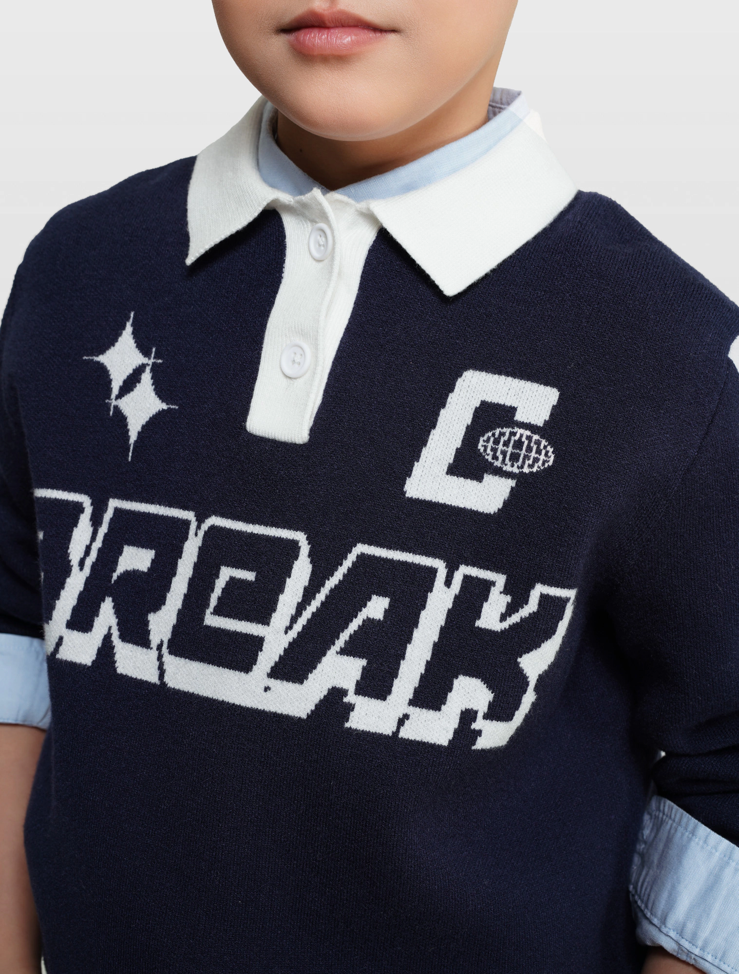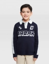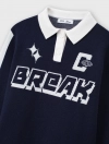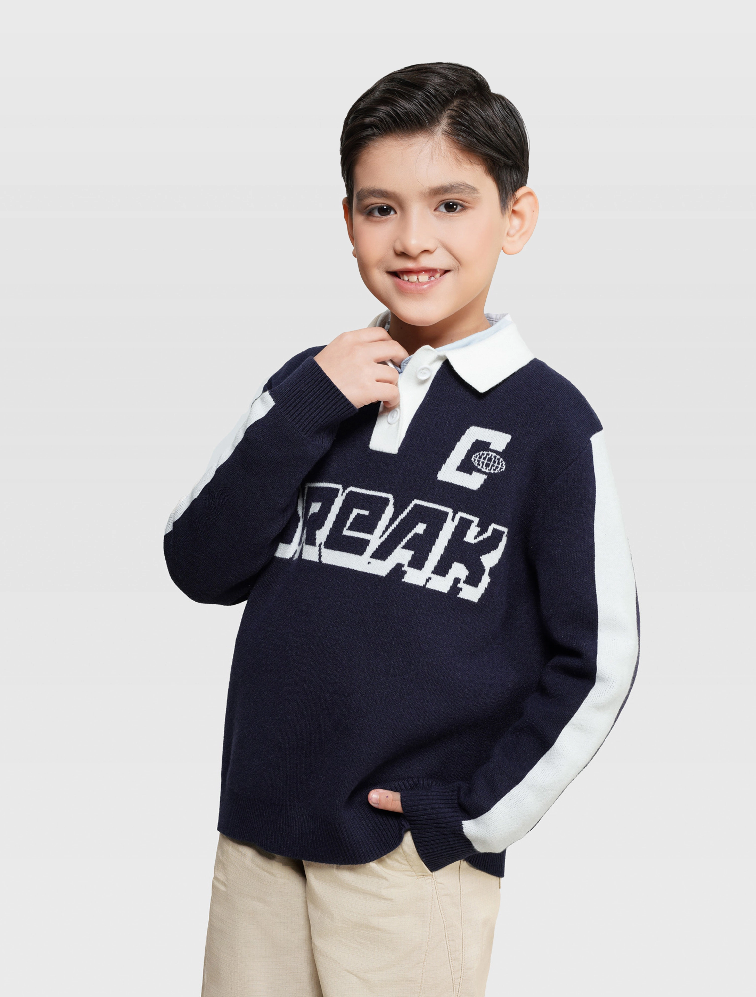 Áo len bé trai cổ polo mix màu, phom dáng relax thoải mái, hình dệt chữ nổi bật khỏe khoắn theo phong cách sport tạo sự lựa chọn mới cho dàng sợi của các bé