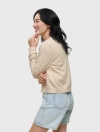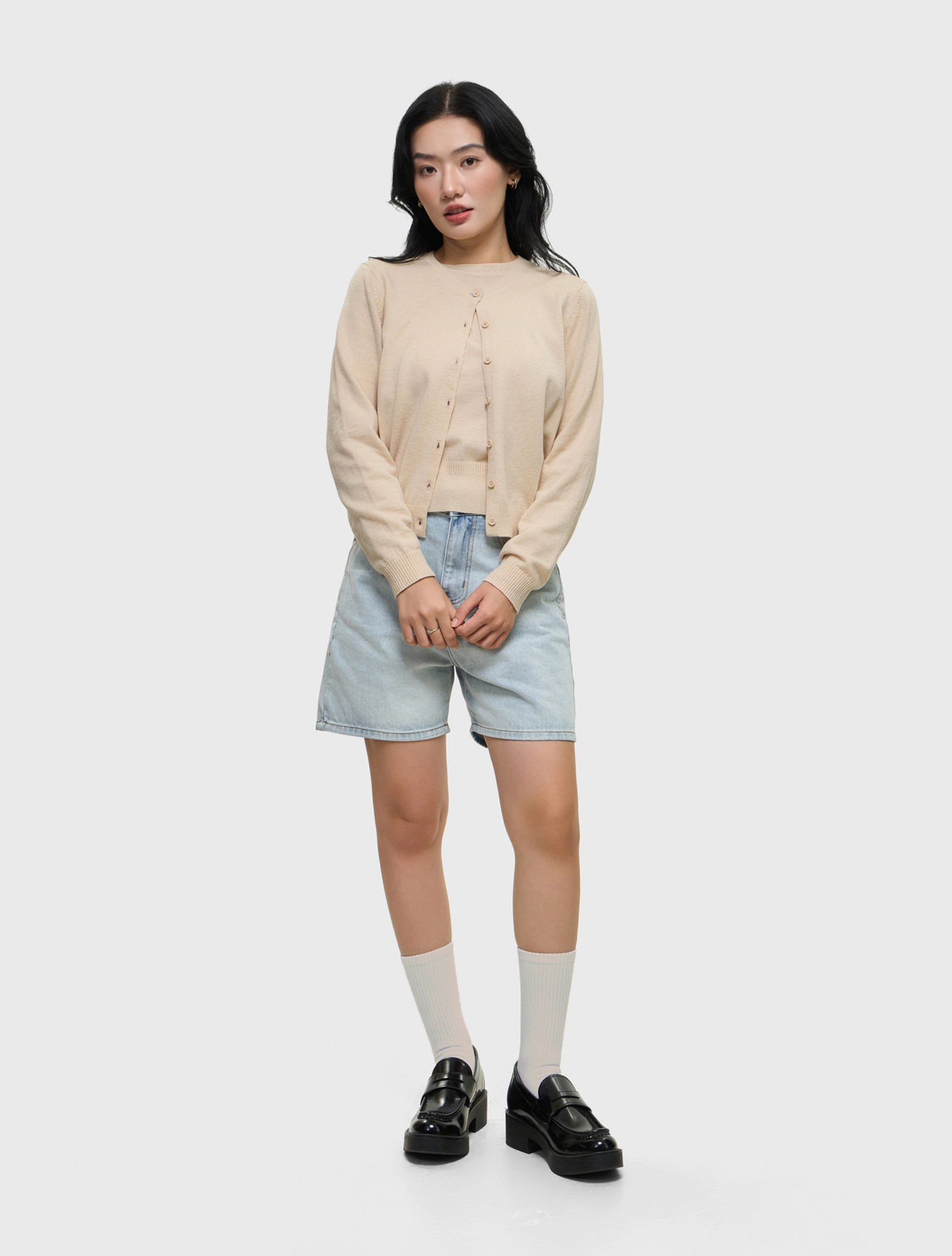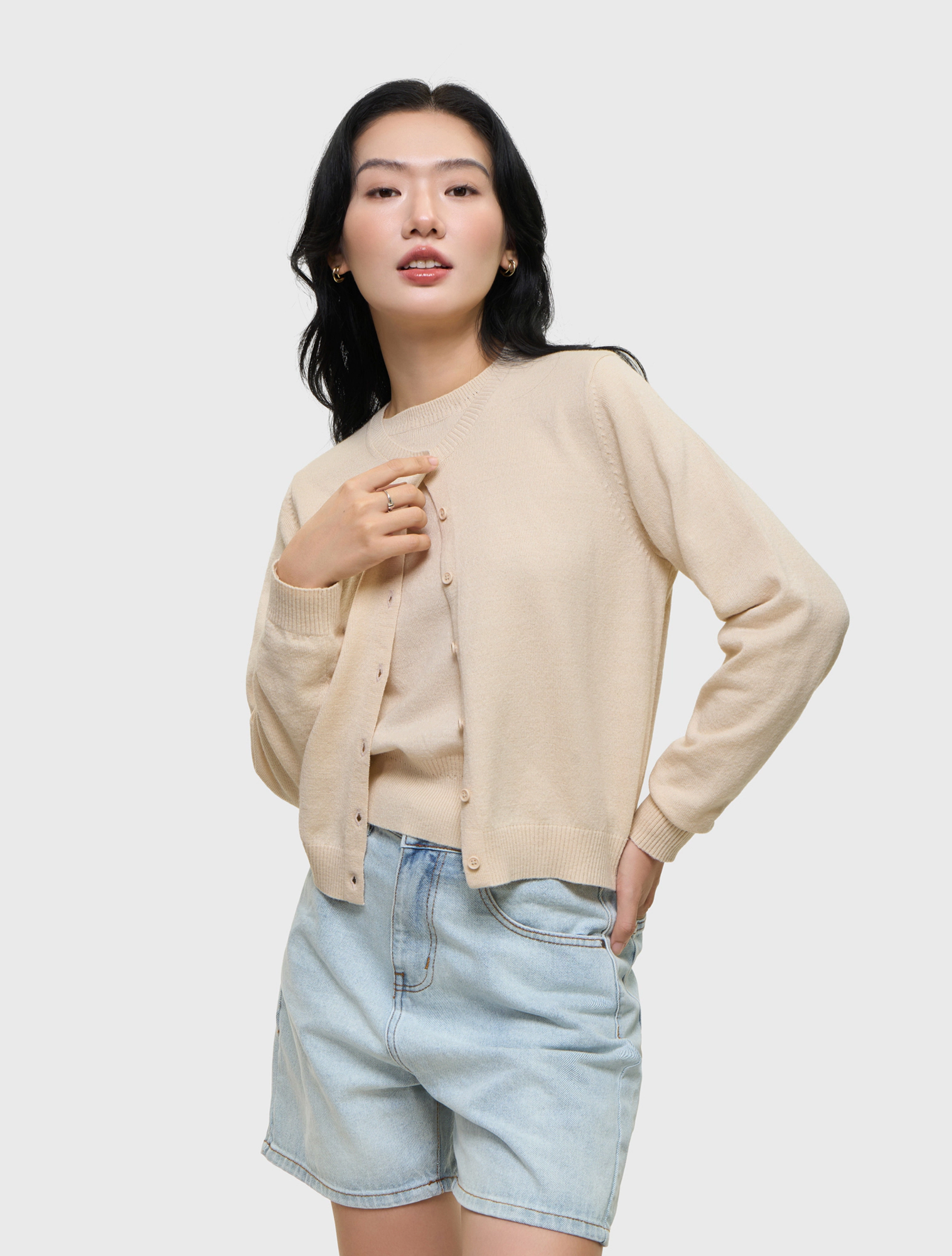 Áo cardigan nữ, cổ tròn dáng rộng vừa.