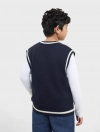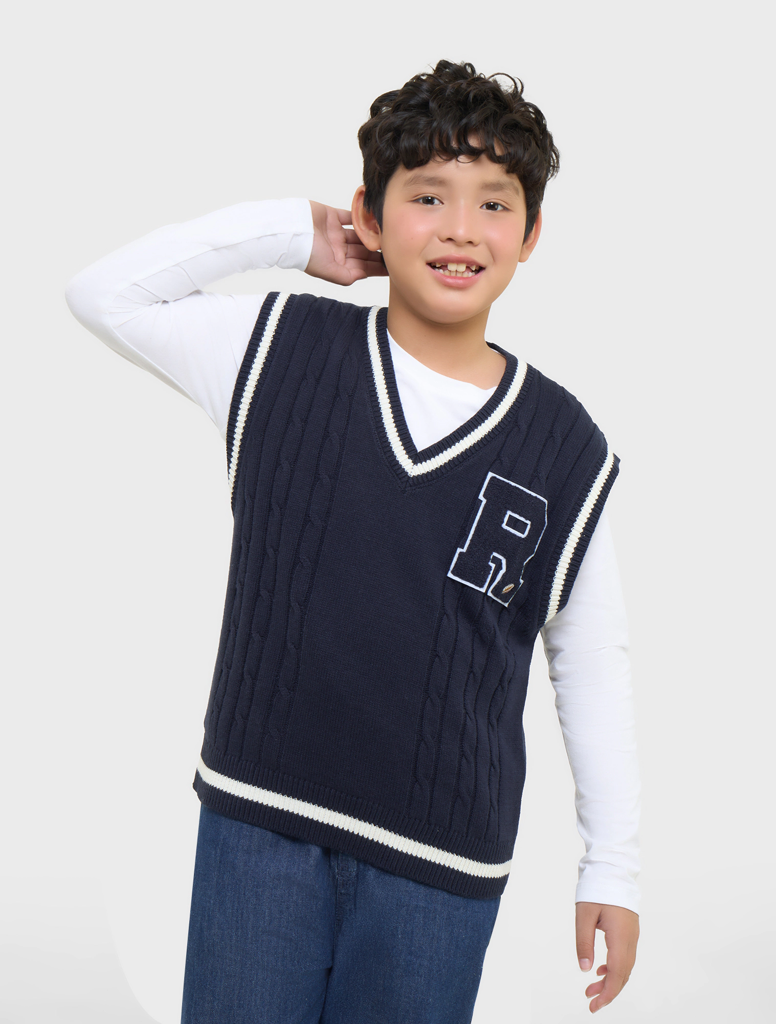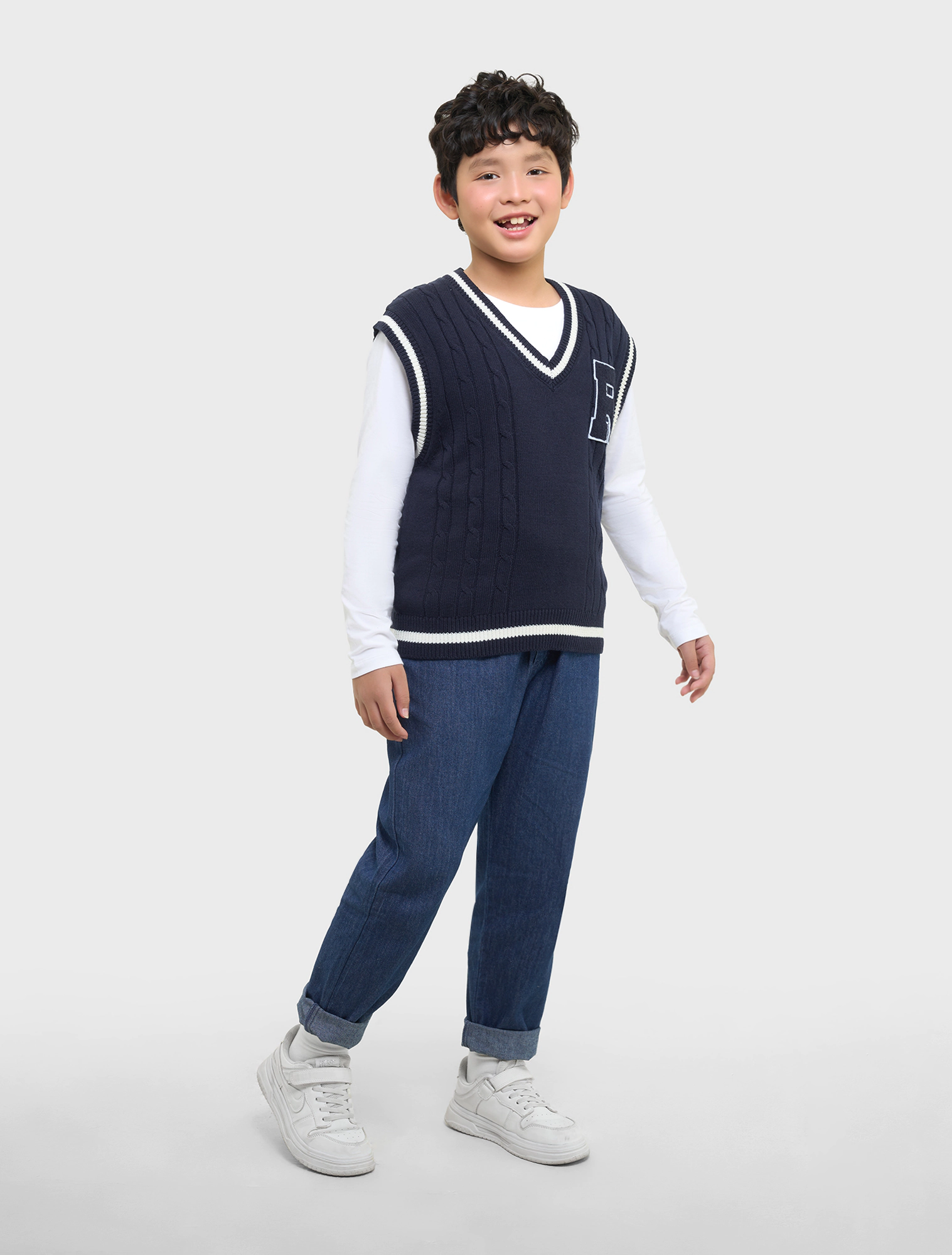 Áo len gilet bé trai dệt kẻ gấu và tay, đính patch chữ ngực tạo sự khỏe khoắn và năng động cho người sử dụng.