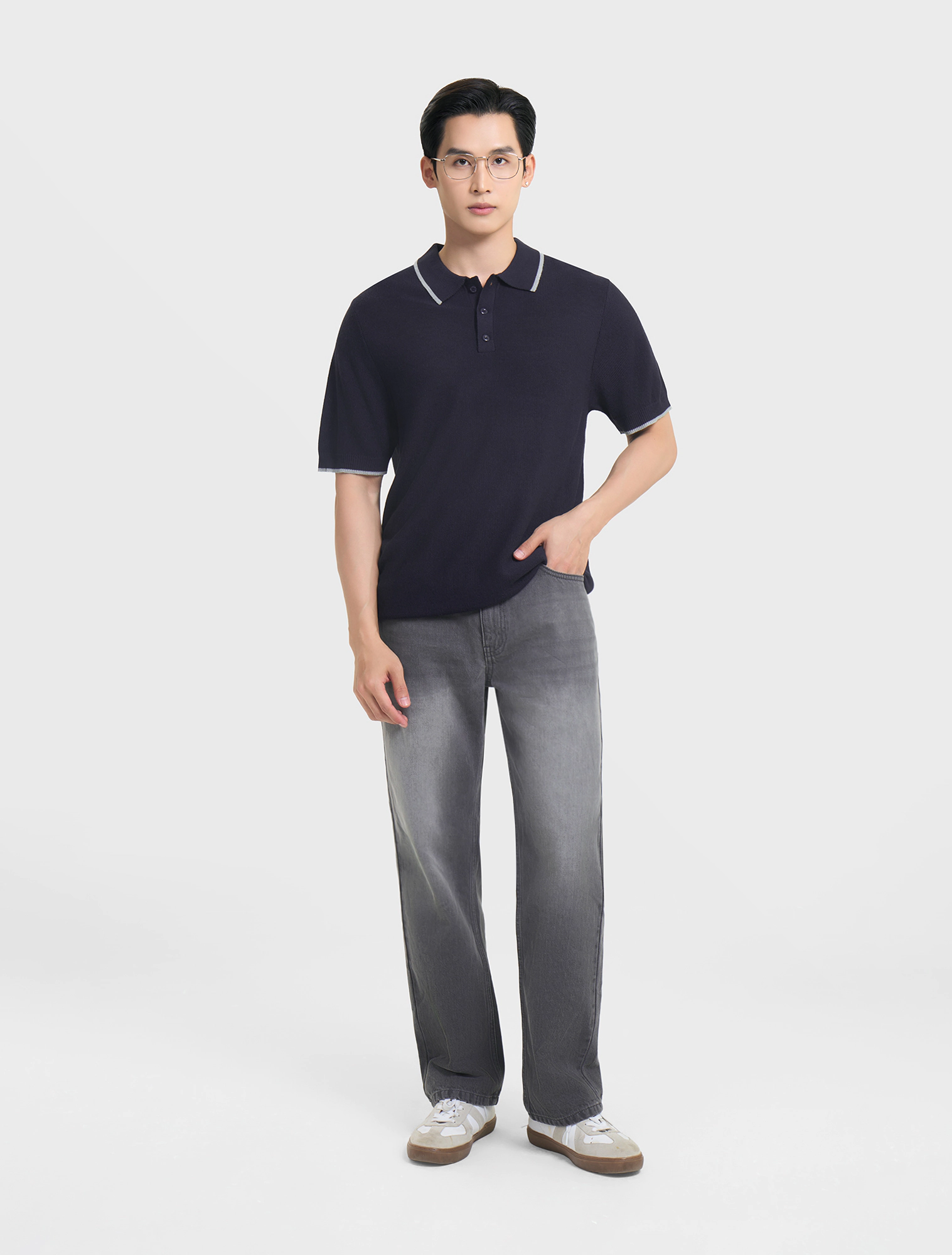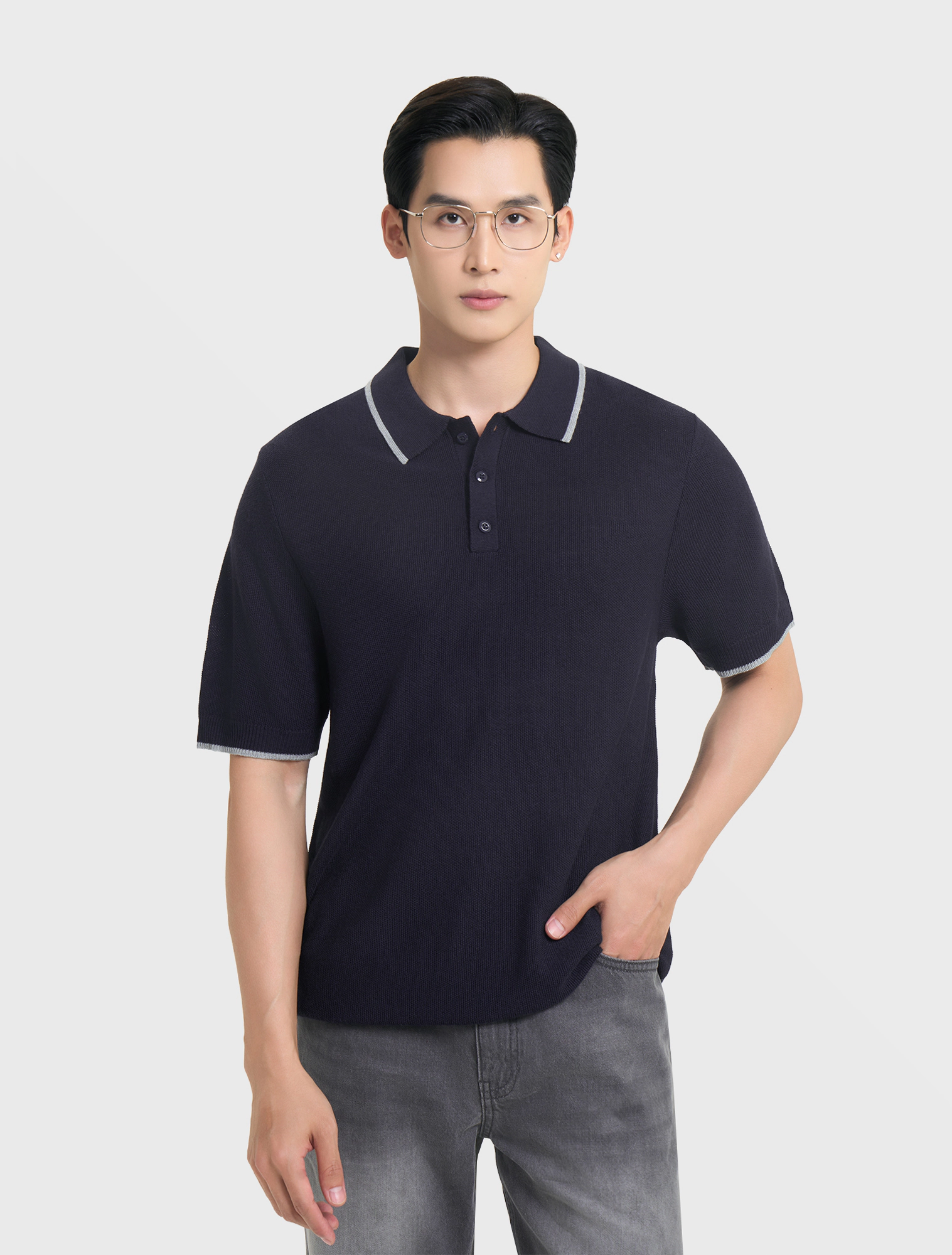 Áo len nam ngắn tay, cổ polo, dáng regular, mang phong cách hiện đại.