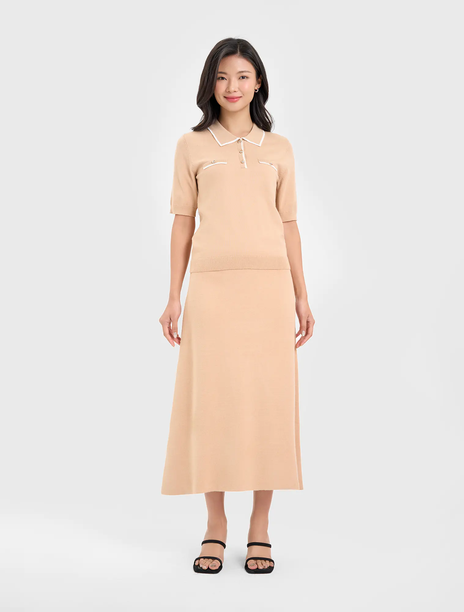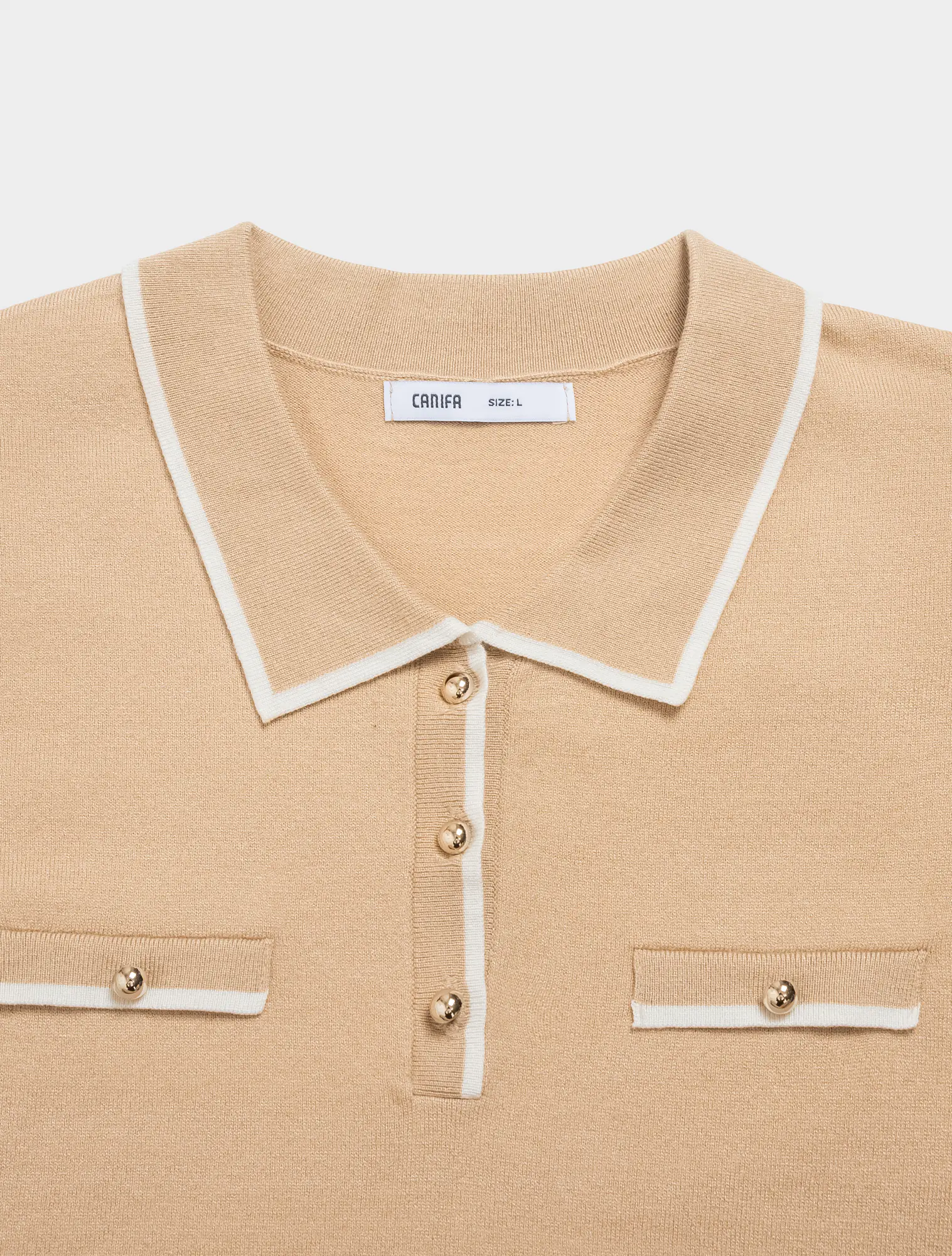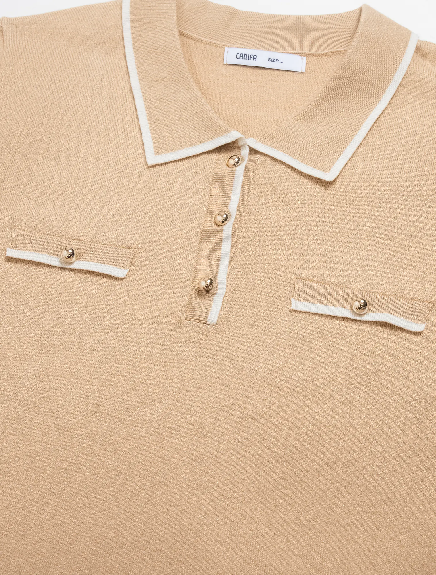 Áo len cổ polo phối màu, tay lỡ dáng ôm vừa, chất liệu mềm mại, thoải mái.