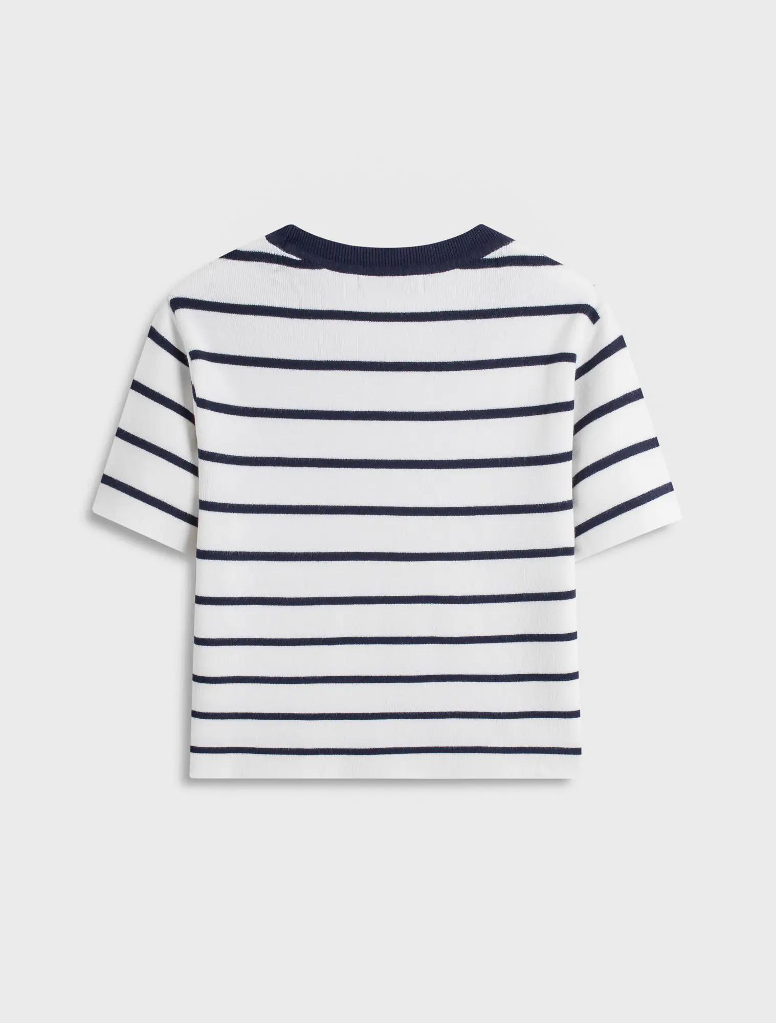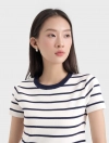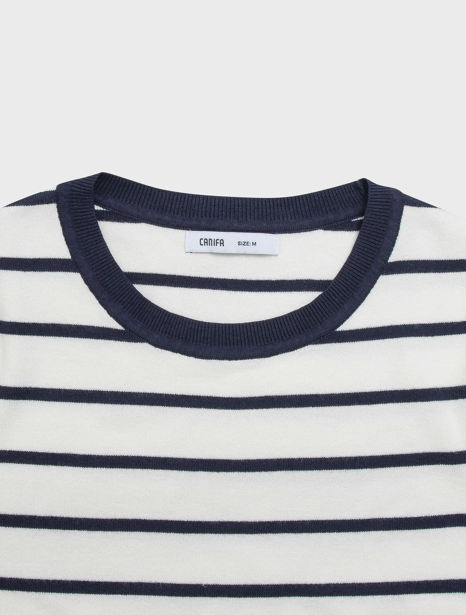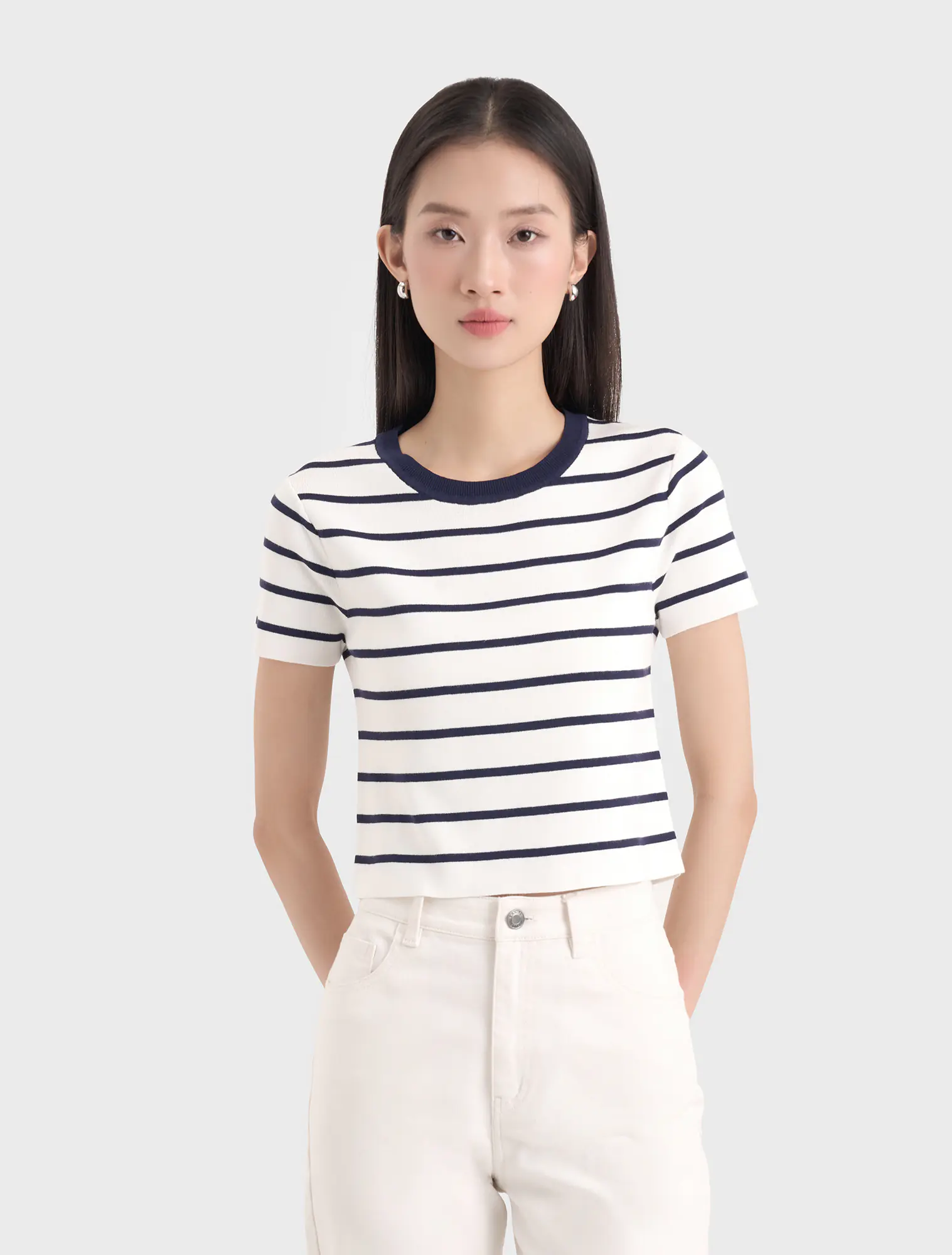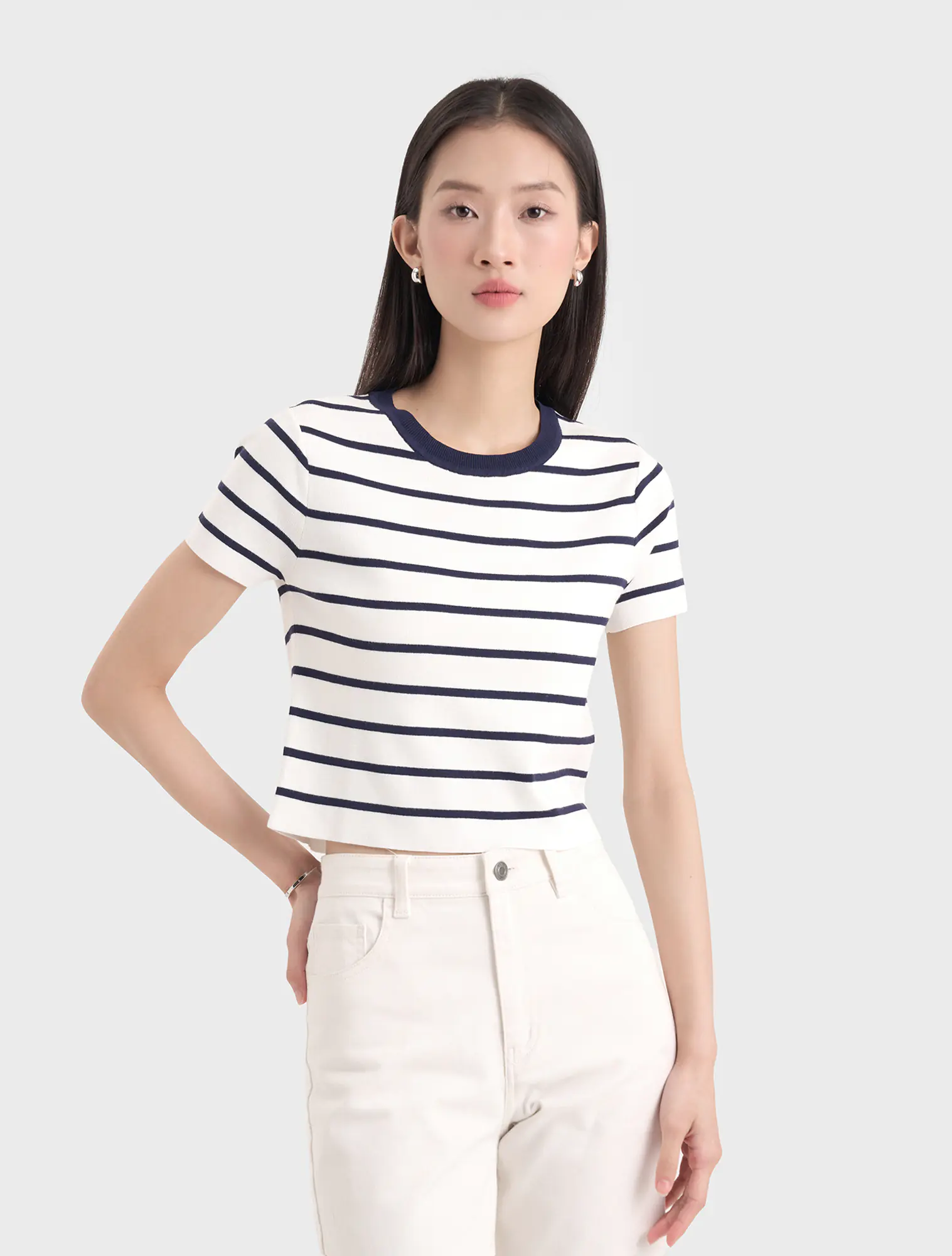 Áo len nữ tay ngắn, dáng ôm, phối màu kẻ nổi bật, tôn dáng và dễ phối đồ.