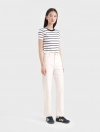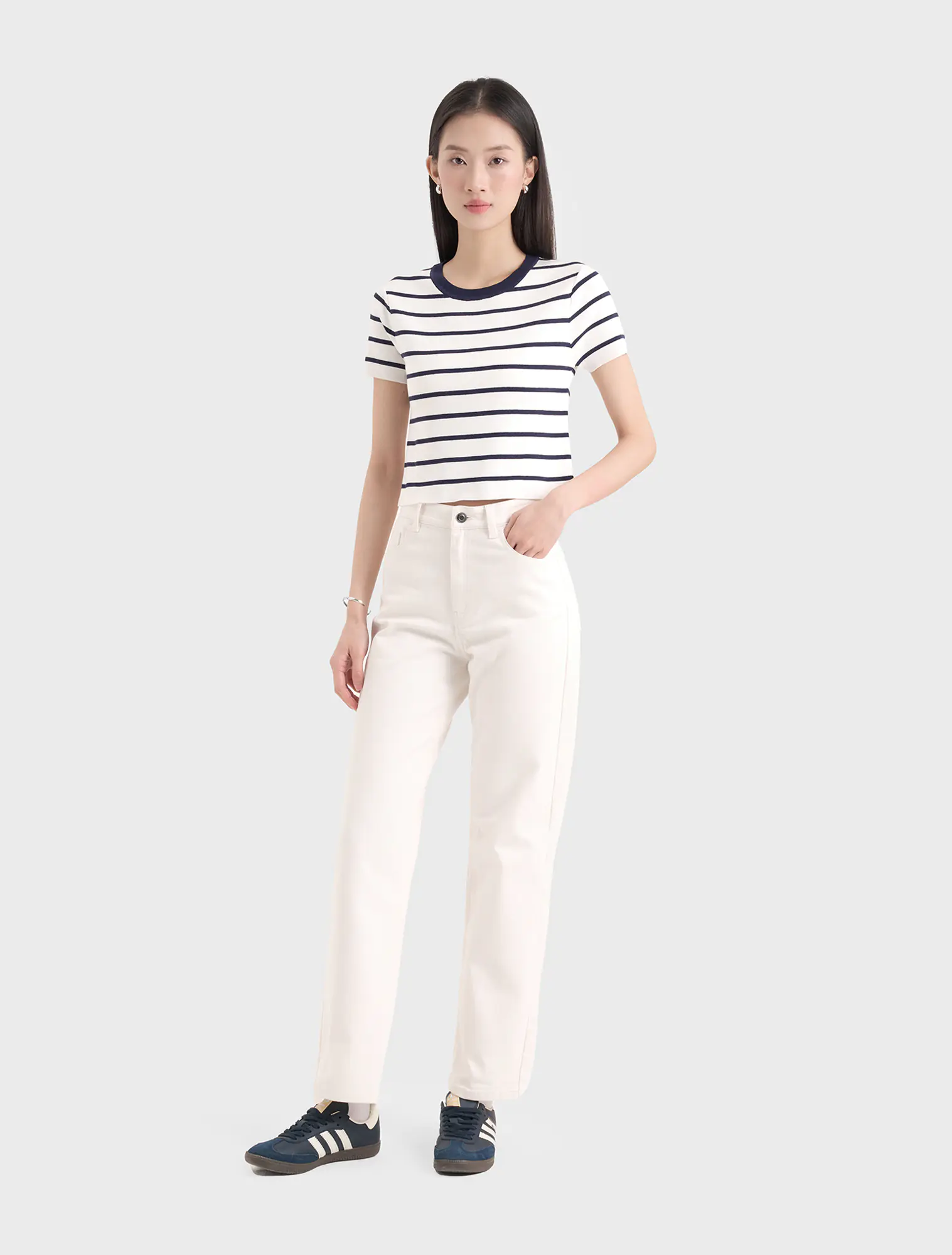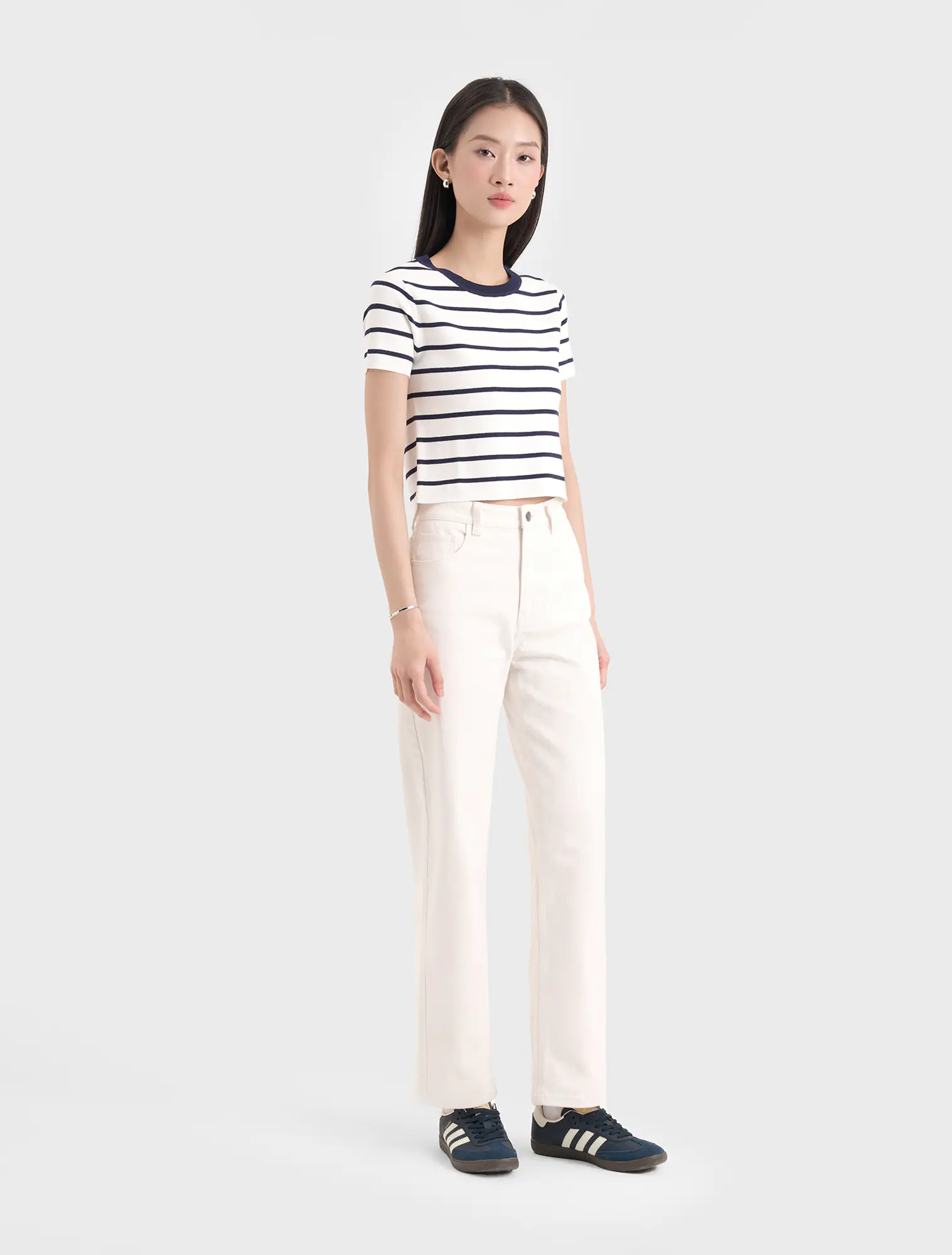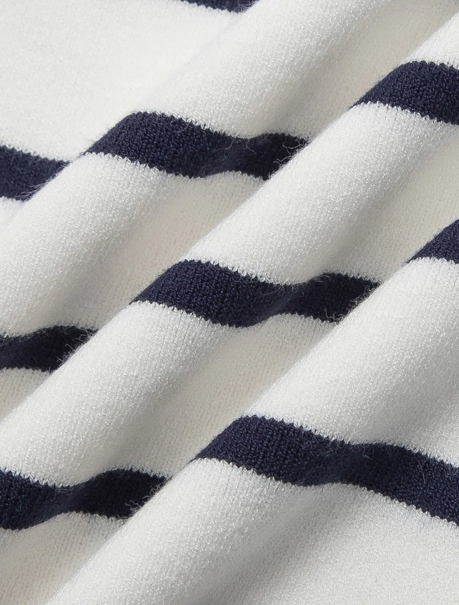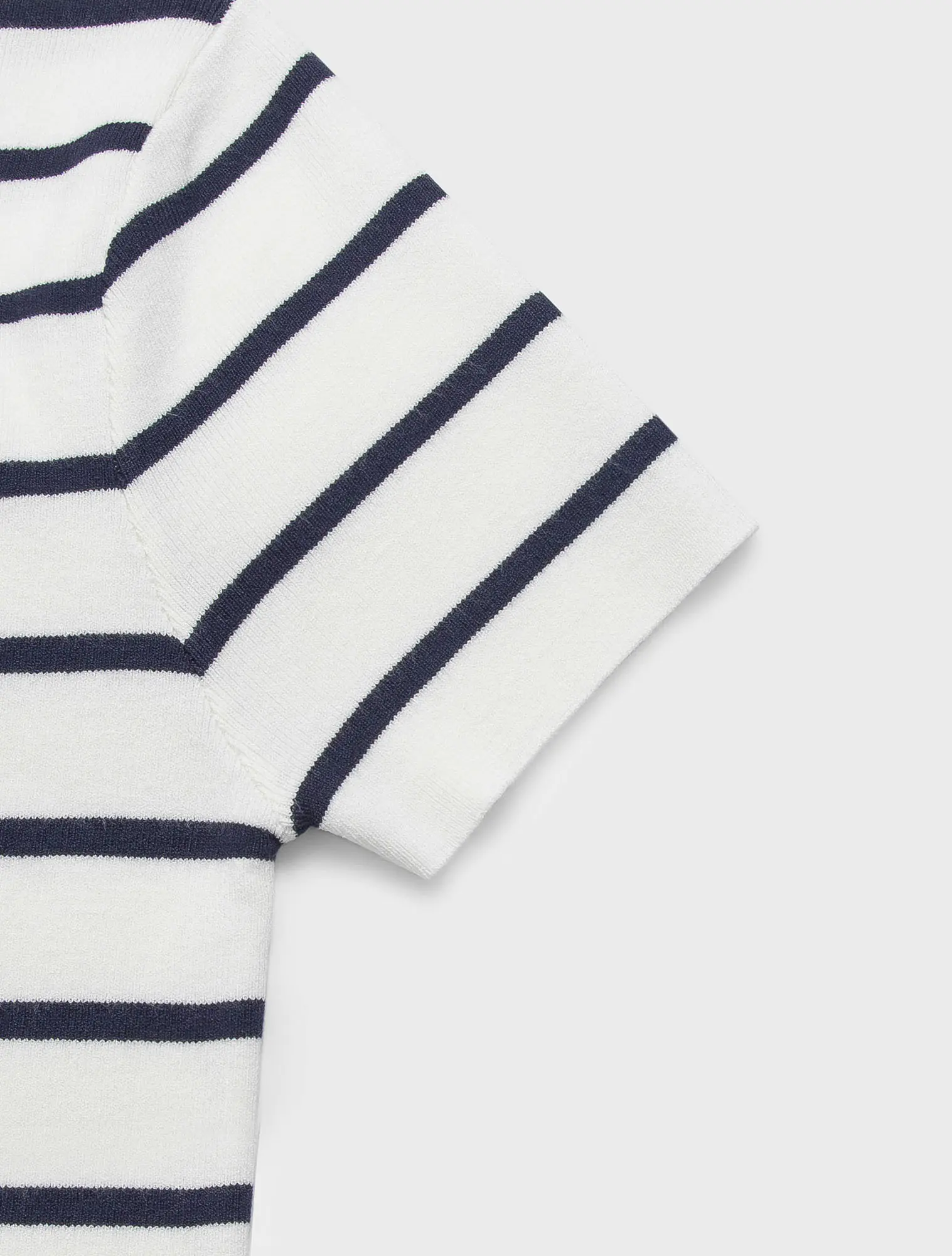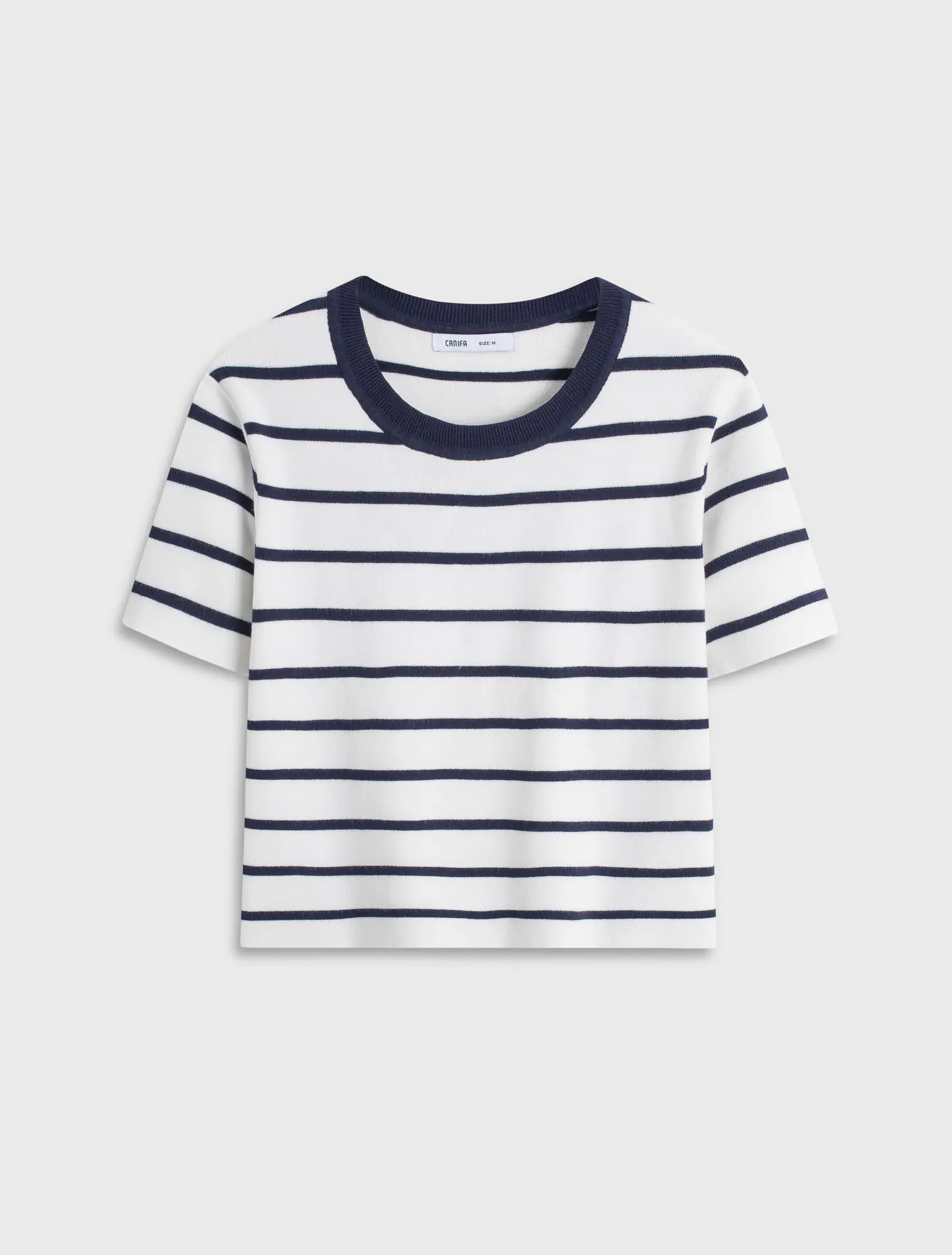 Áo len nữ tay ngắn, dáng ôm, phối màu kẻ nổi bật, tôn dáng và dễ phối đồ.