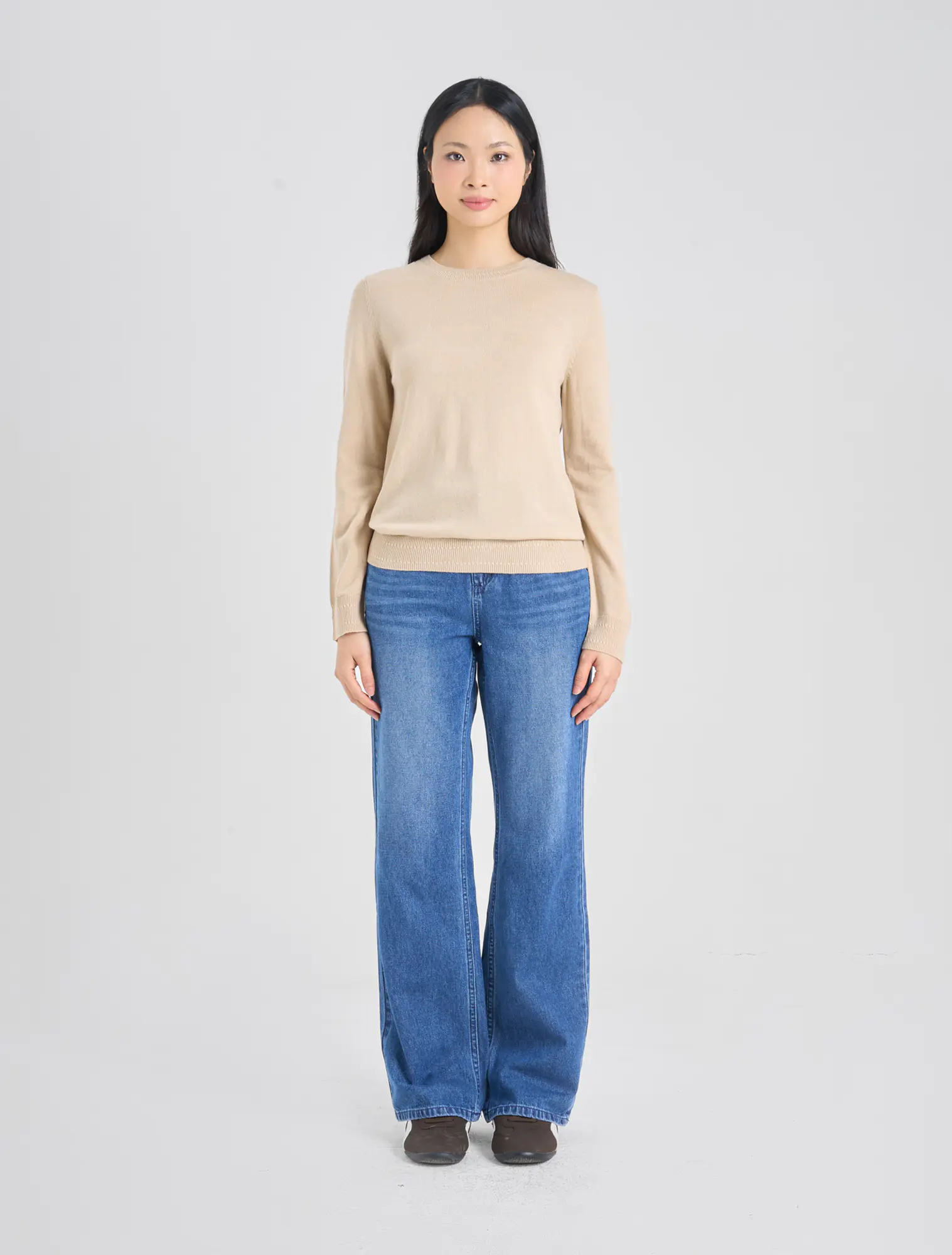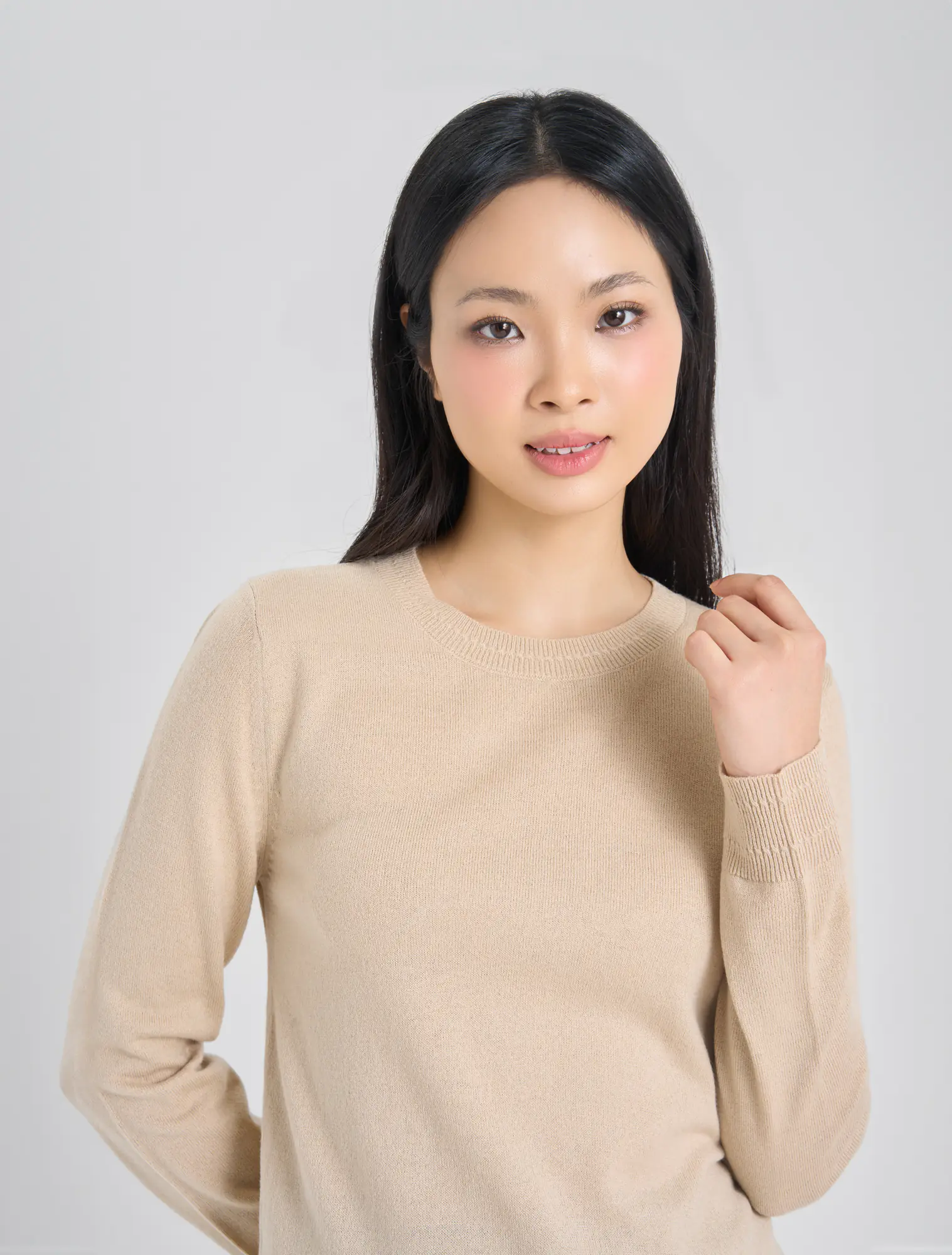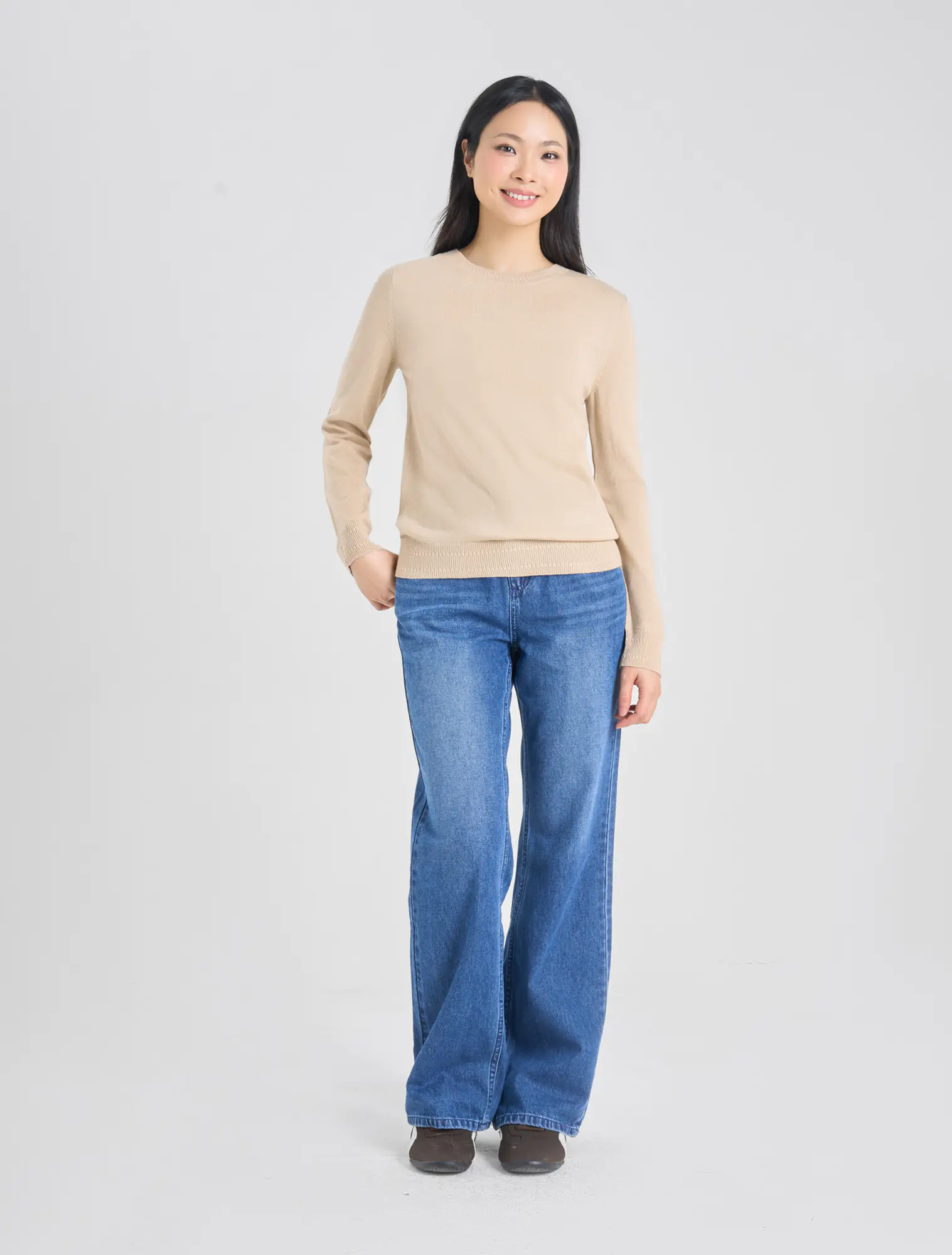 Áo len dài tay nữ cổ tròn dáng rộng vừa, chi tiết kiểu ở cổ tay và gấu áo. Chất liệu mỏng nhẹ, có khả năng giữ ấm tốt.