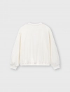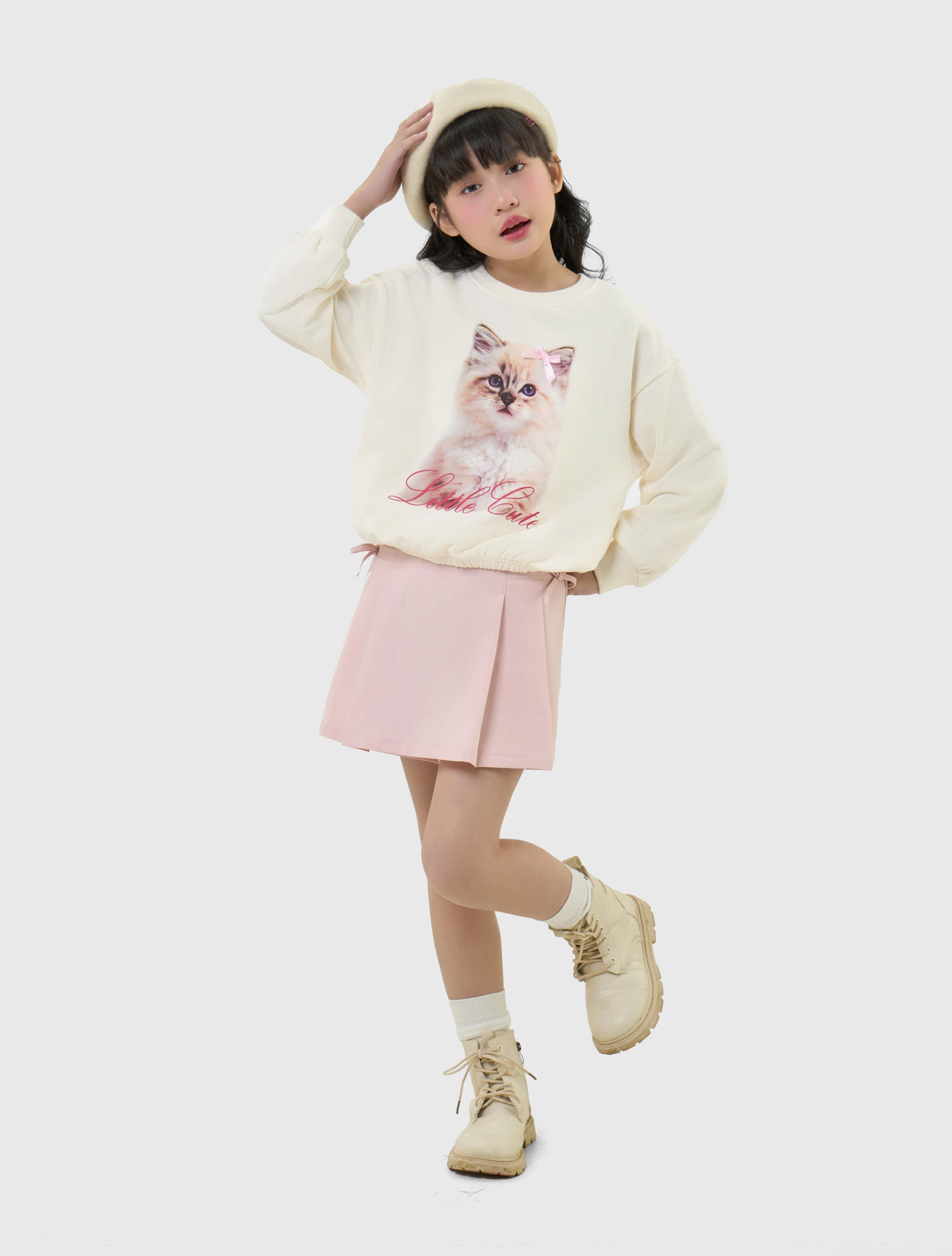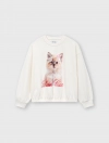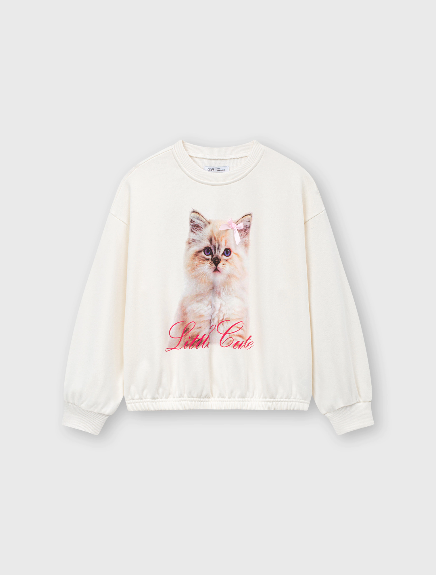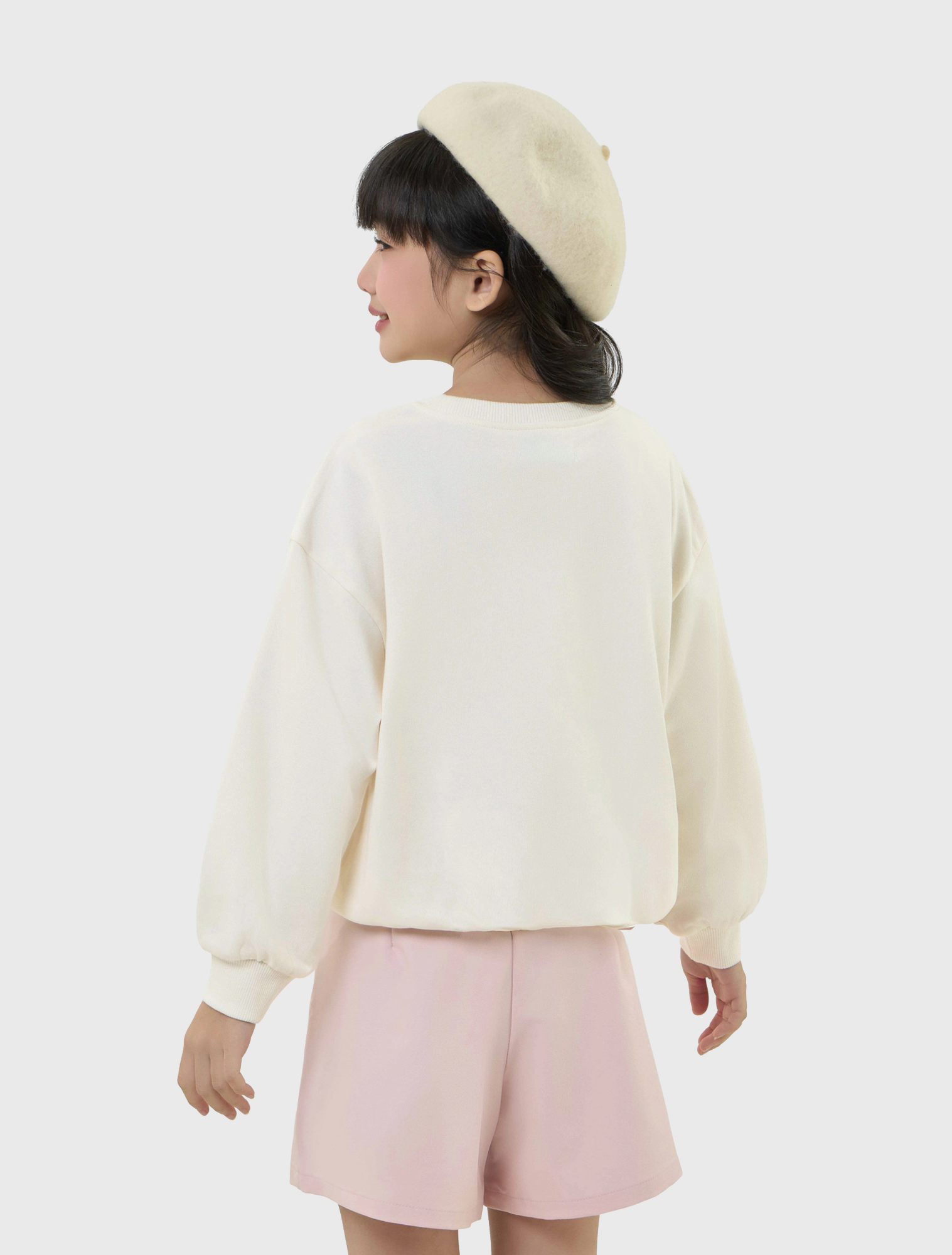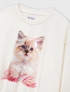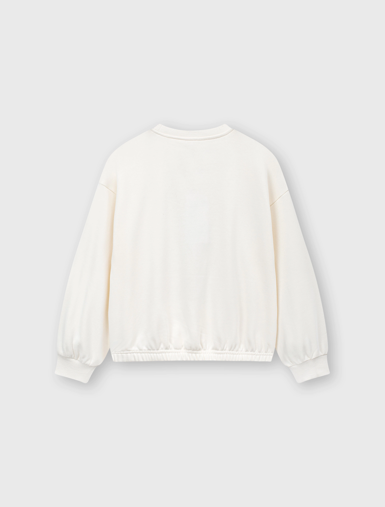 Áo nỉ bé gái có hình in, gấu áo bo chun gọn gàng.