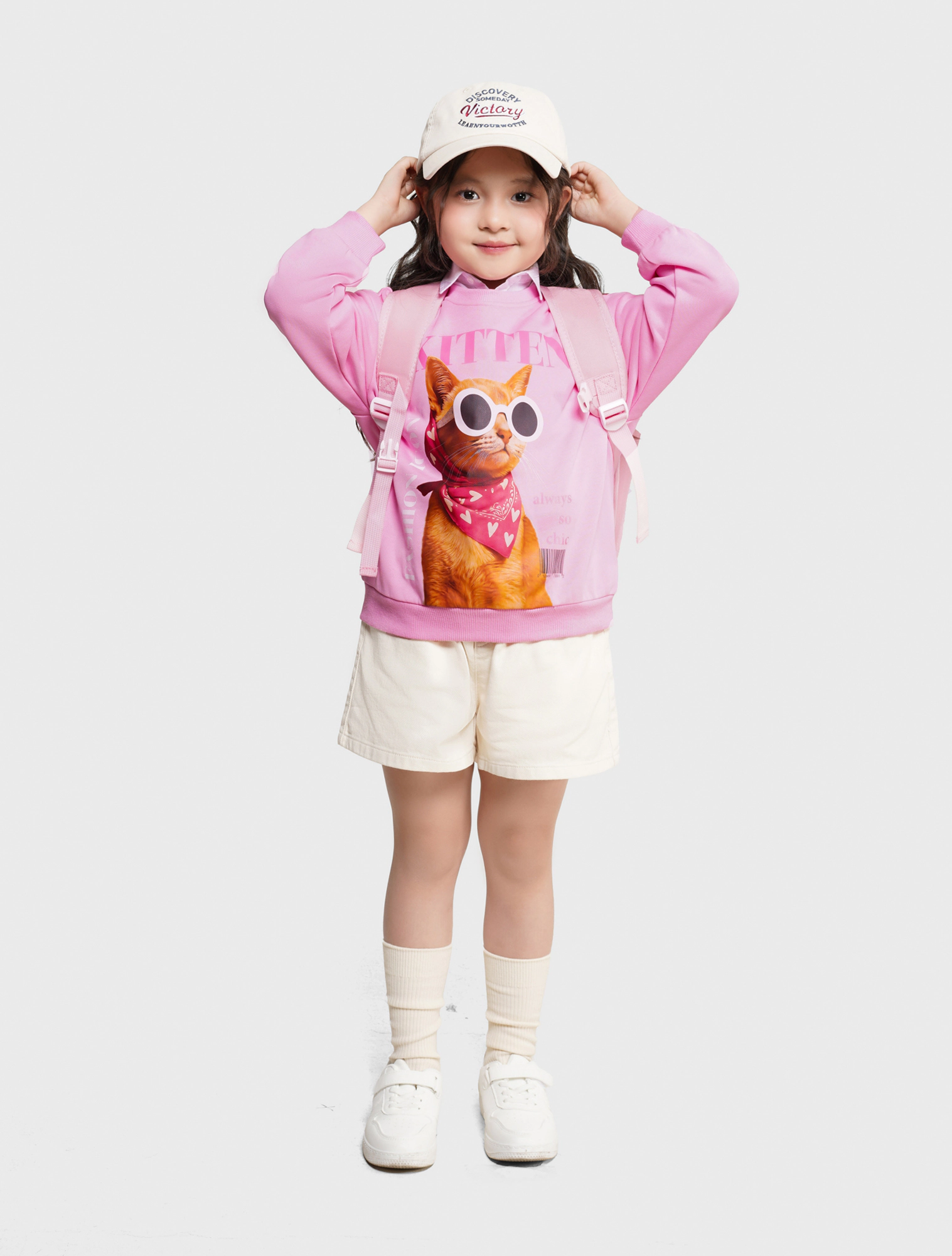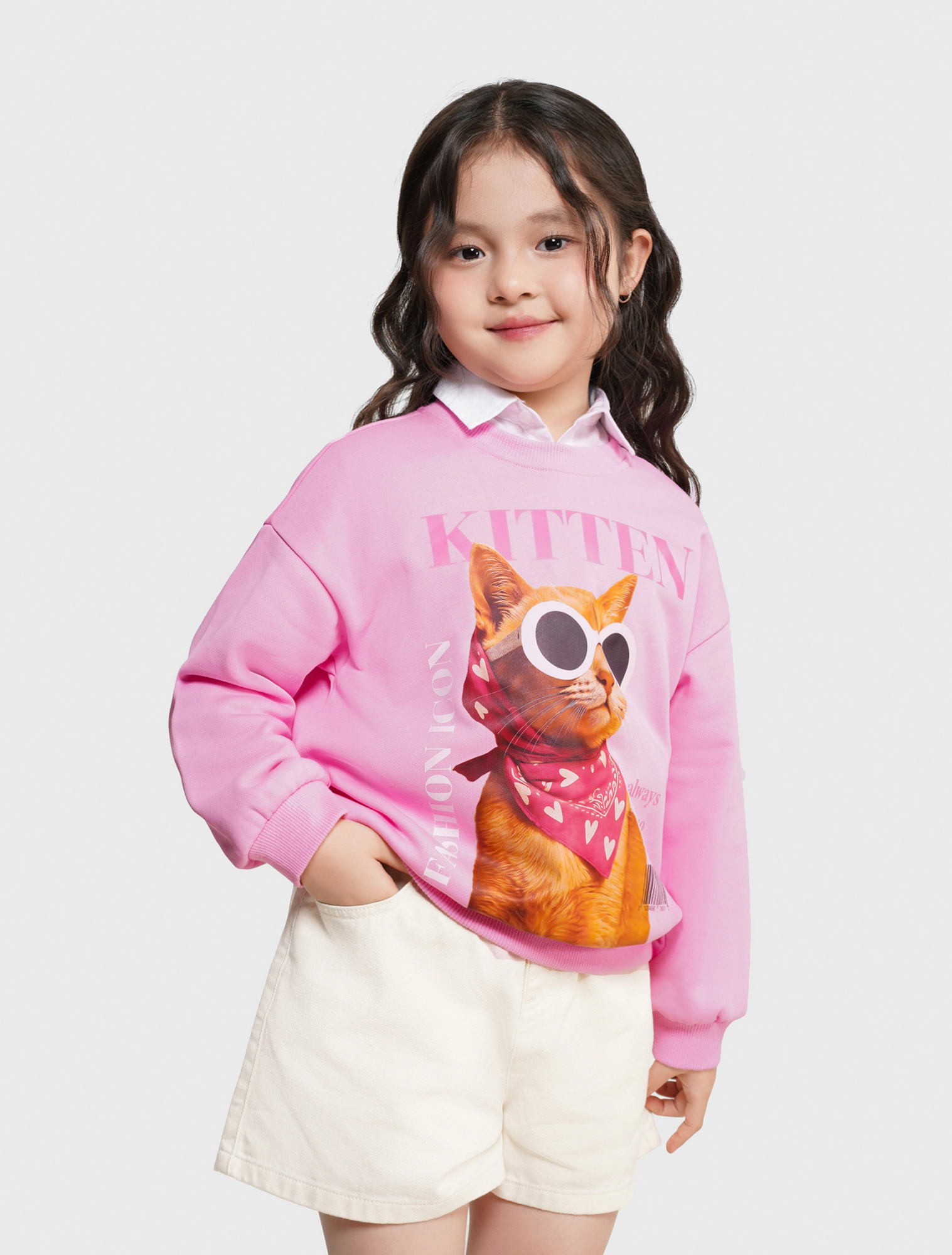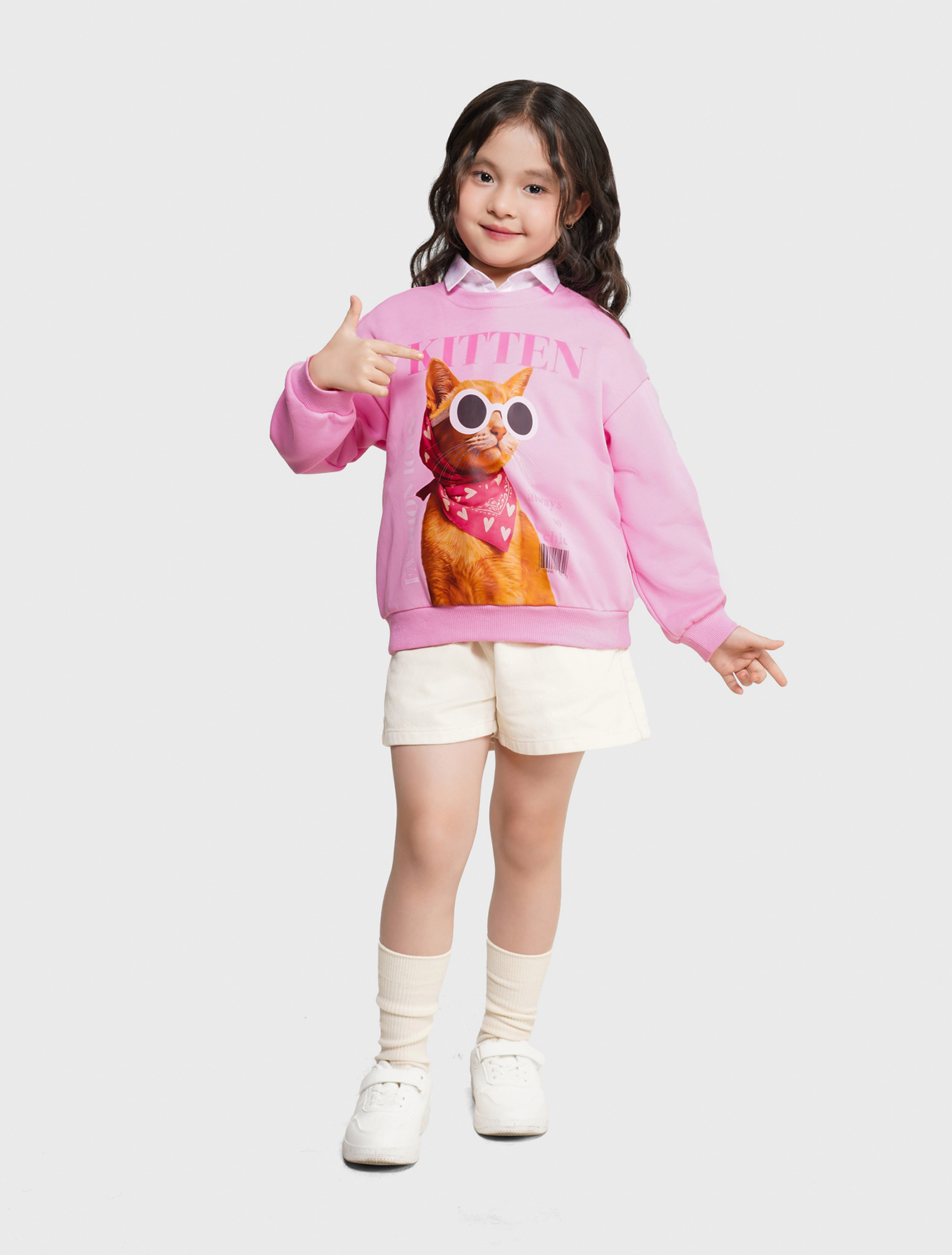 Áo nỉ bé gái. Phom áo cơ bản, cổ tròn dễ mặc. Màu sắc tươi sáng, hình in dễ thương phù hợp bé gái. Chất liệu Cotton pha mềm mại, giữ ấm tốt