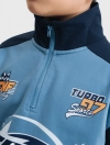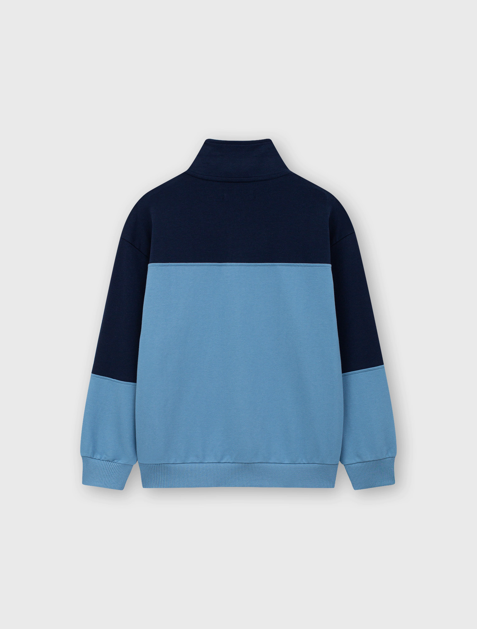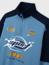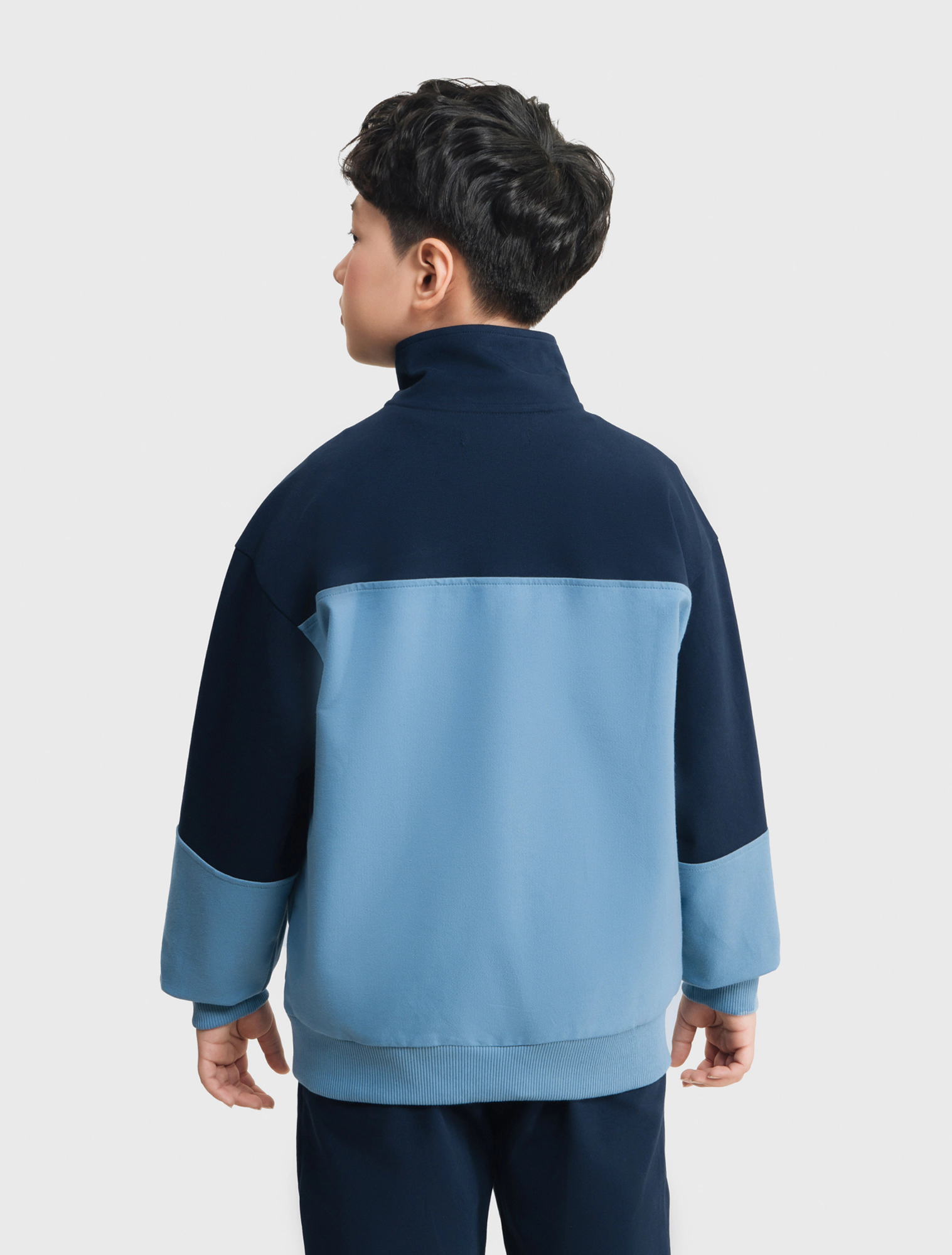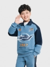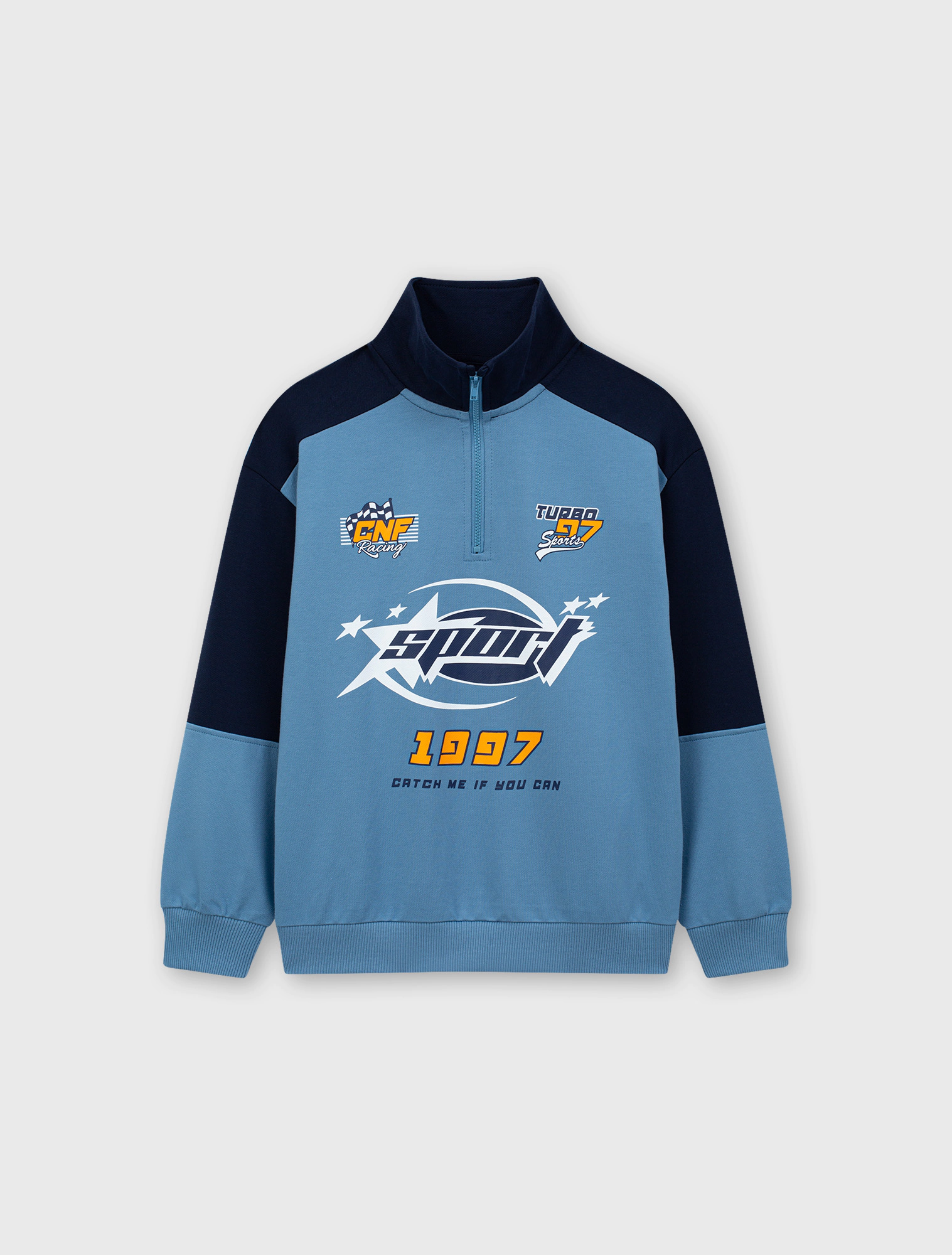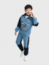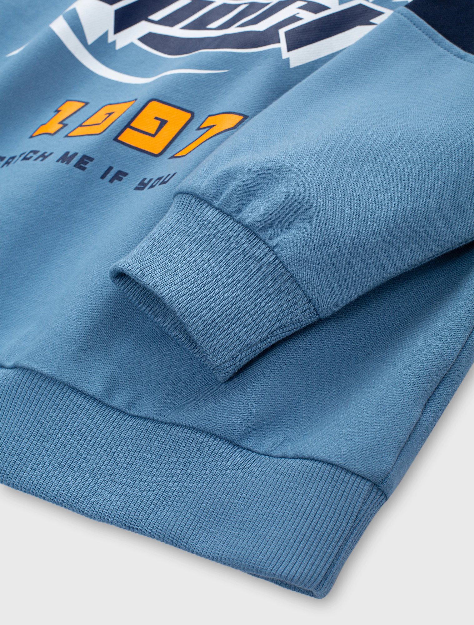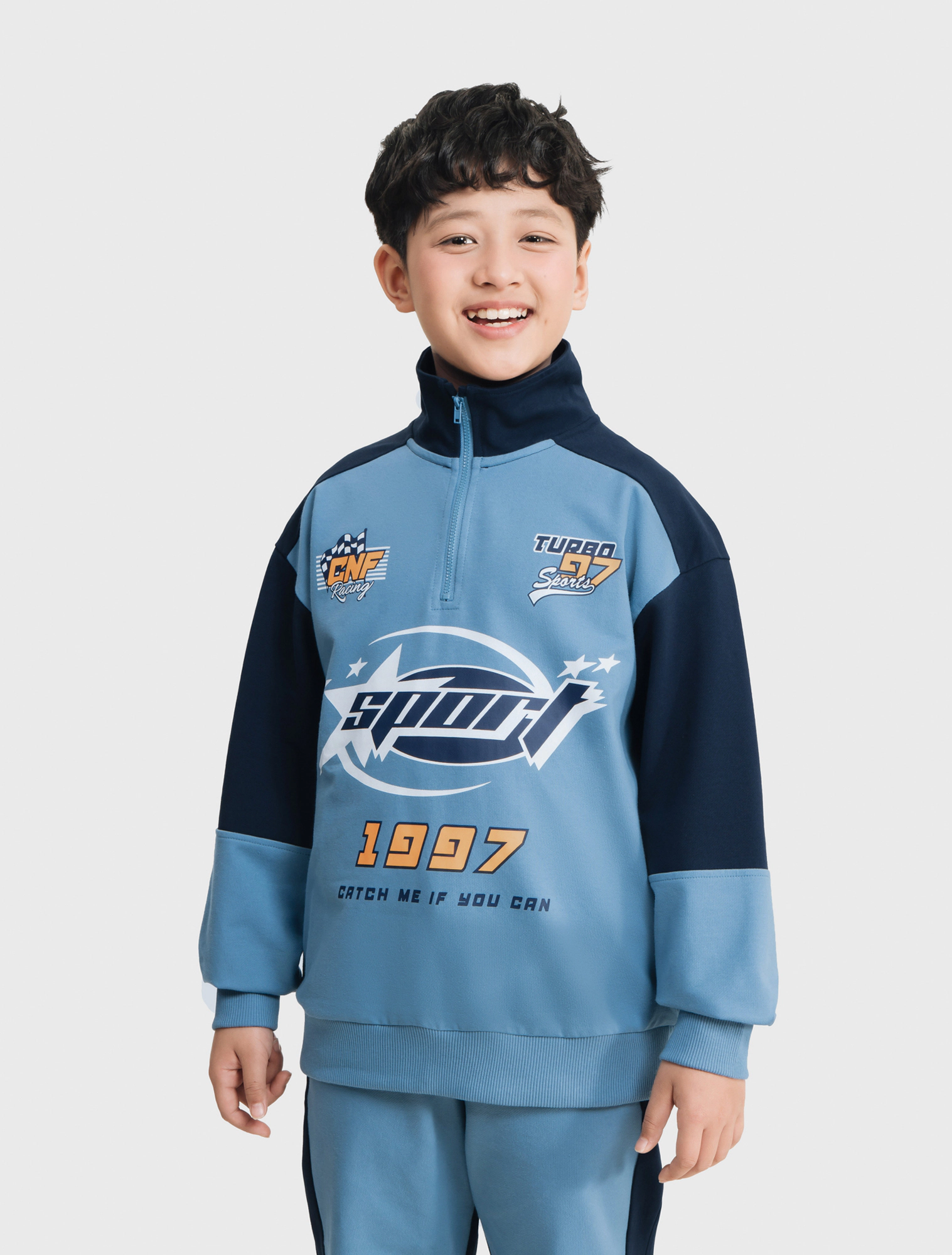 Áo nỉ bé trai can phối mix màu, nguyên liệu vảy cá, phom dáng relax thoải mái, hình in sport khỏe khoắn tạo sự năng động cho các bé.