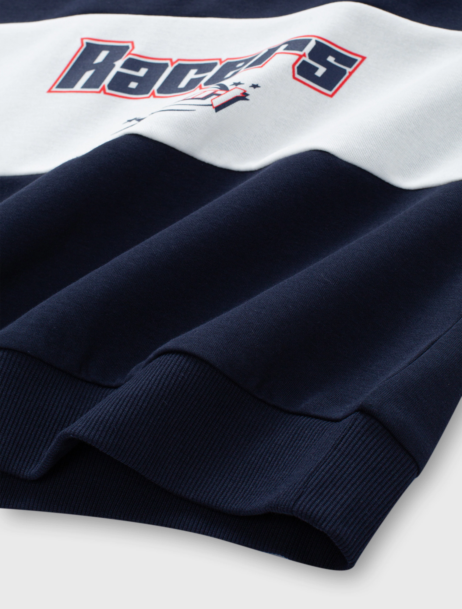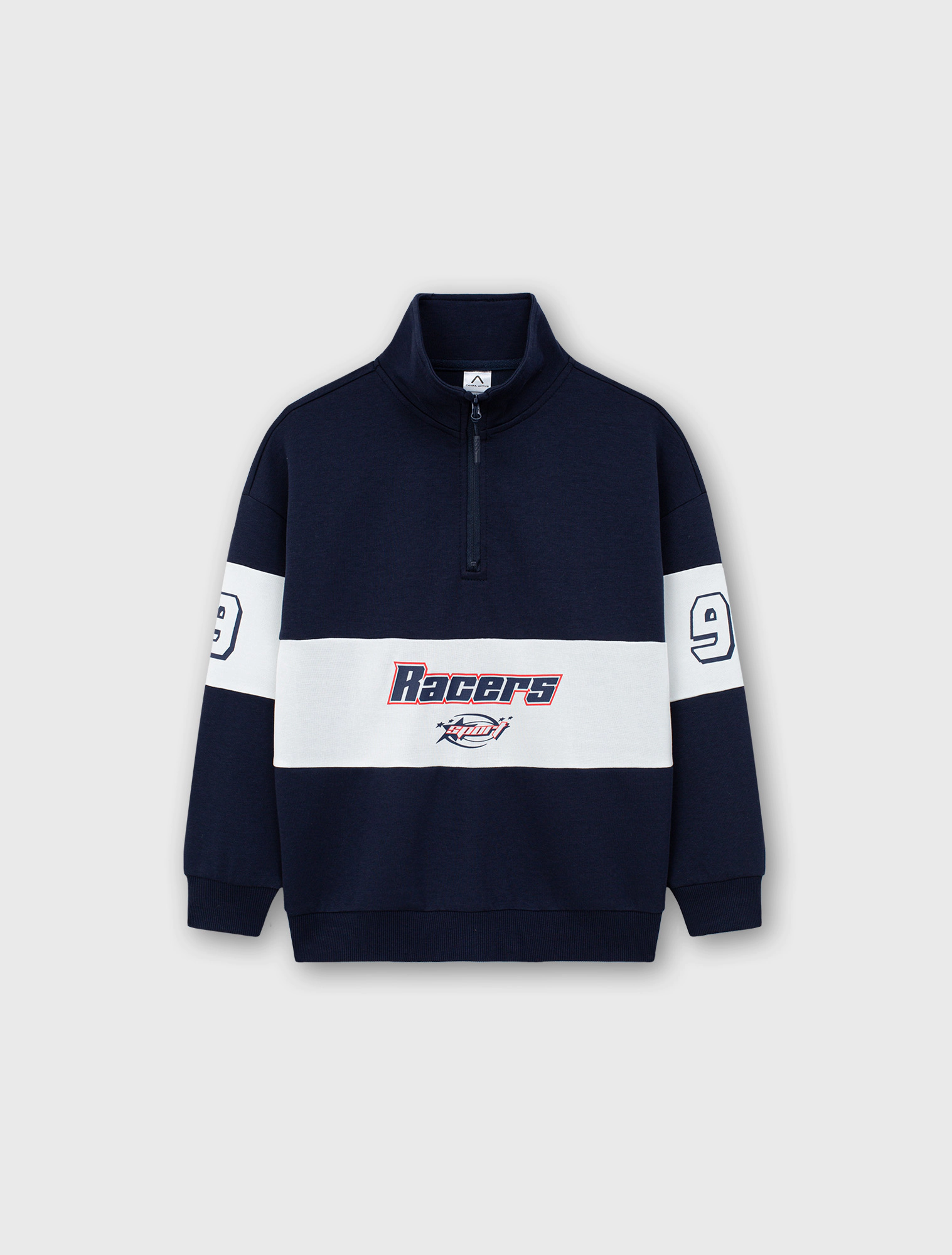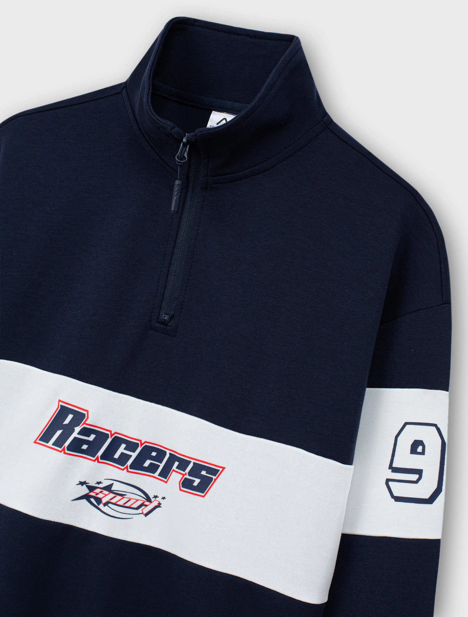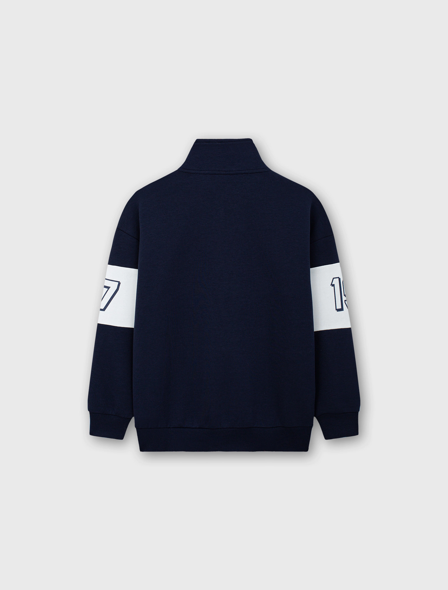 Áo nỉ interlock bé trai cổ kéo khóa. Thân trước và tay phối màu, có hình in. Gấu áo, gấu tay bo.