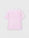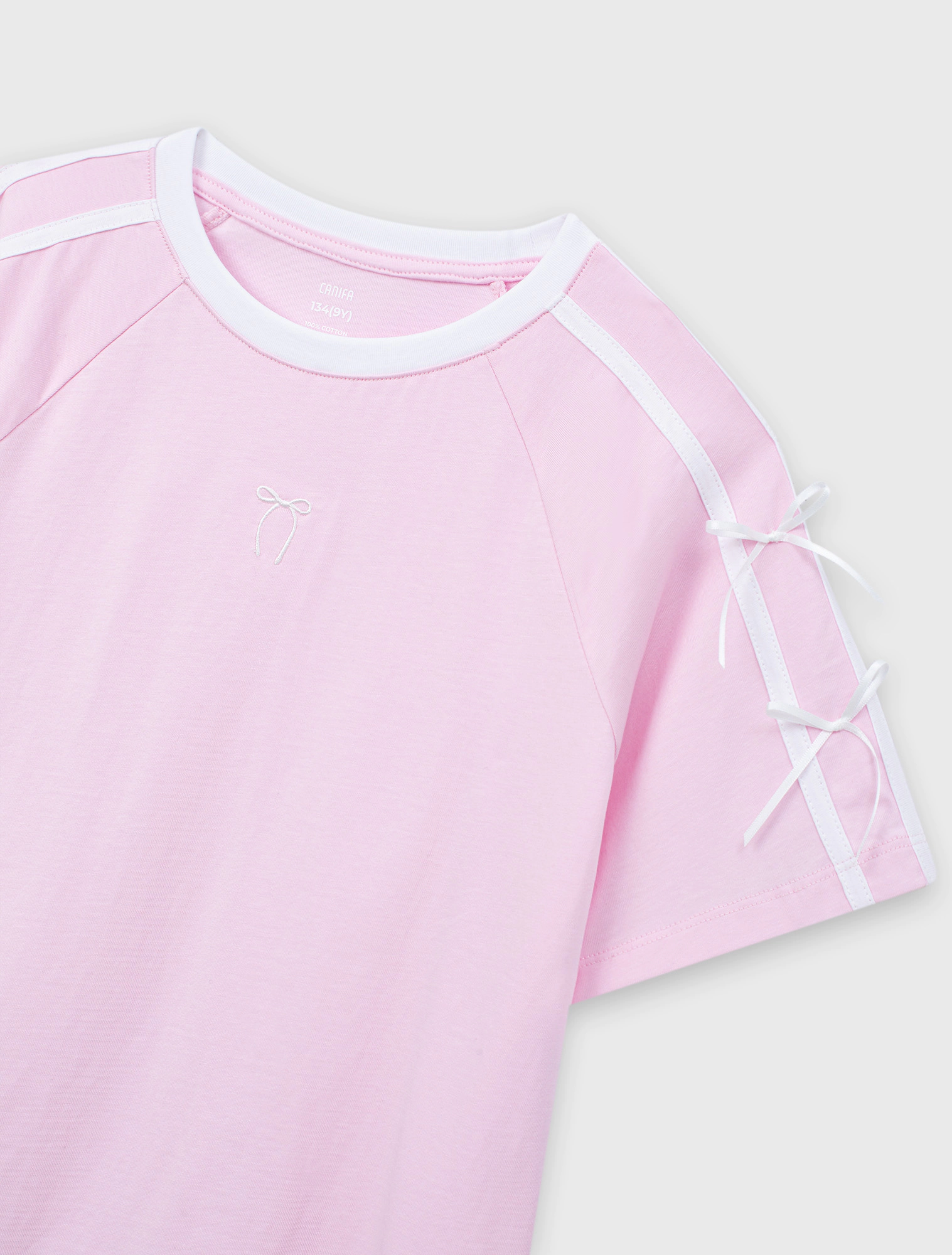 Áo phông ngắn tay bé gái. Dáng áo relax hiện đại. Cổ tròn phối màu bo rib, sống tay đè dây dệt và đính nơ cùng màu cổ áo. HÌnh thêu nơ nhỏ đáng yêu., màu sắc phù hợp bé gái. Chất liệu 100% Cotton mềm mại, thoáng mát.