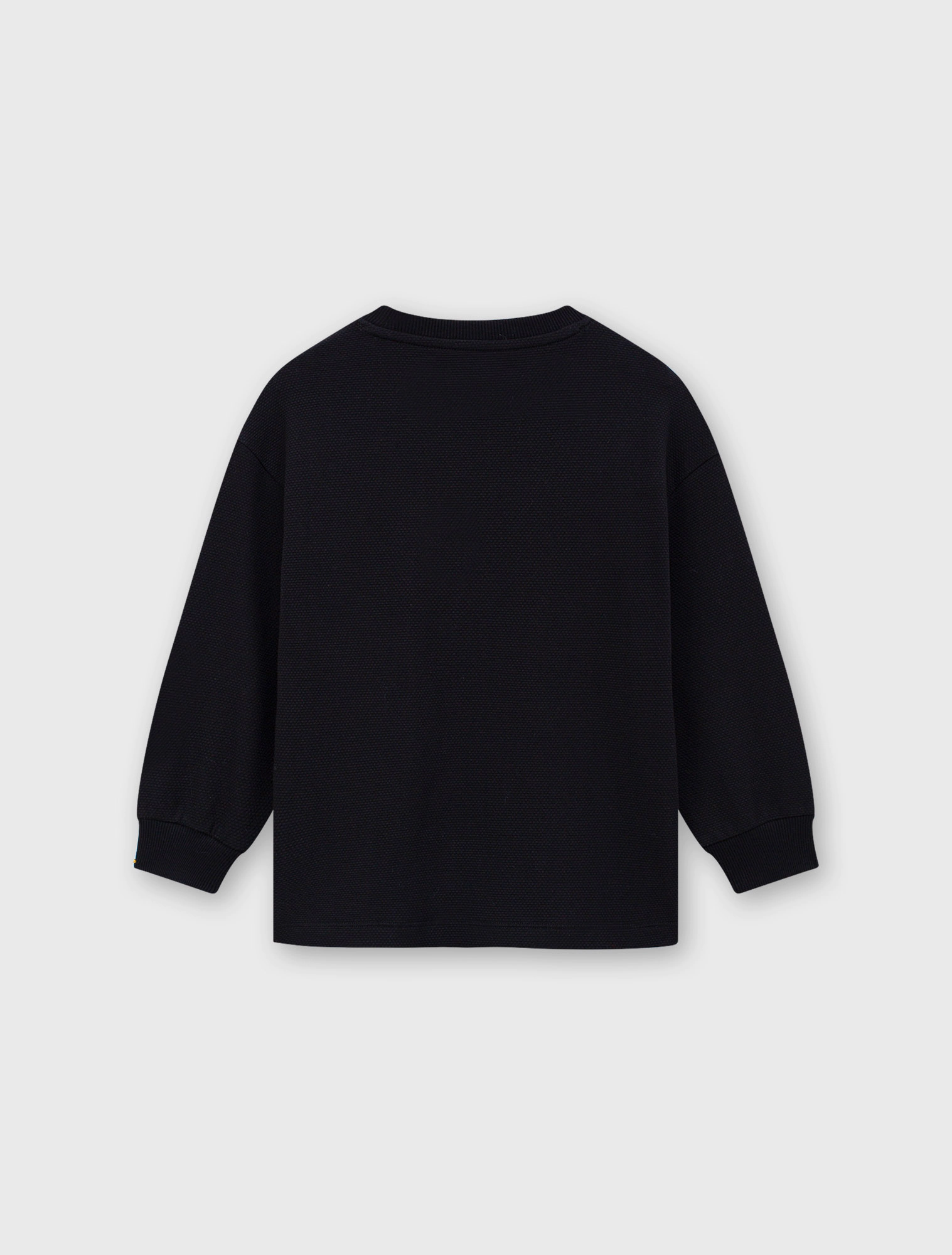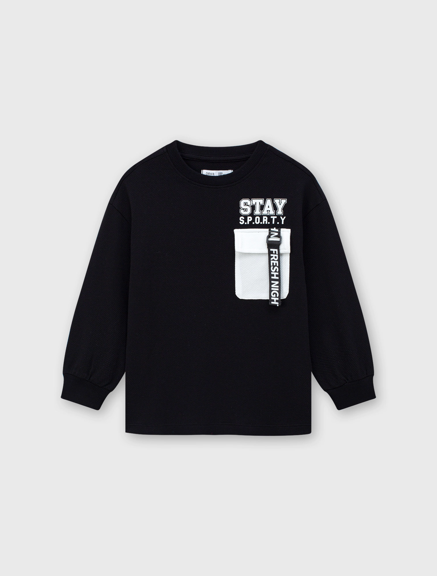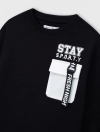 Áo phông bé trai dáng rộng, mix màu, nguyên liệu bề mặt kiểu, phối túi kẹp dây dệt, hình in khỏe khoắn.