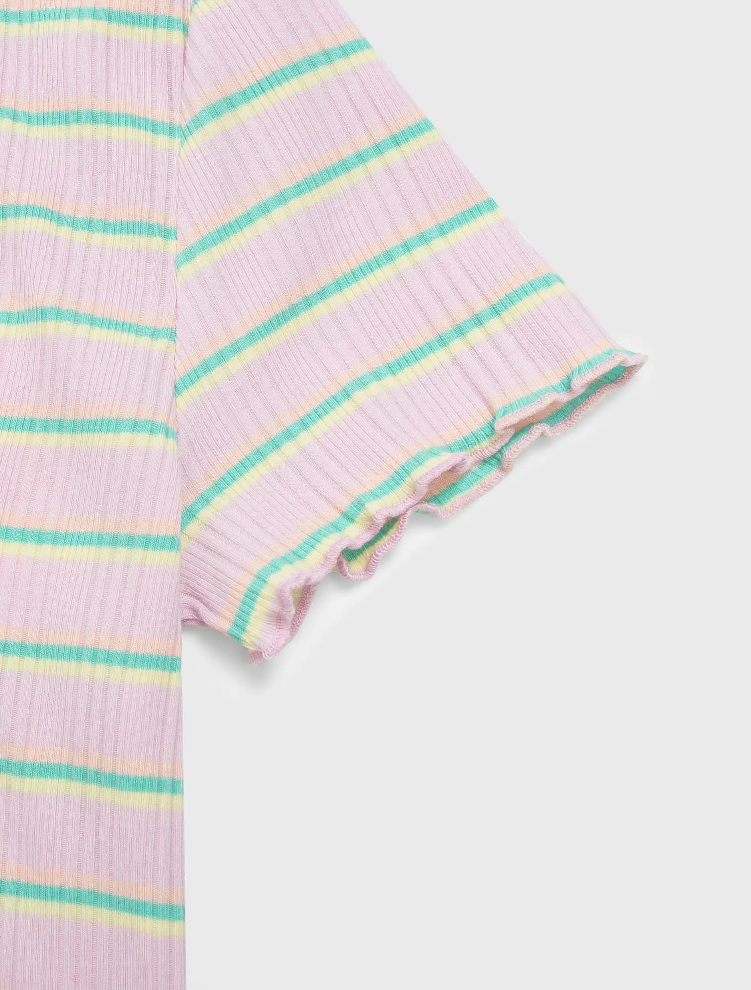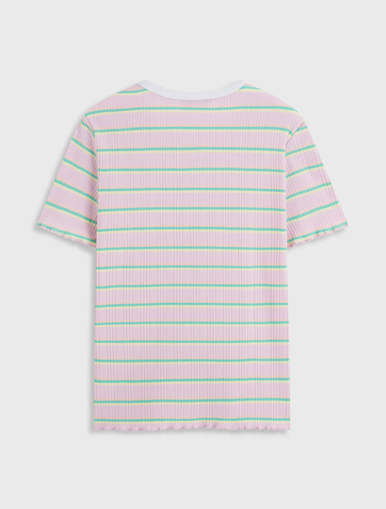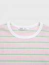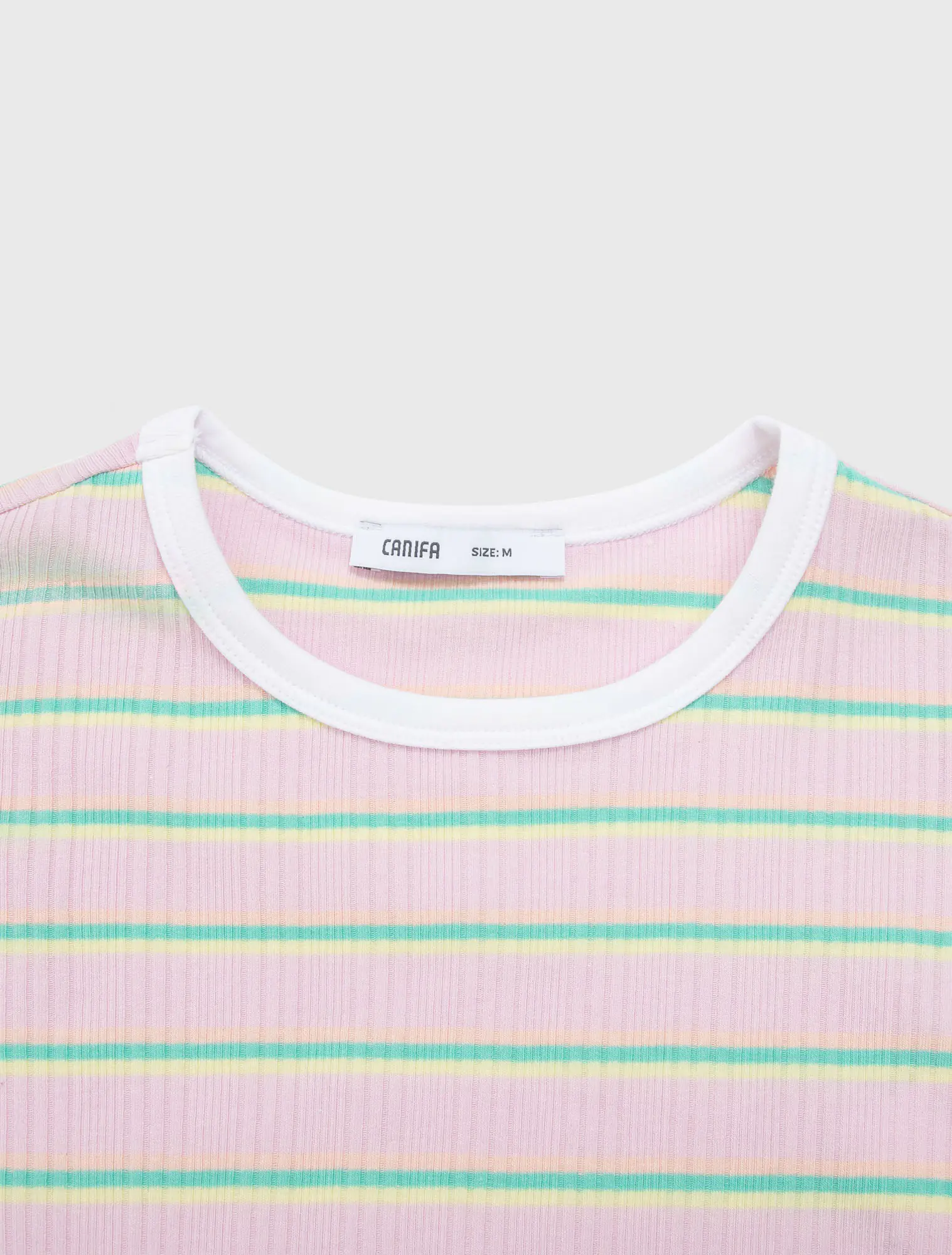 Áo phông nữ cổ tròn dáng ôm, bề mặt vải dệt rib kẻ nhiều tone màu, dễ lựa chọn và dễ kết hợp với nhiều sản phẩm khác nhau.