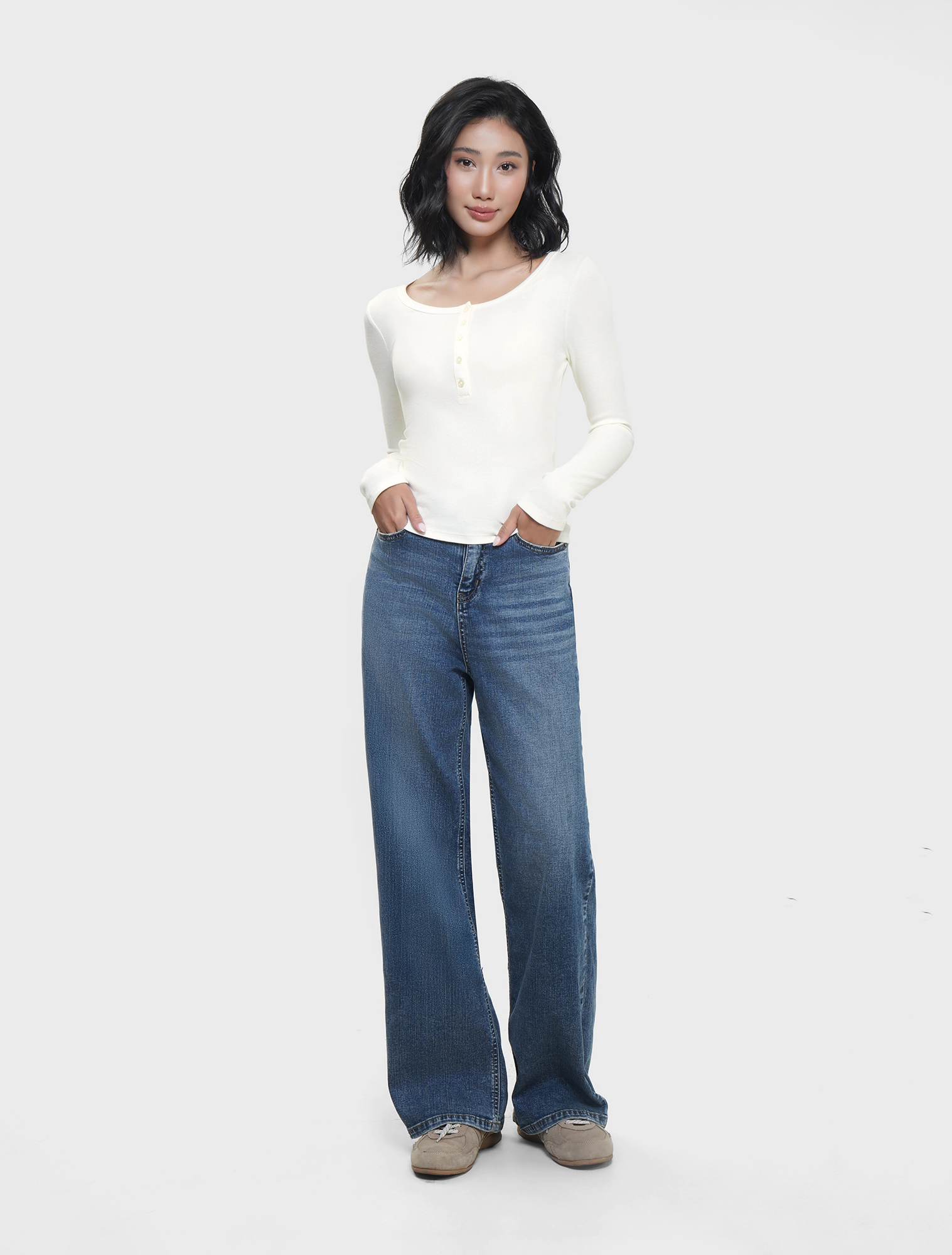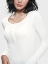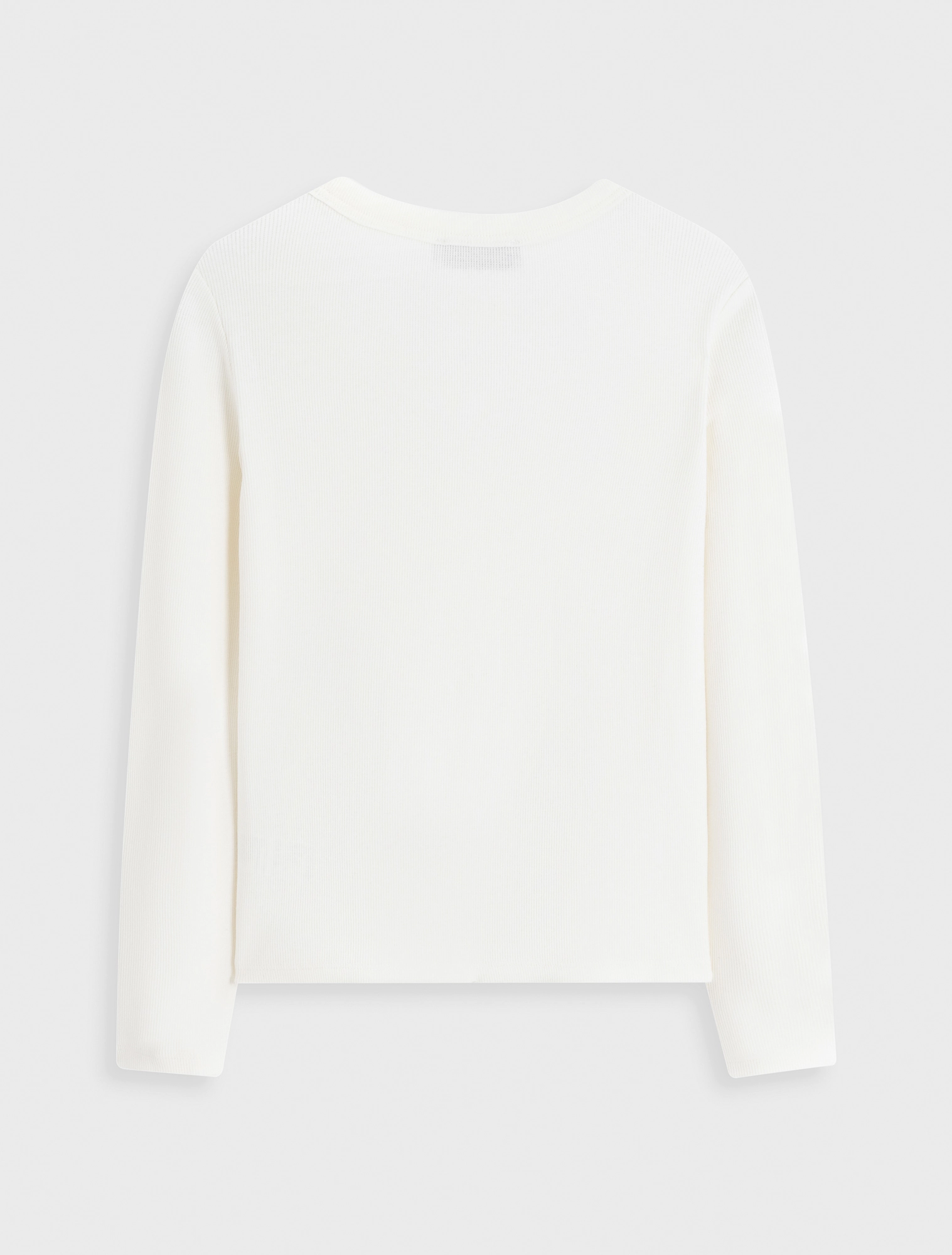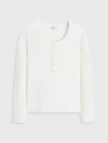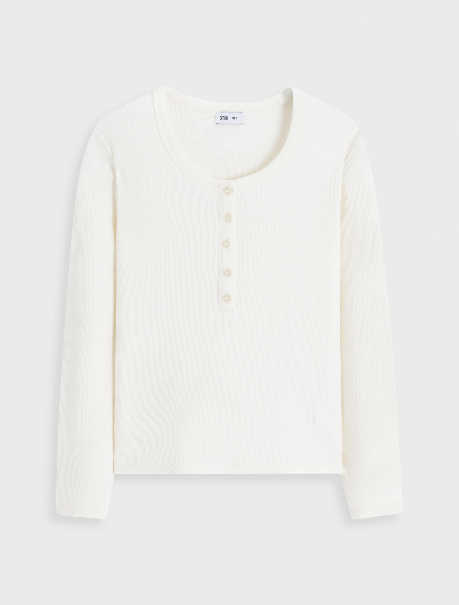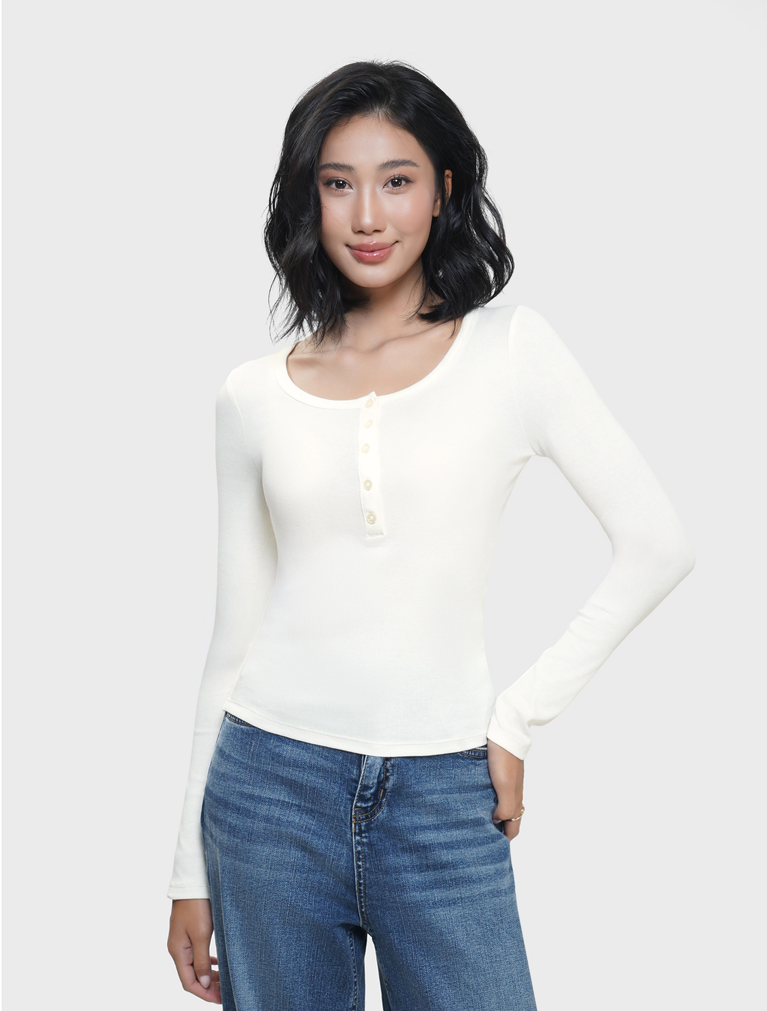 Áo phông nữ dài tay cổ kiểu cài cúc, dáng ôm với chất liệu dệt rib co dãn thoải mái mềm mại khi sử dụng.