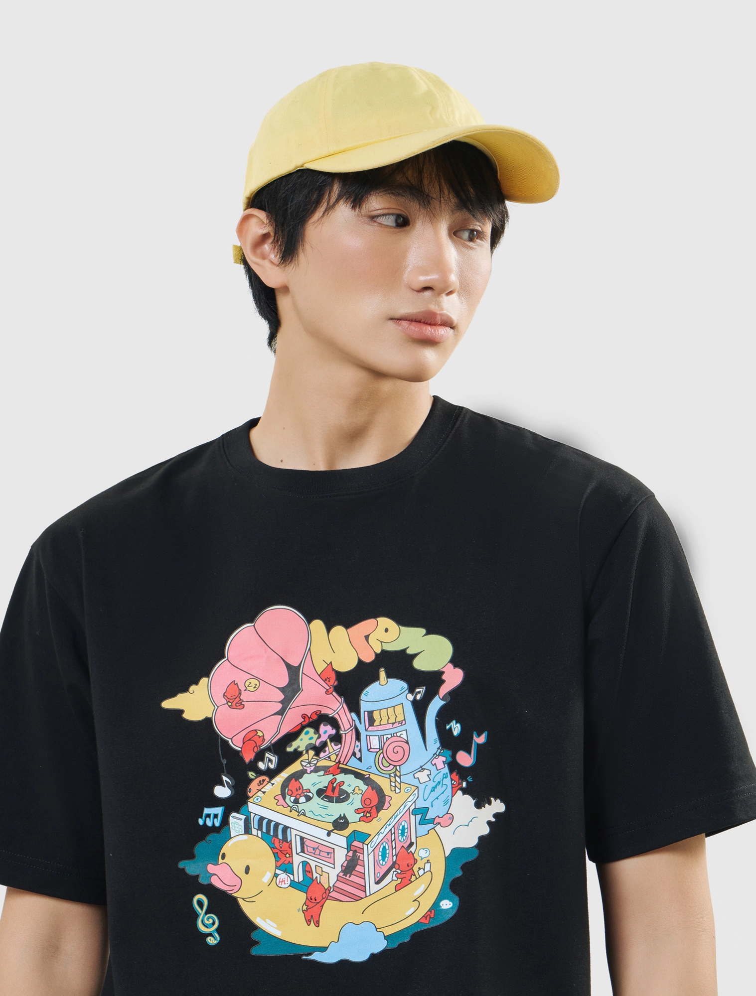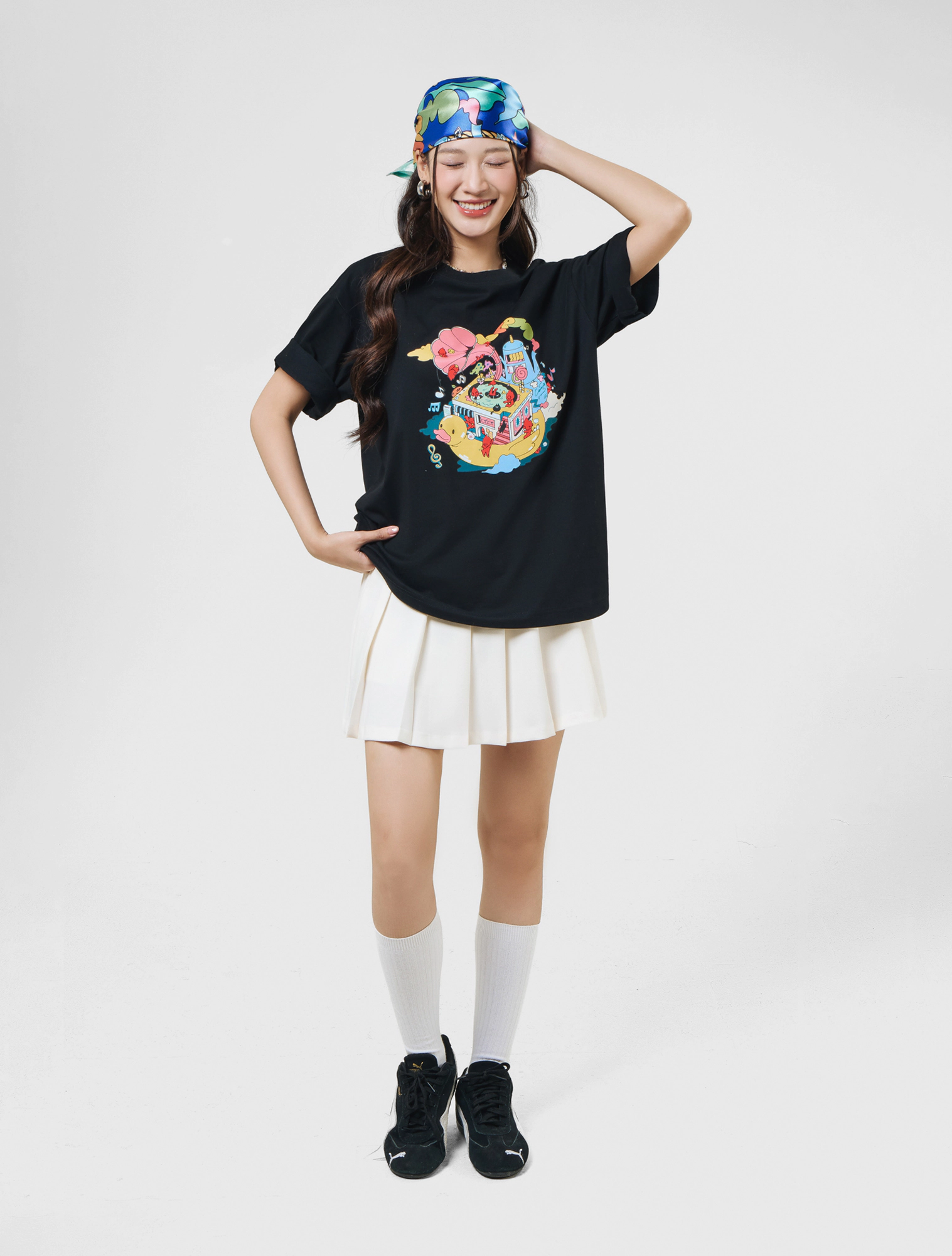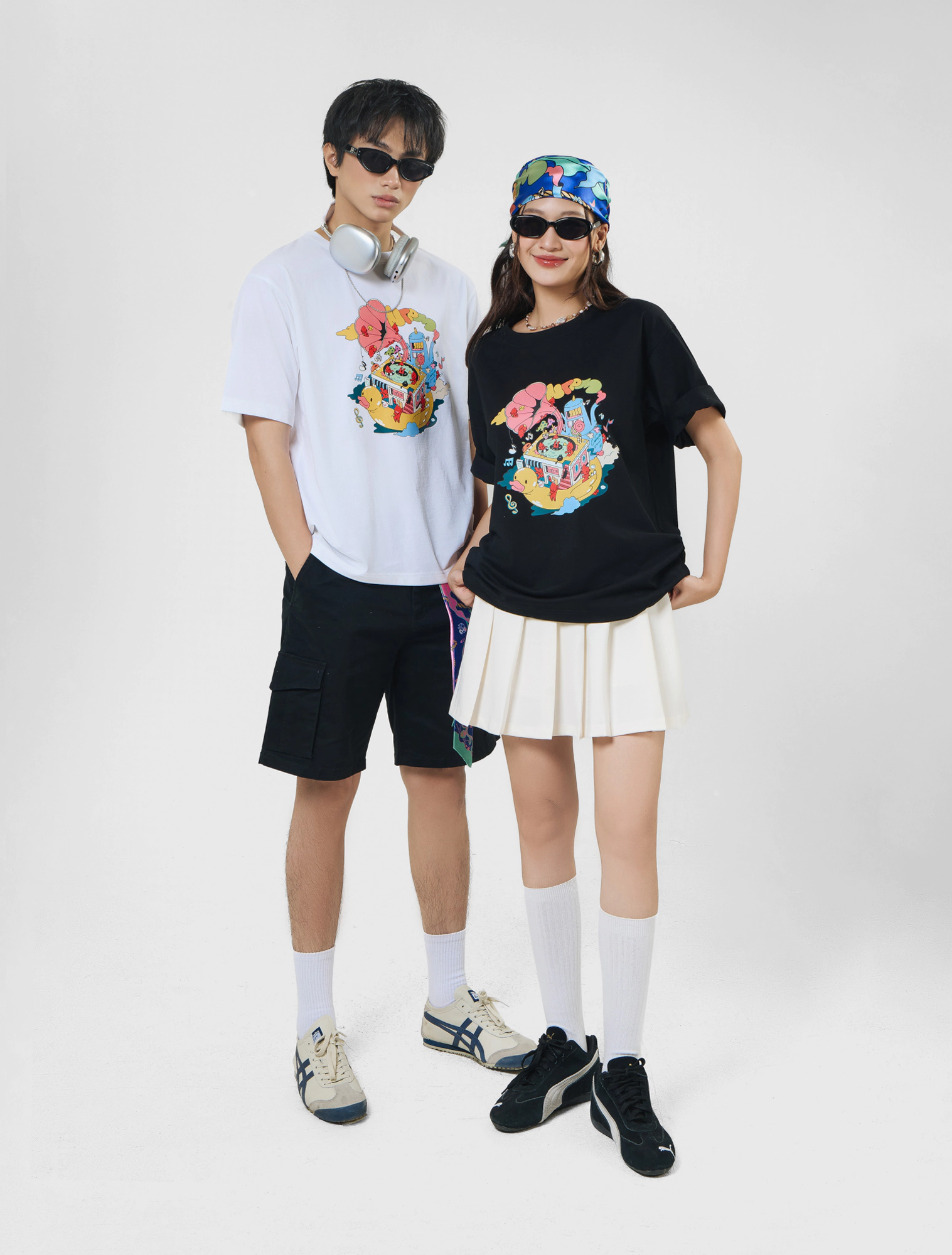 Áo phông với artwork thành phố mơ màng trôi giữa mây và sóng nhạc, kết hợp bảng màu tươi sáng mang hơi thở pop-art, tạo nên thiết kế trẻ trung, phóng khoáng cho những tâm hồn yêu tự do giữa nhịp sống đô thị.