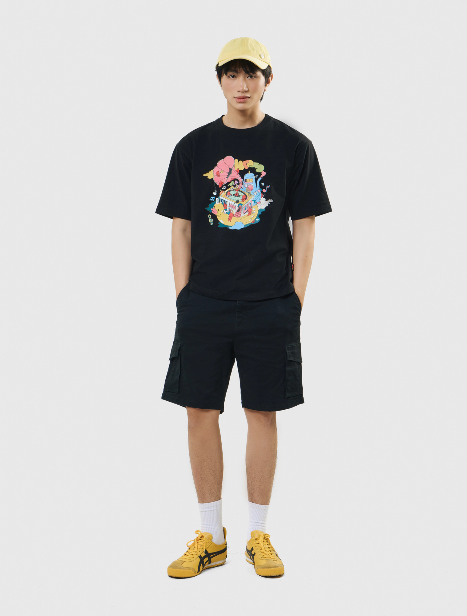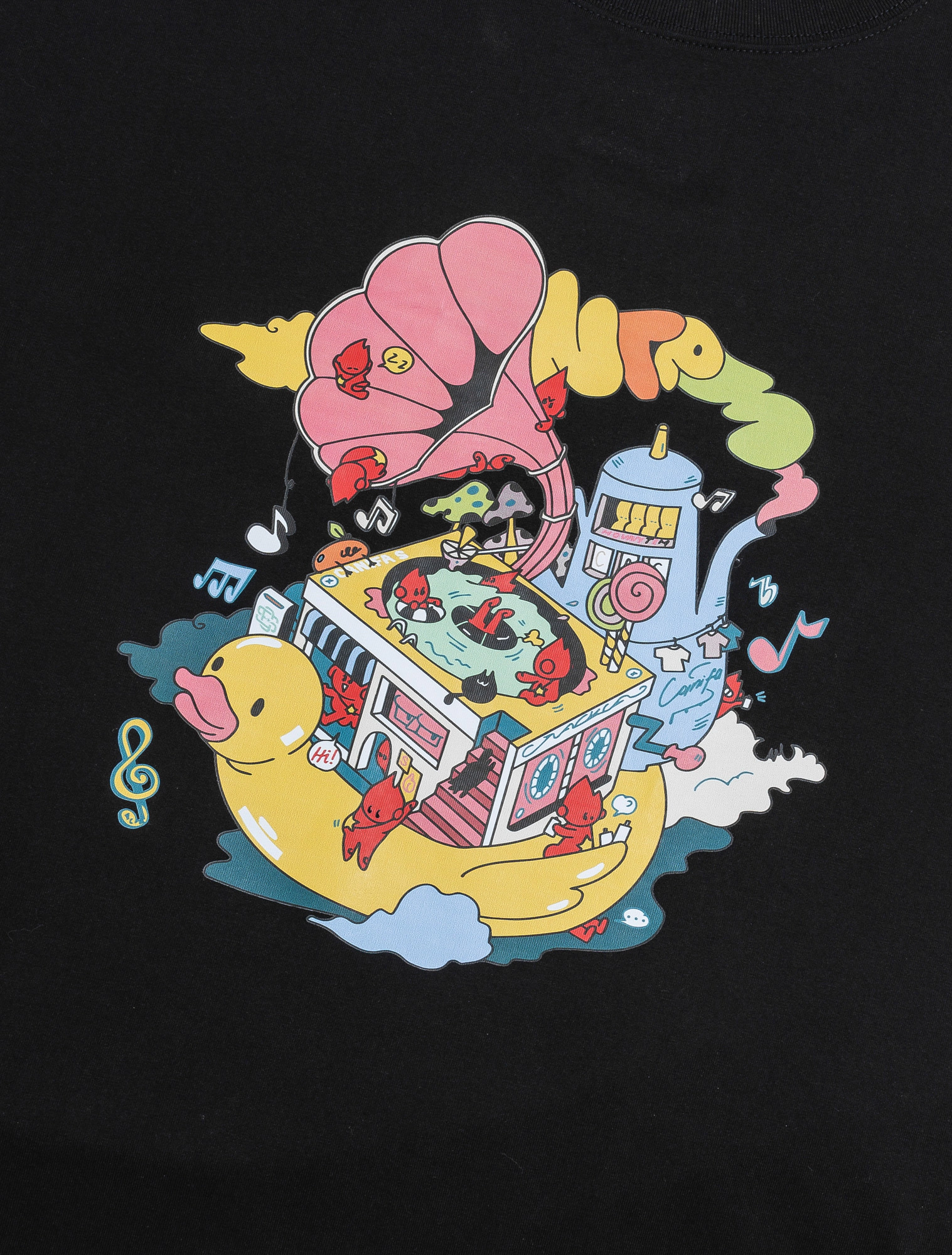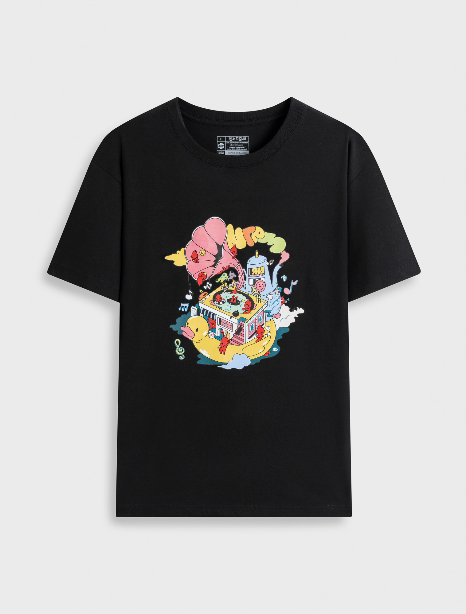 Áo phông với artwork thành phố mơ màng trôi giữa mây và sóng nhạc, kết hợp bảng màu tươi sáng mang hơi thở pop-art, tạo nên thiết kế trẻ trung, phóng khoáng cho những tâm hồn yêu tự do giữa nhịp sống đô thị.