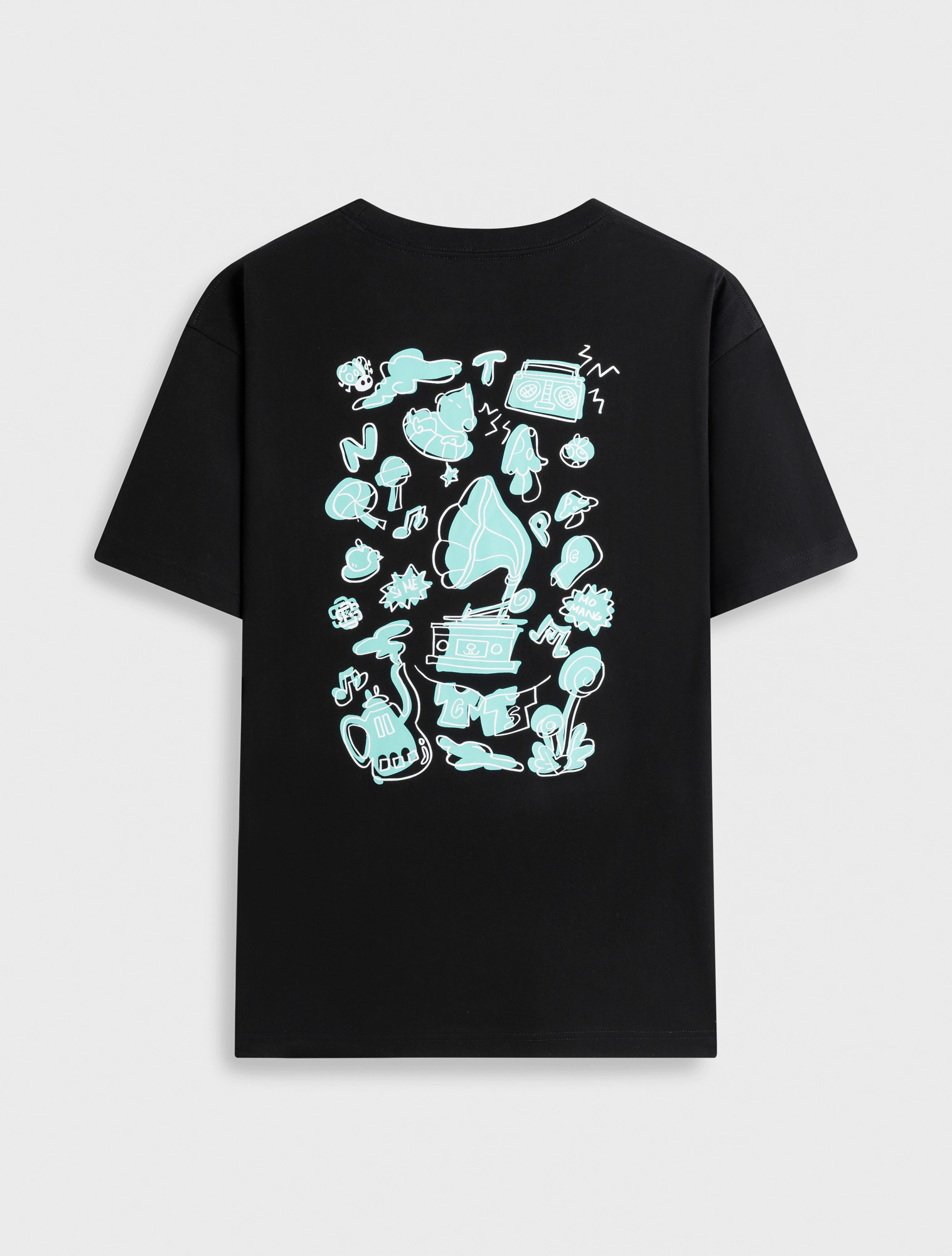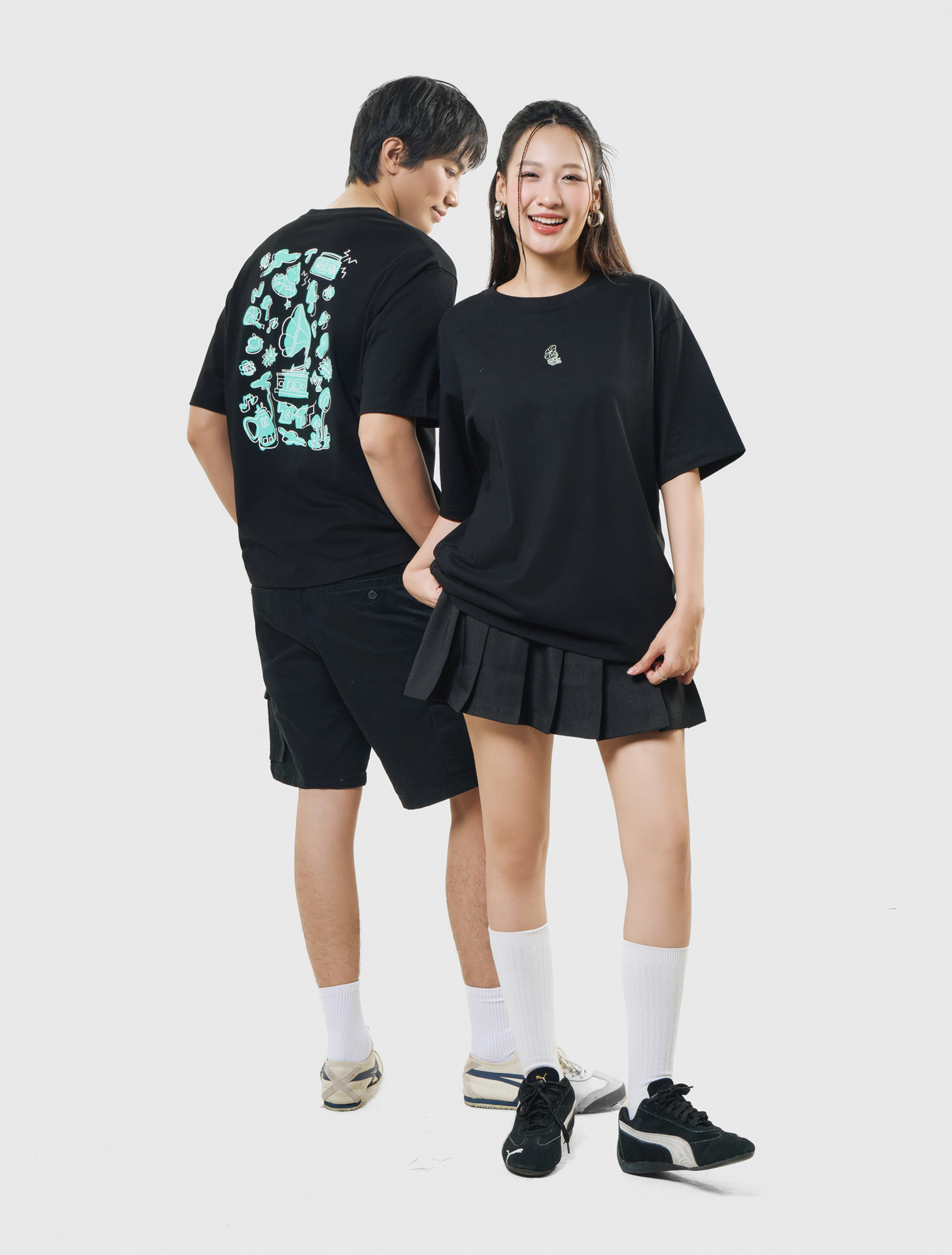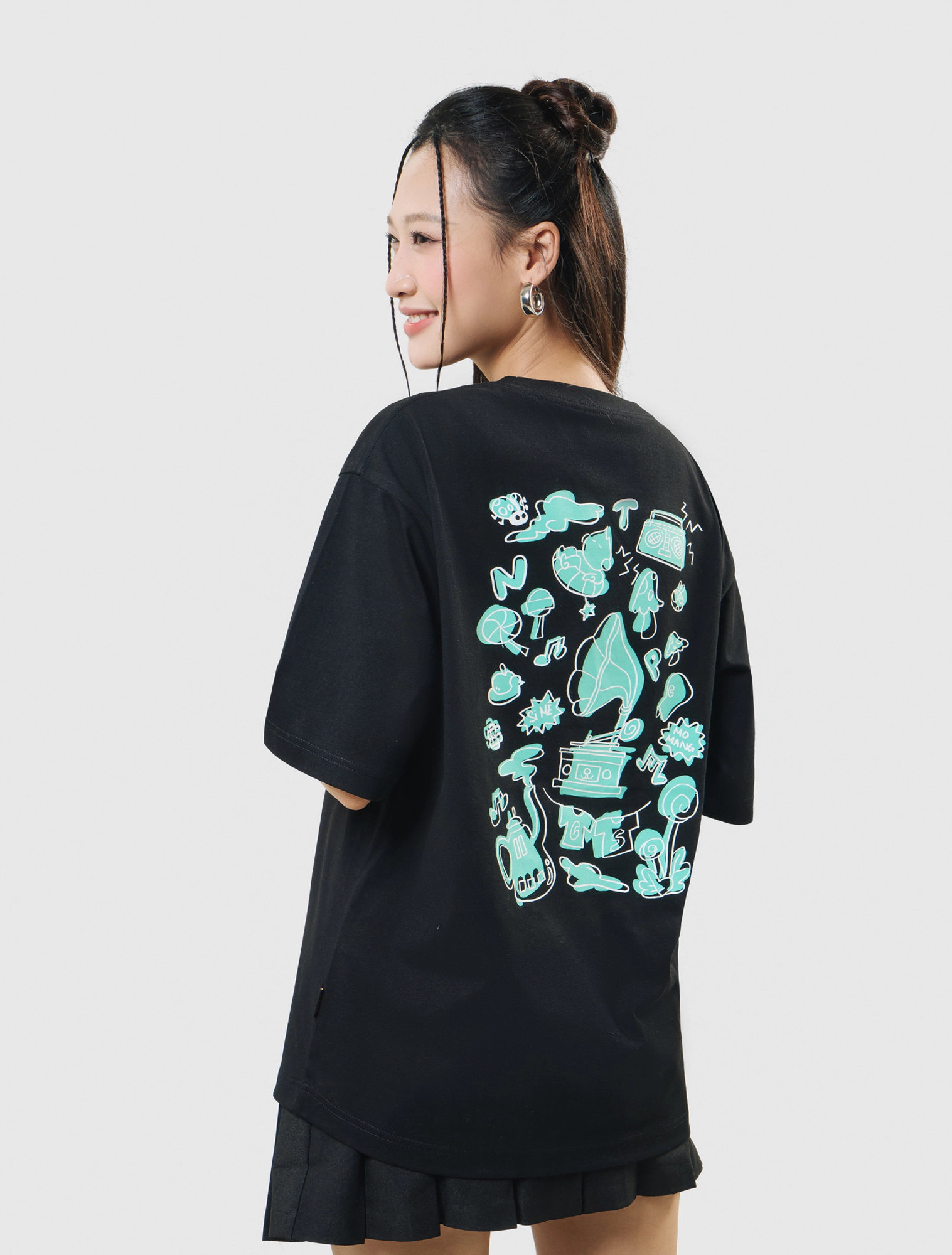 Áo phông với artwork thành phố mơ màng trôi giữa mây và sóng nhạc, kết hợp bảng màu tươi sáng mang hơi thở pop-art, tạo nên thiết kế trẻ trung, phóng khoáng cho những tâm hồn yêu tự do giữa nhịp sống đô thị.