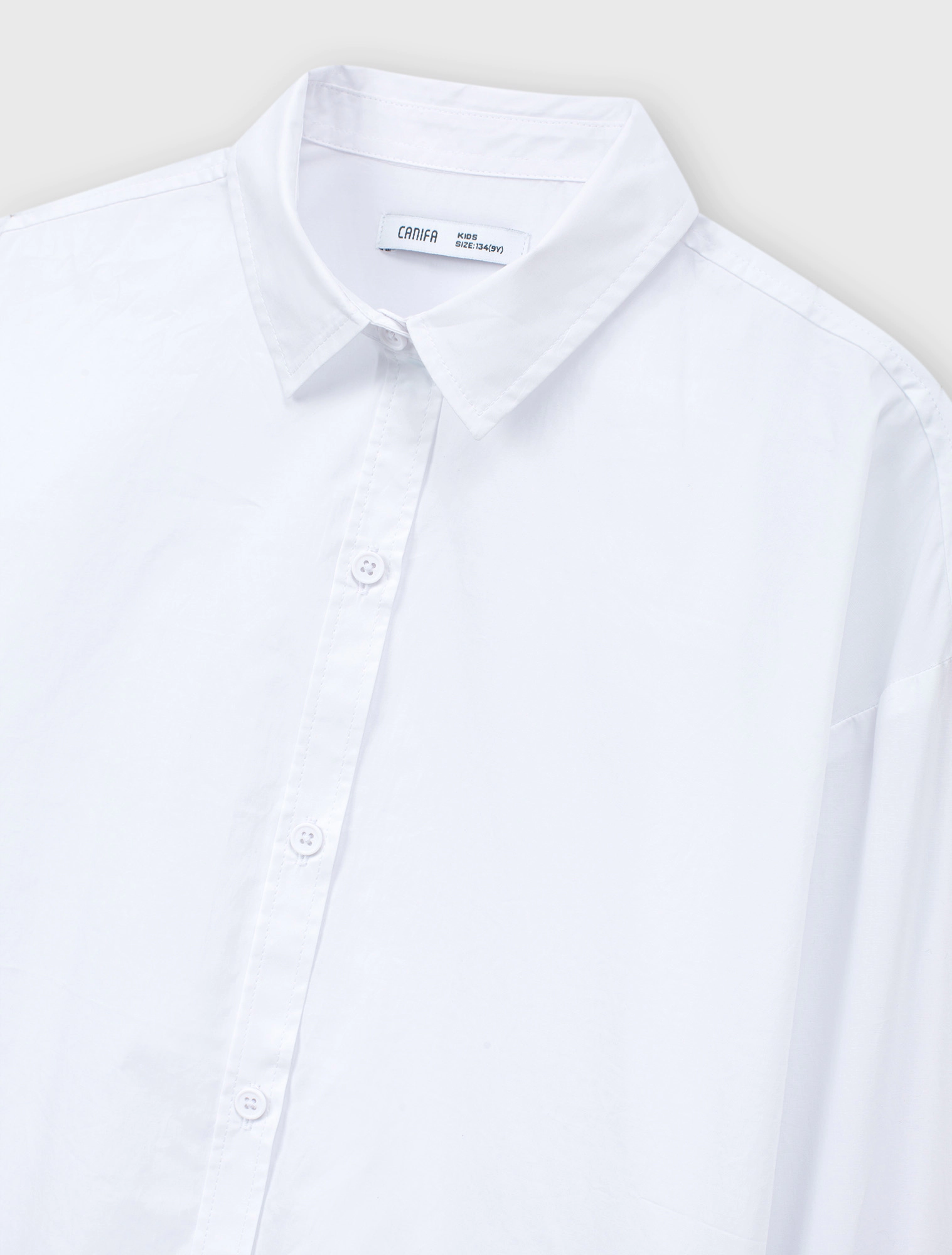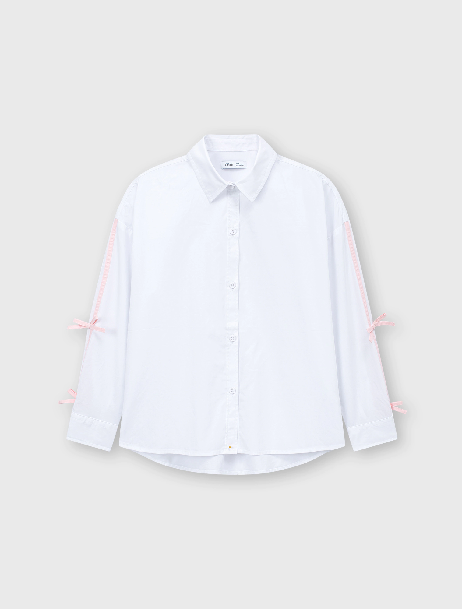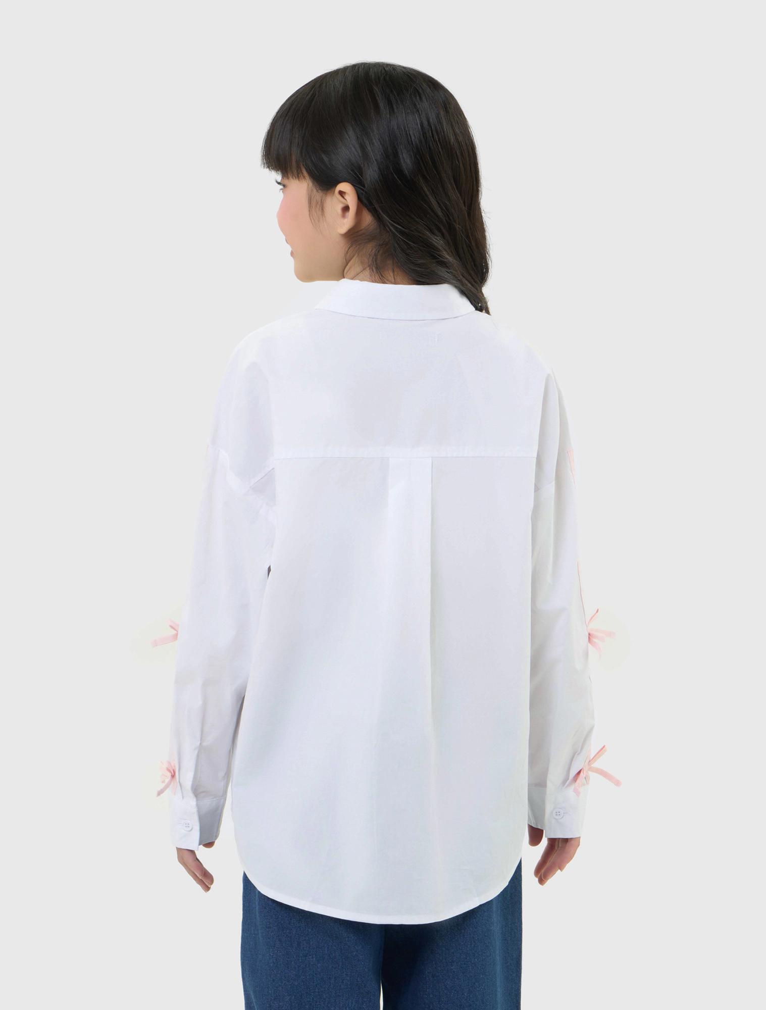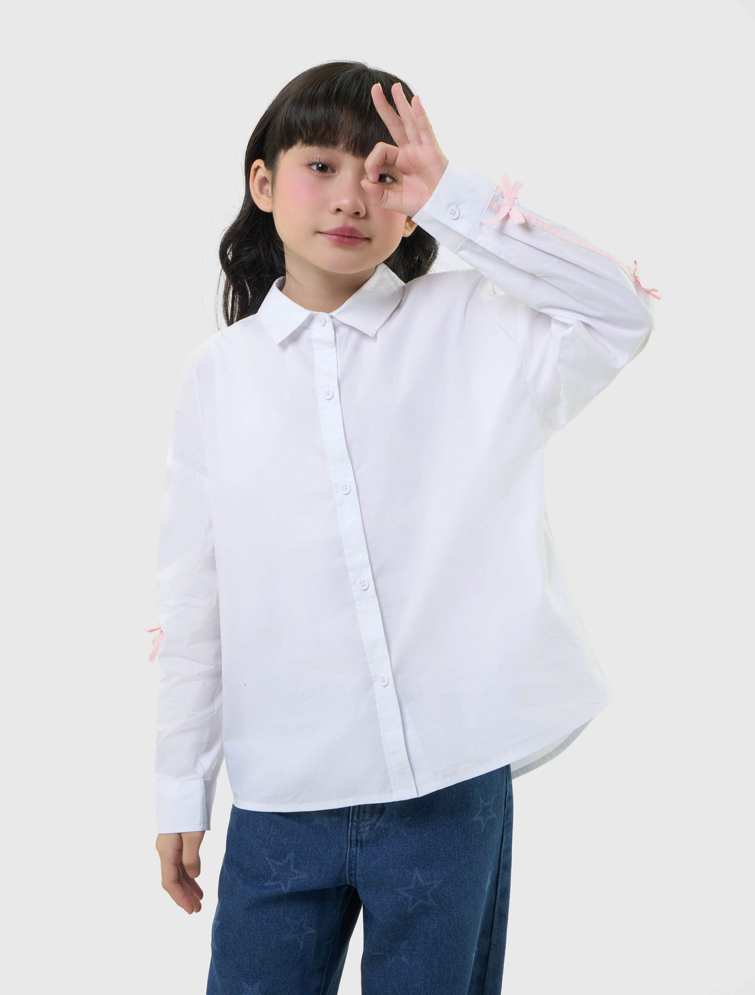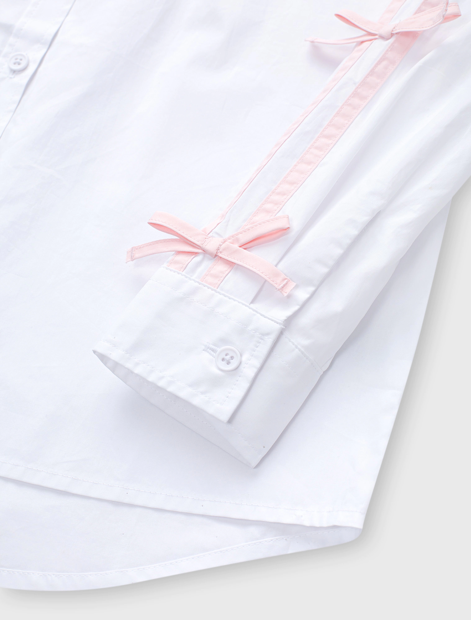 Áo sơ mi bé gái kiểu thời trang. Áo cổ đức, tay dài có đính nơ, vạt cong. Chất liệu cotton thoải mái dễ vận động.