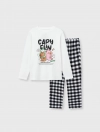 Bộ mặc nhà bé gái có hình in | Oeko-Tex. Áo dài tay vải dệt kim mềm mại kết hợp quần dài dệt thoi kẻ hiện đại. Phom dáng cơ bản dễ mặc. Màu sắc, hình in nữ tính phù hợp các hoạt động nghỉ ngơi cho bé gái.