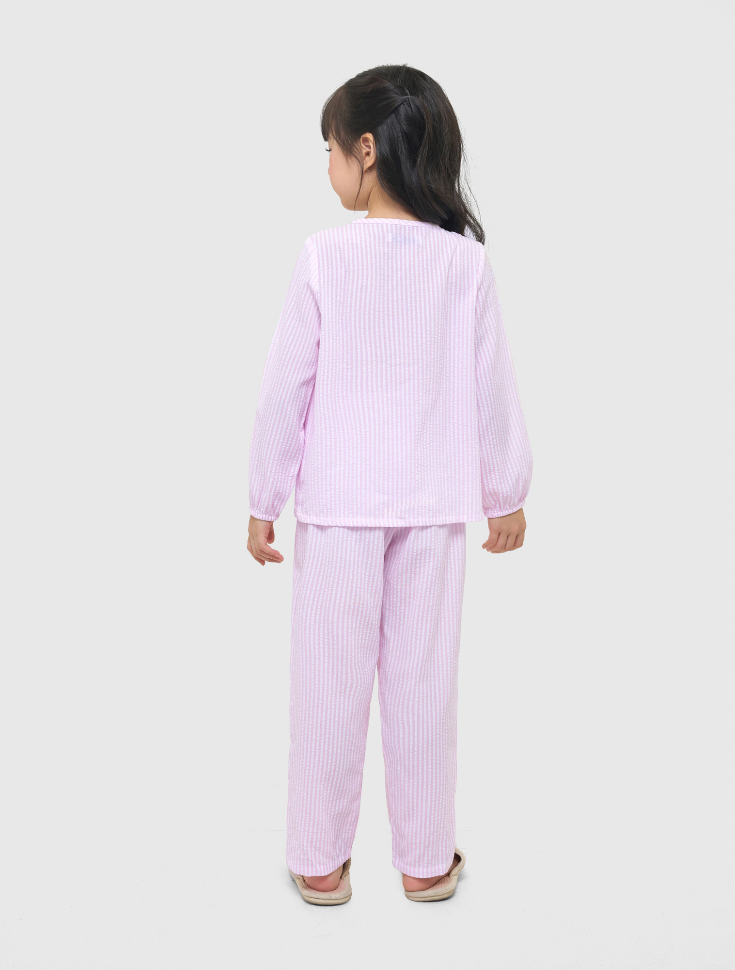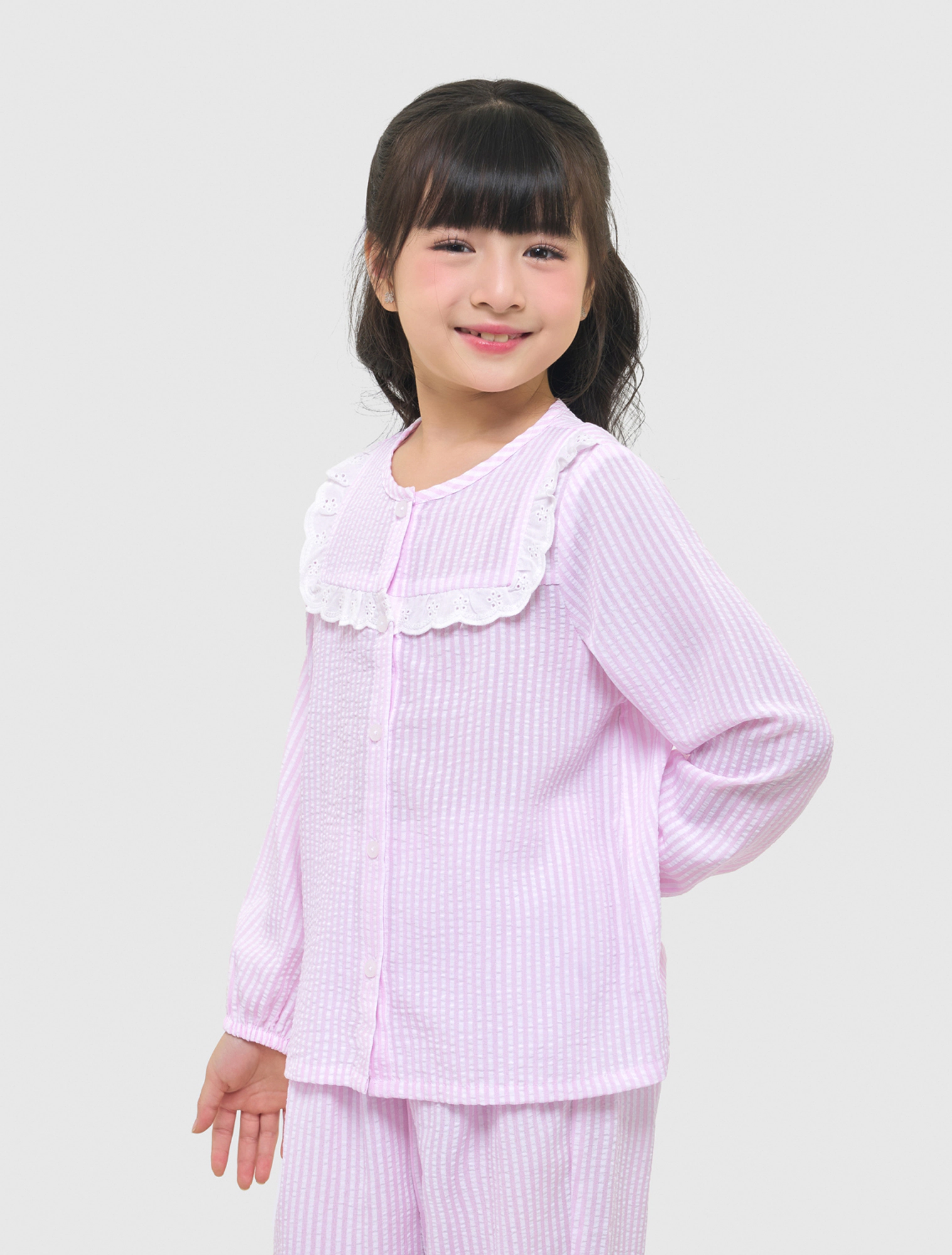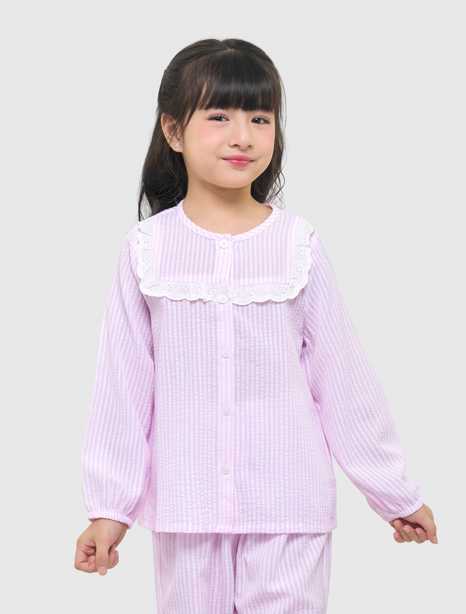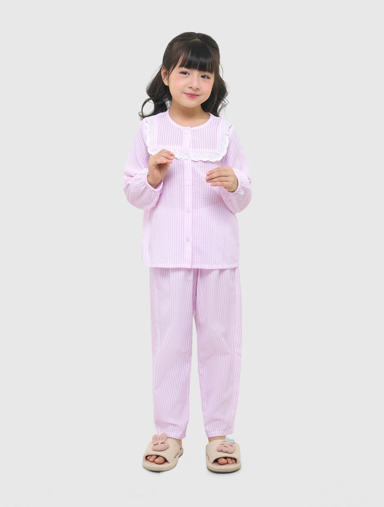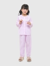 Bộ mặc nhà bé gái thu đông, phom dáng cơ bản dễ mặc. Quần dài, áo dài tay cổ tròn, ngực kẹp bèo ren trang trí nữ tính. Màu sắc, họa tiết tươi sáng, đáng yêu, phù hợp các hoạt động nghỉ ngơi cho bé gái. Nguyên liệu cotton pha mềm mại, dễ chịu