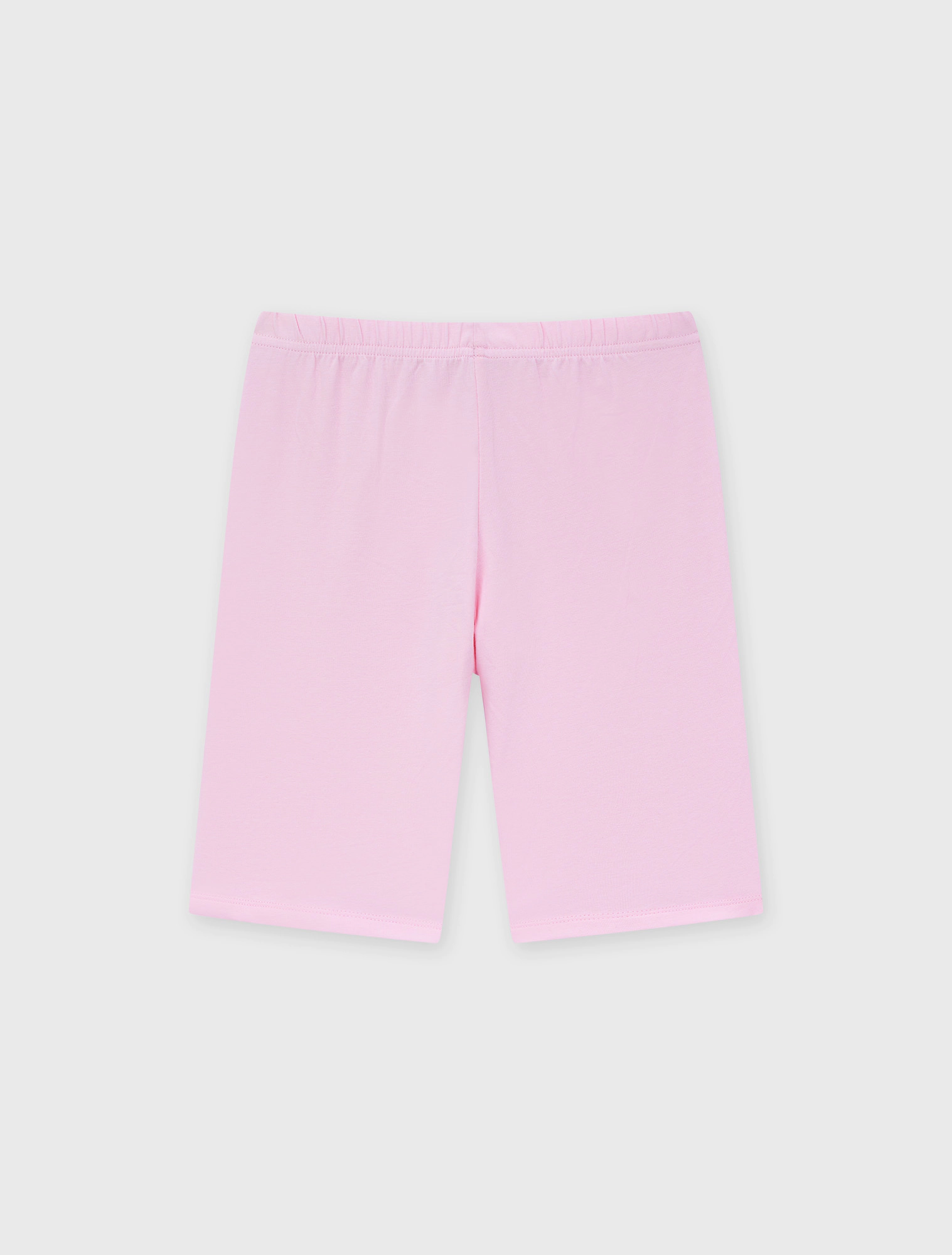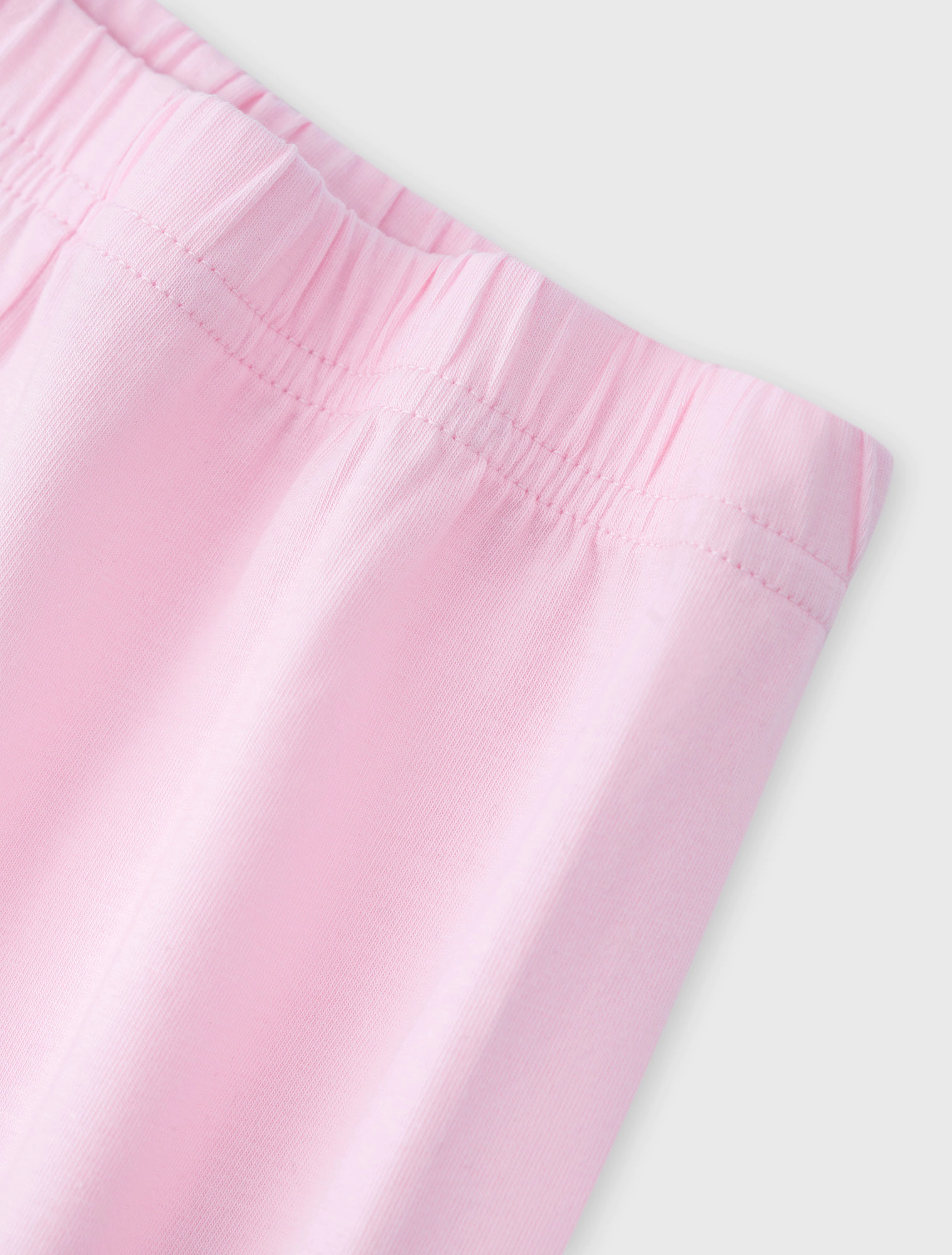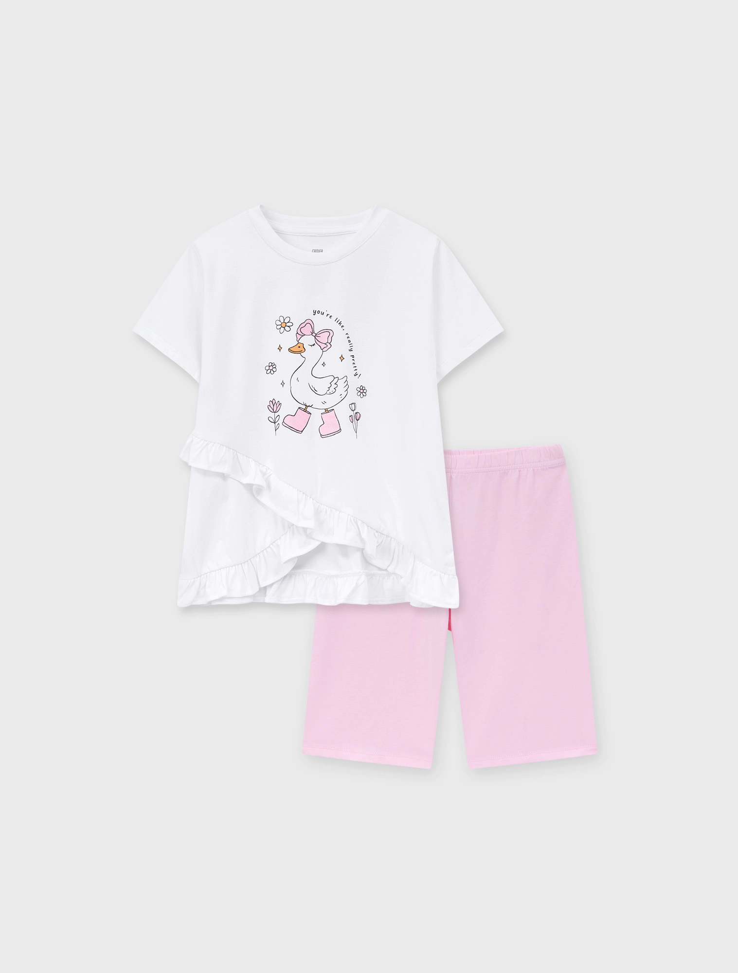 Bộ mặc nhà bé gái có hình in, thân áo nhún bèo nữ tính, phom áo thoải mái, quần legging ngắn, ôm vừa.