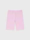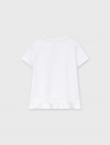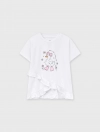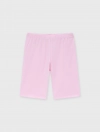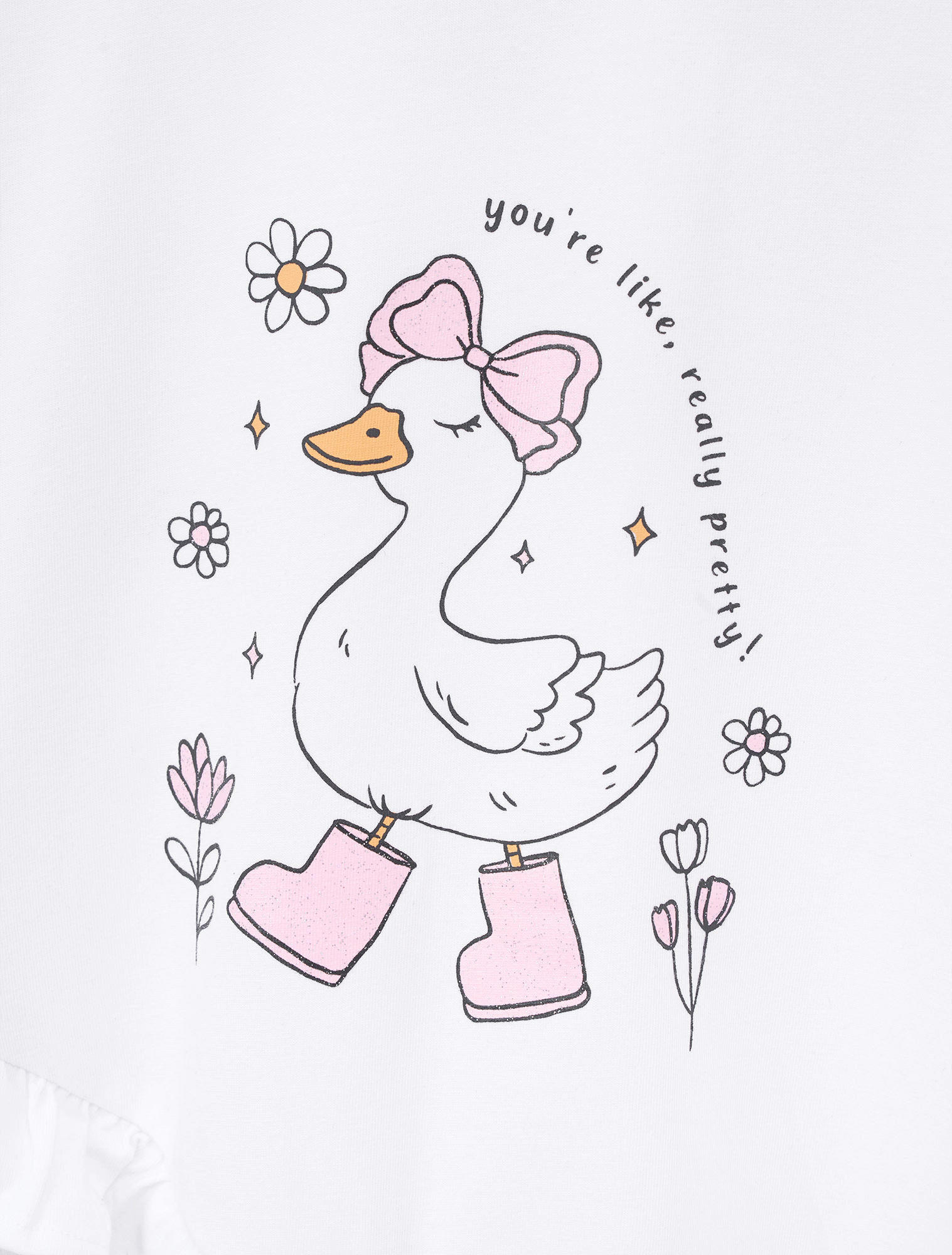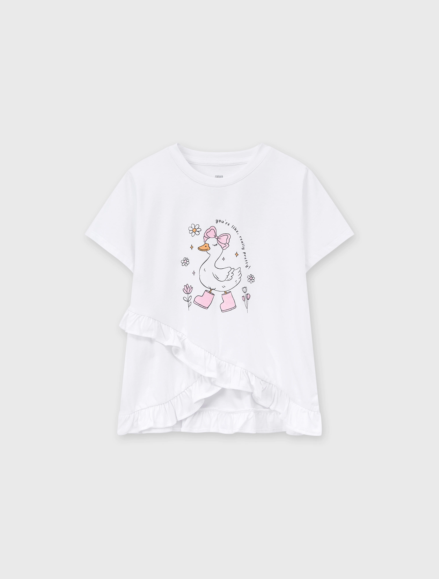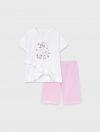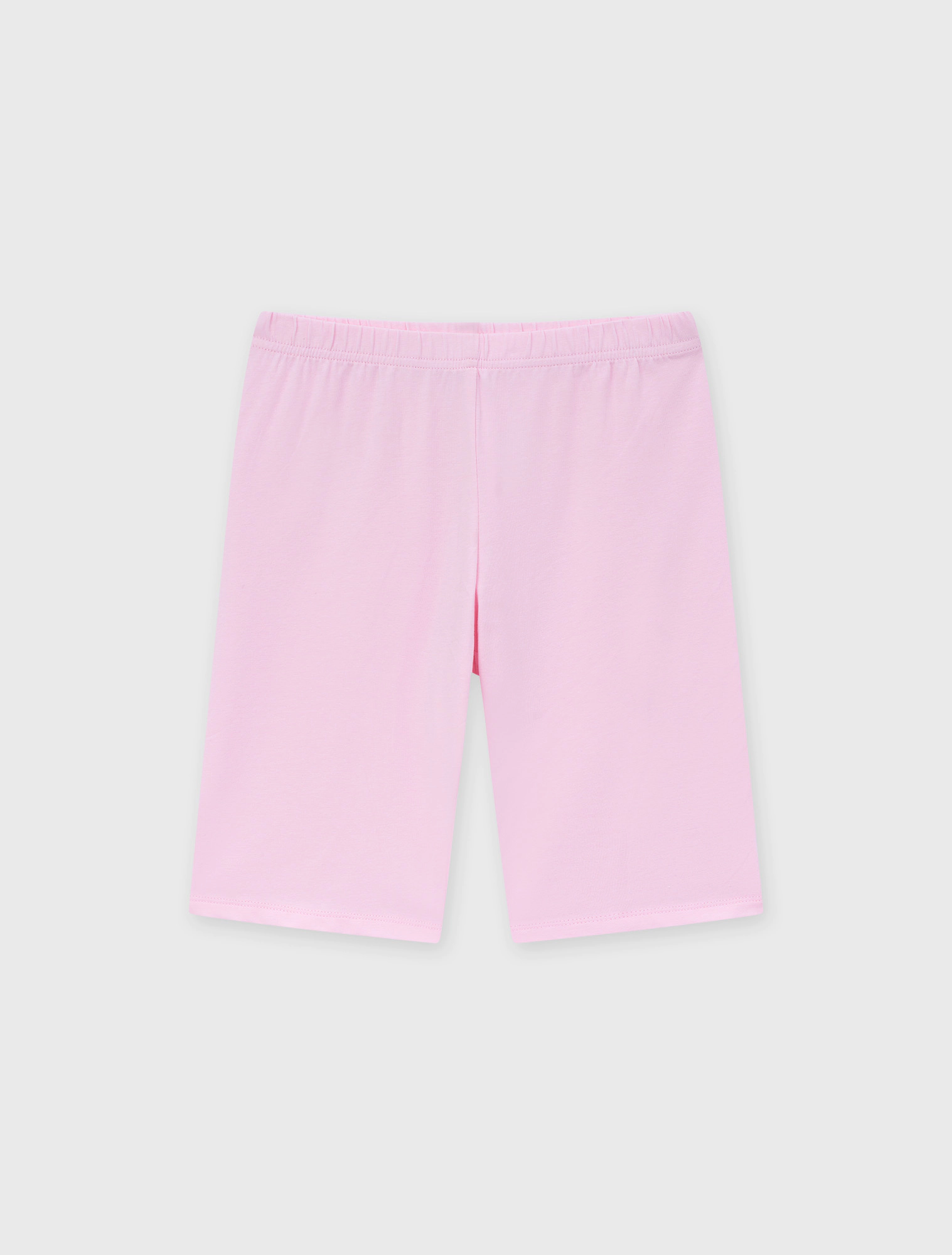 Bộ mặc nhà bé gái có hình in, thân áo nhún bèo nữ tính, phom áo thoải mái, quần legging ngắn, ôm vừa.