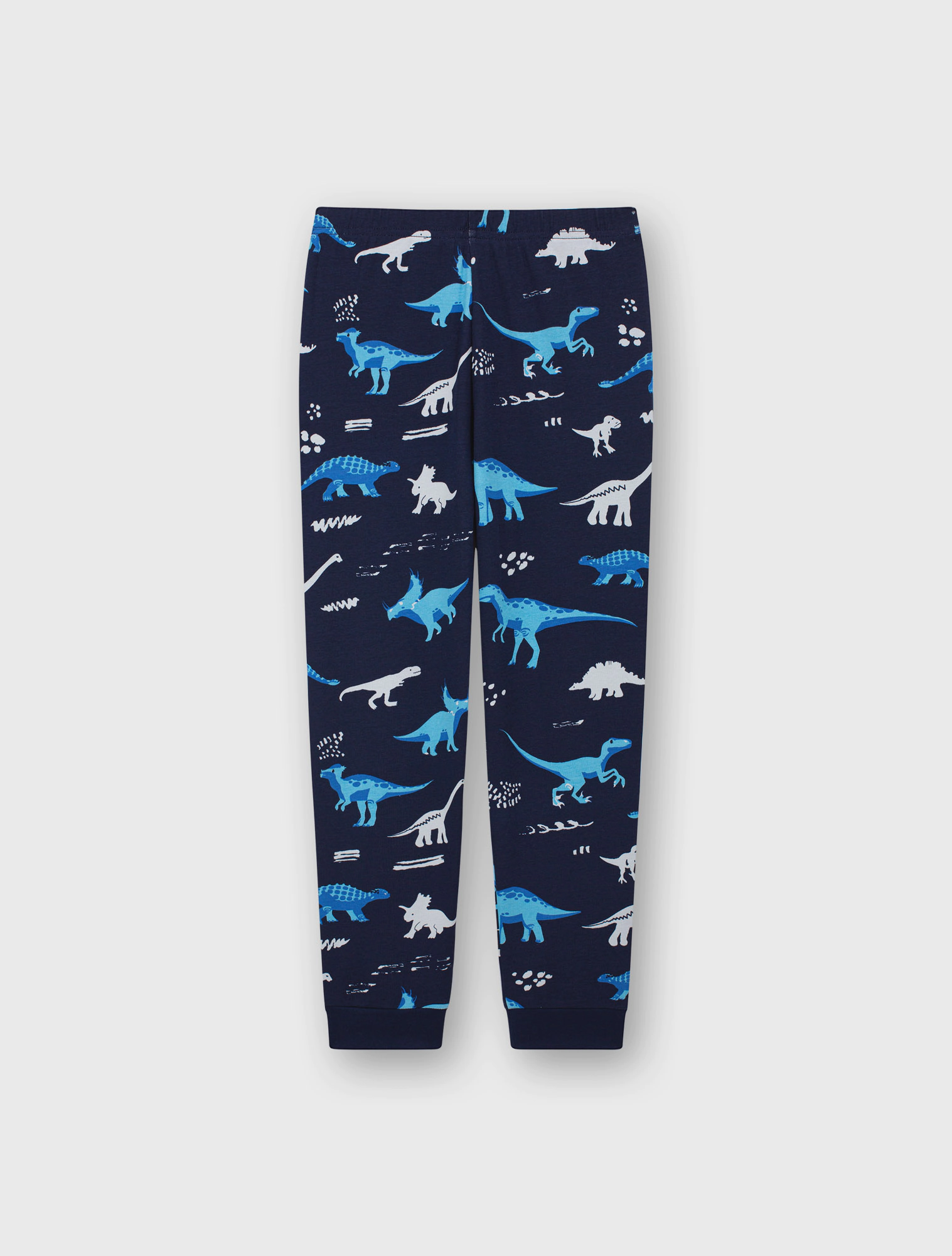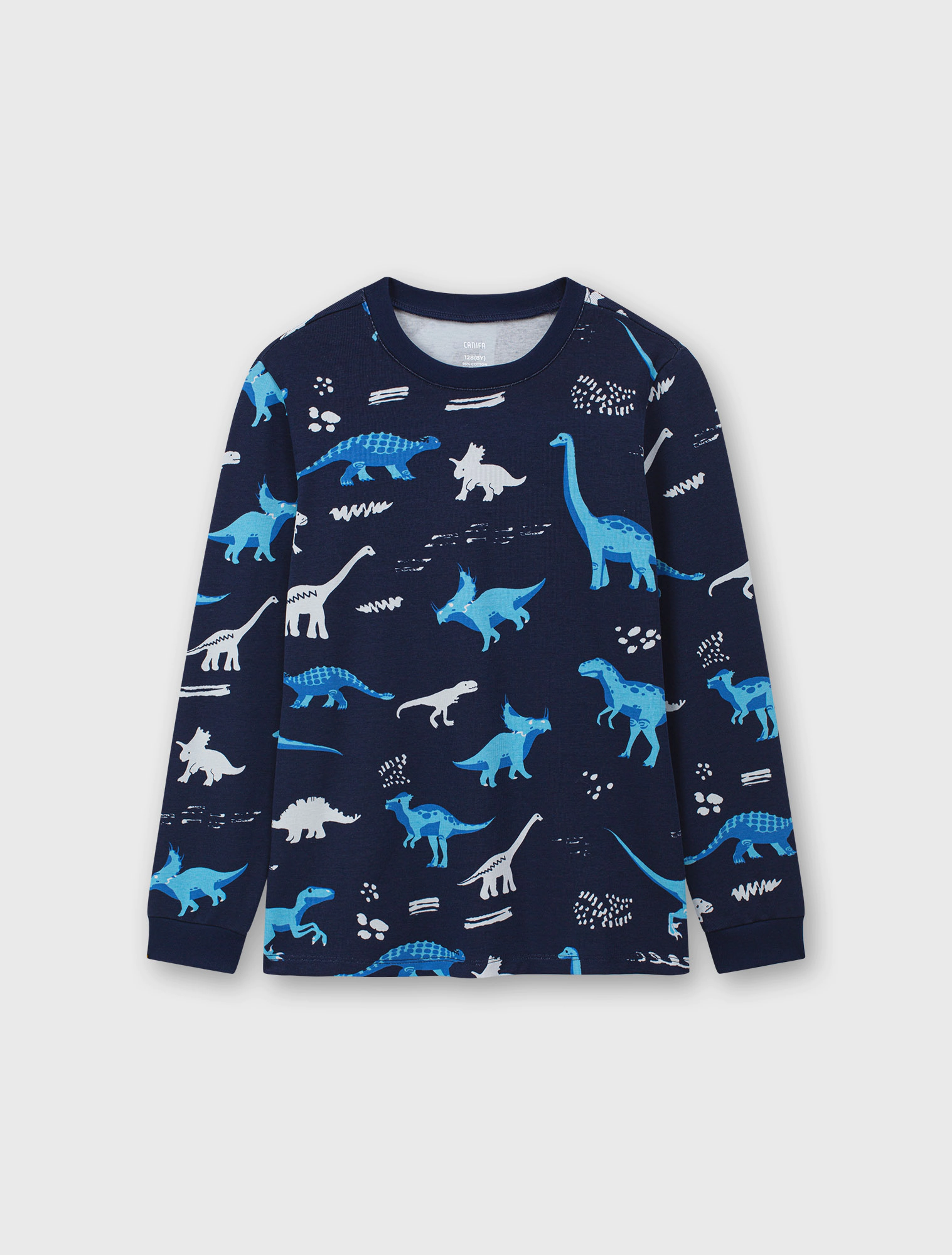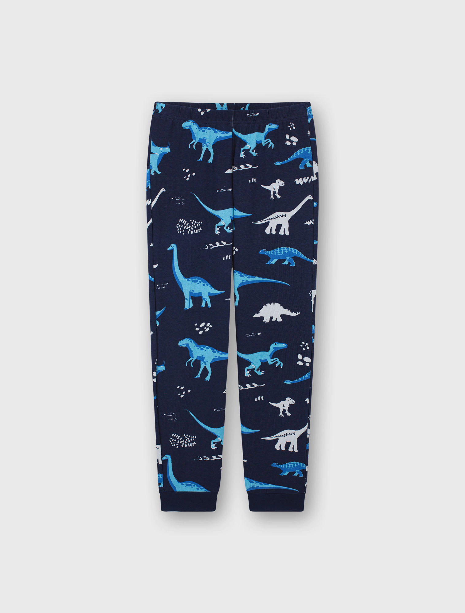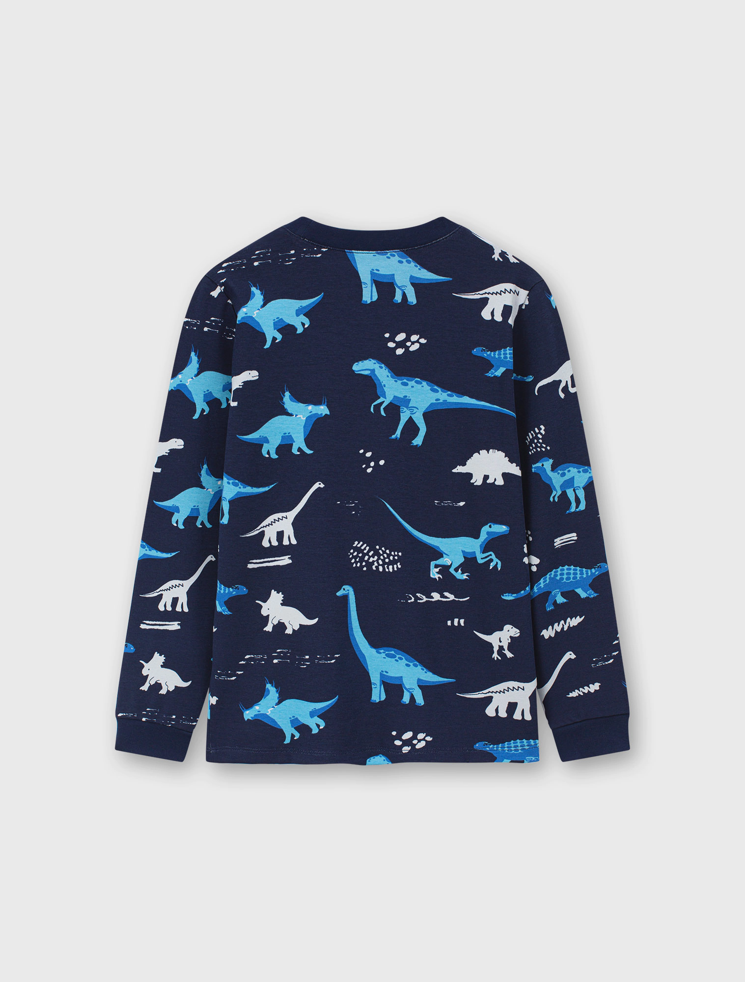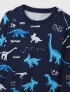 Bộ mặc nhà bé trai in tràn, chất liệu cotton pha spandex co giãn, hình in khủng long ngộ nghĩnh tạo sự thích thú cho các bé.