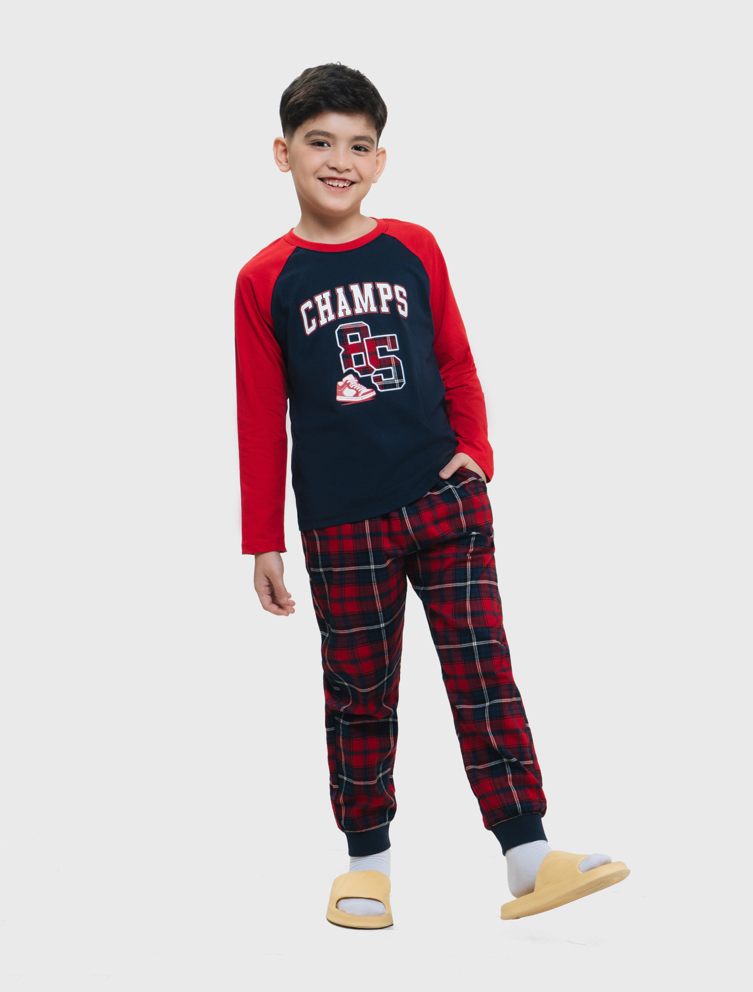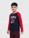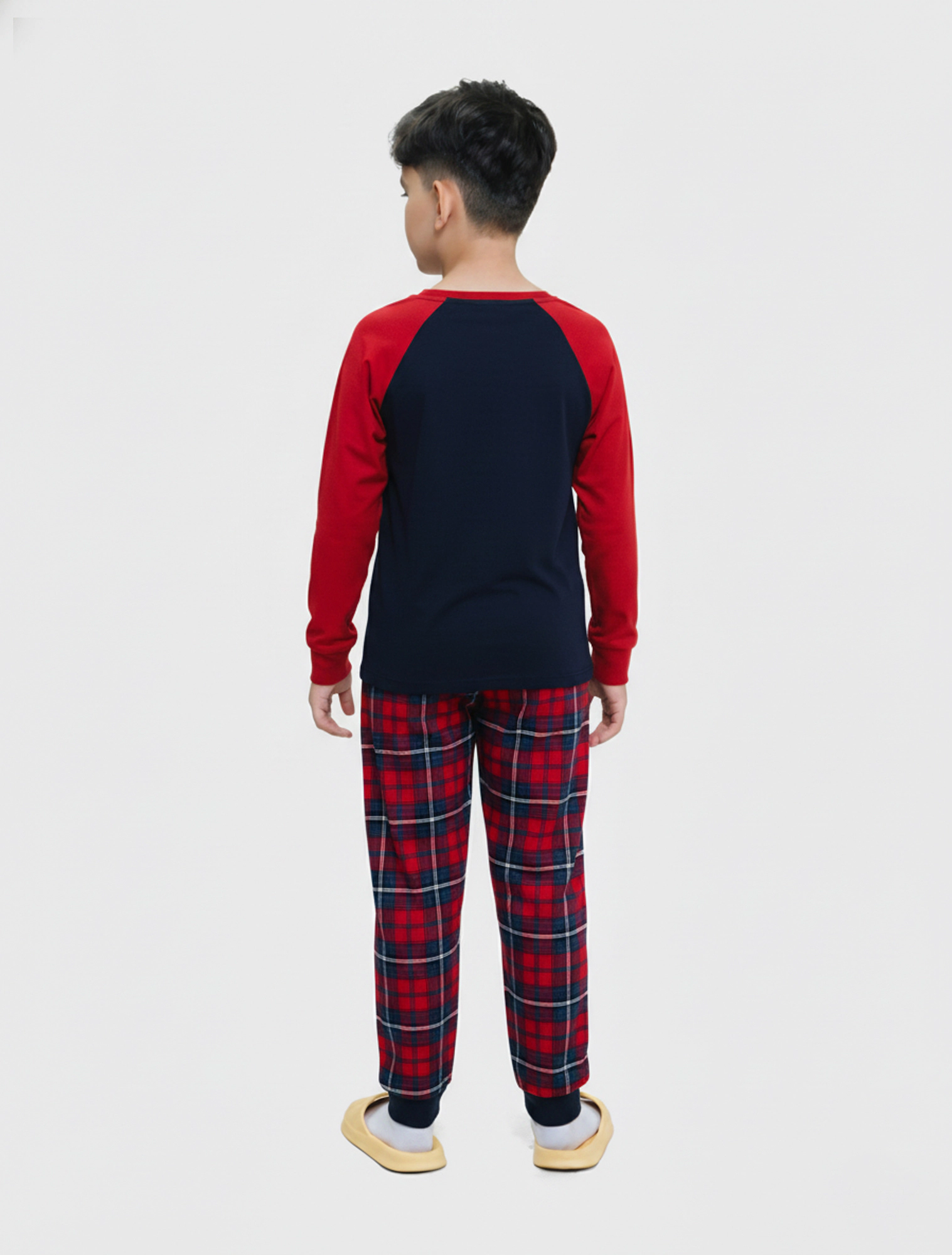 Bộ mặc nhà bé trai có hình in, áo cotton quần dệt thoi kẻ, phom dáng cơ bản dễ mặc hình in phù hợp với sở thích của trể nhỏ.