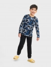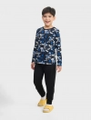 Bộ mặc nhà bé trai với thiết kế phom dáng cơ bản, áo dài tay cổ tròn kết hợp quần dài bo gấu dễ mặc.