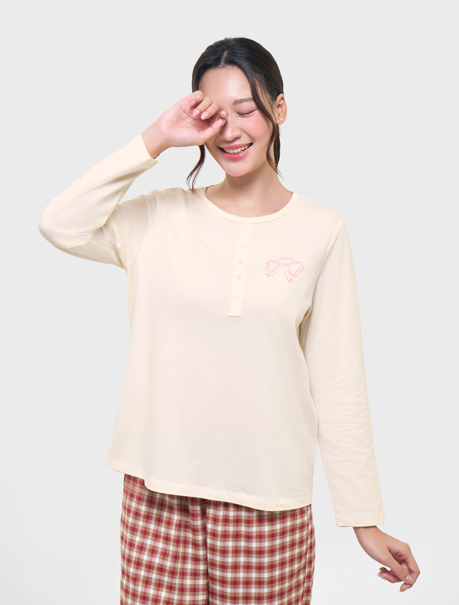 Bộ mặc nhà nữ có hình in,áo dài tay, quần dài dáng suông.