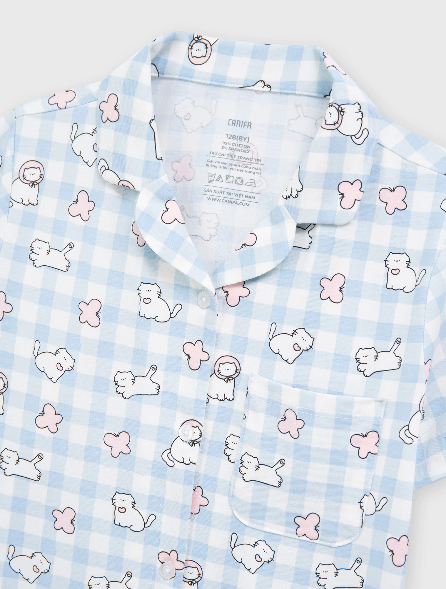 Bộ mặc nhà pyjama bé gái áo ngắn tay, quần shorts. Phom dáng cơ bản dễ mặc. Màu sắc và hình in tươi sáng, dễ thương.