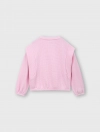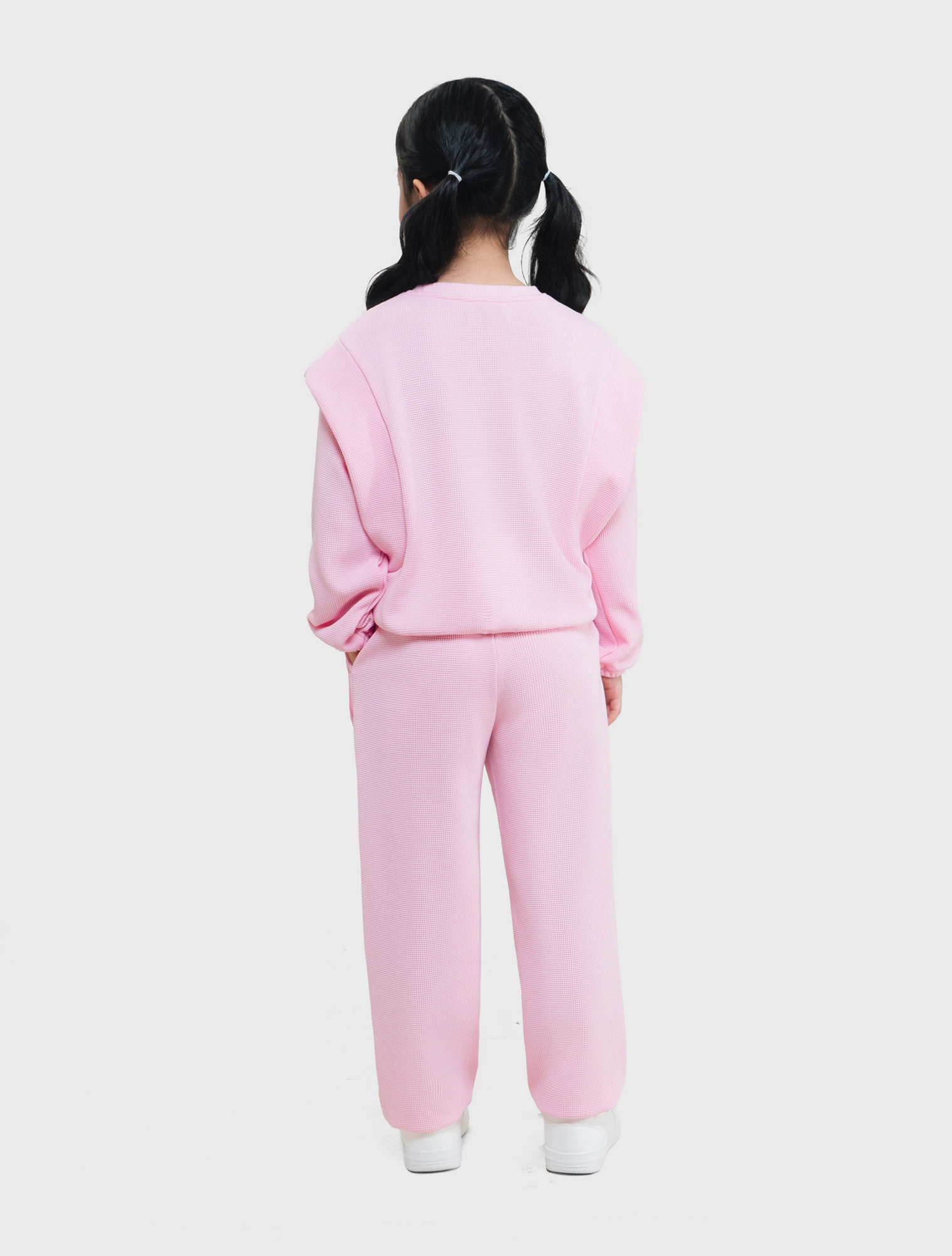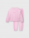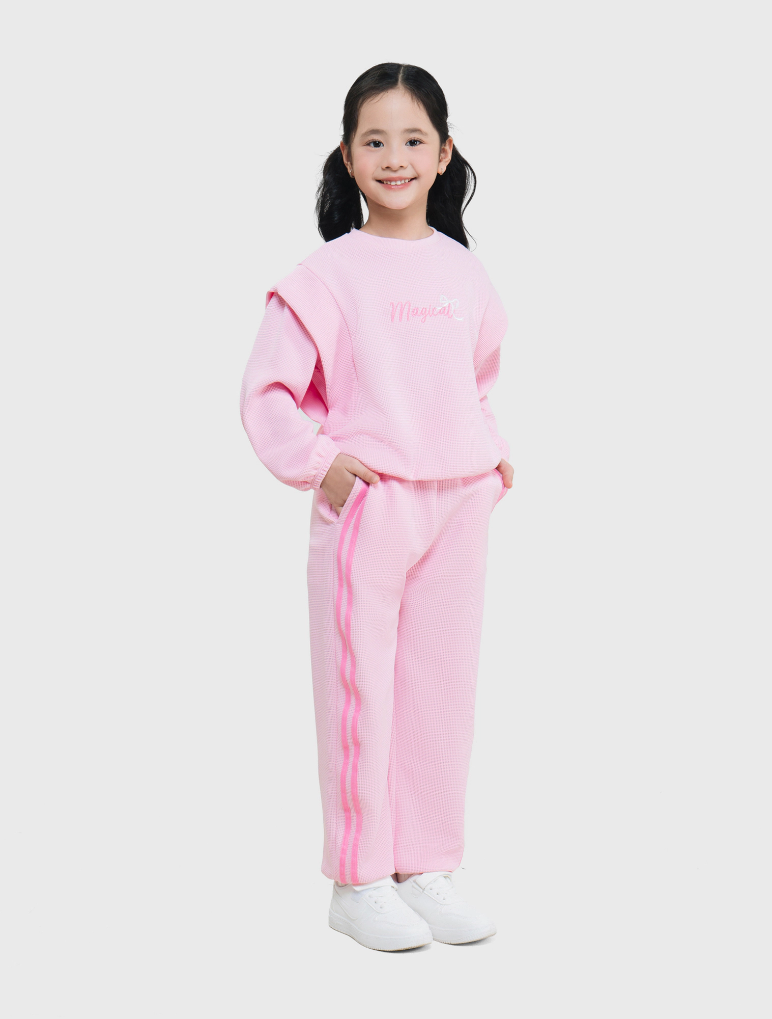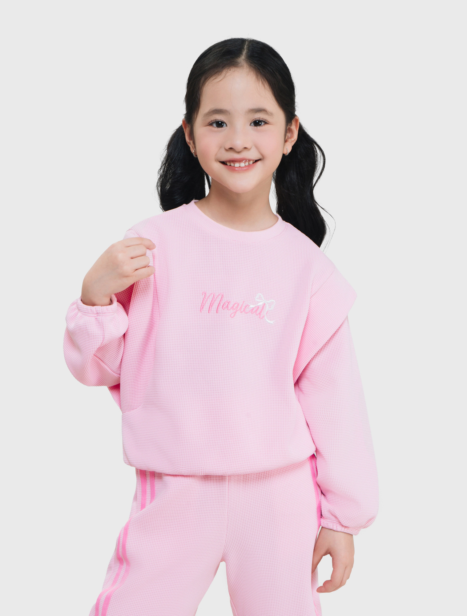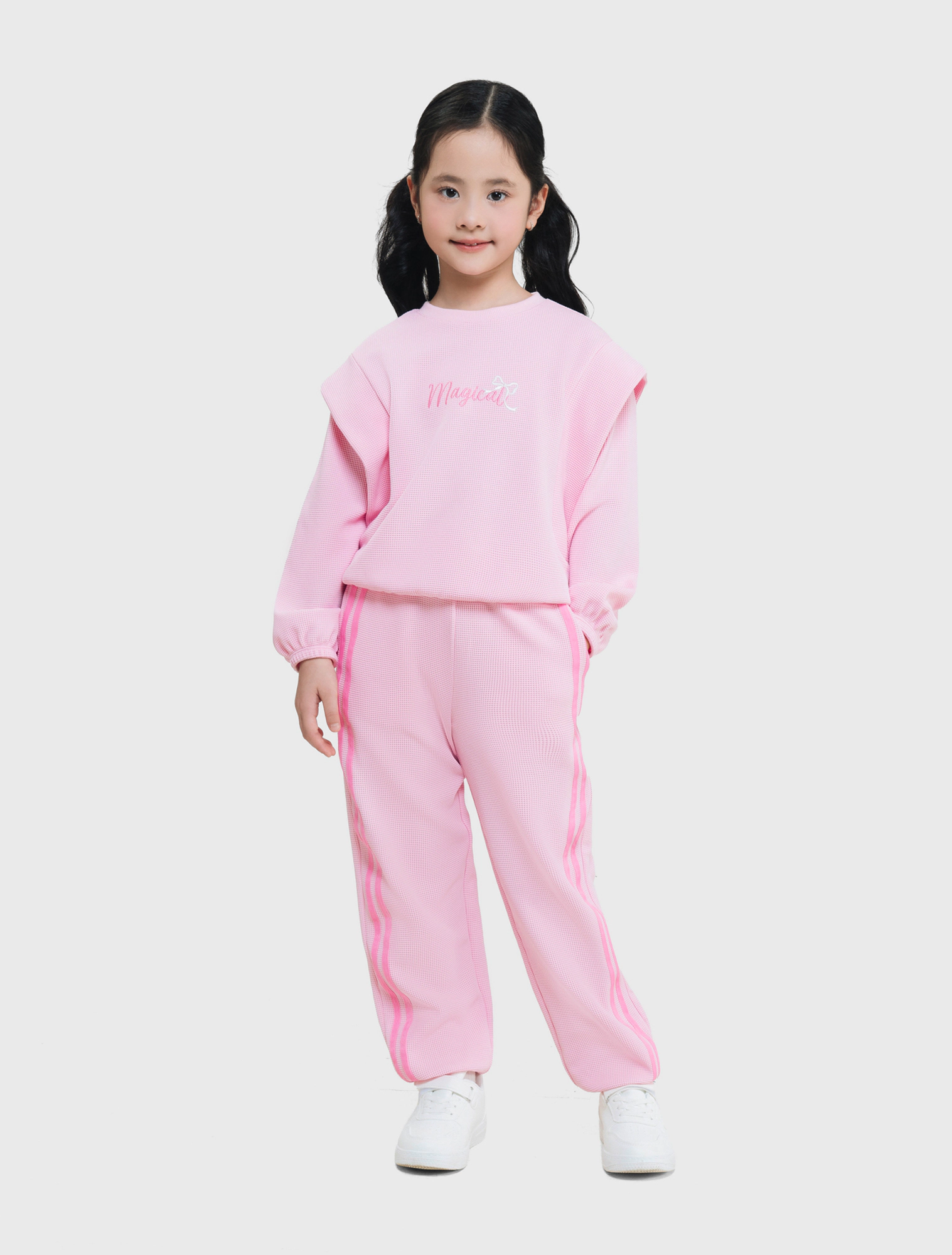 Bộ quần áo bé gái. Áo dài tay cổ tròn kết hợp quần bo chun gấu. Kết cấu vai áo ấn tượng, sườn quần đè dây dệt phối màu hiện đại. Màu sắc tươi sáng, hình in dễ thương phù hợp nhiều hoàn cảnh sử dụng cho bé gái. Chất liệu Polyester pha Spandex dày dặn, co giãn, giữ ấm tốt, bề mặt vải dệt kiểu mới lạ.
