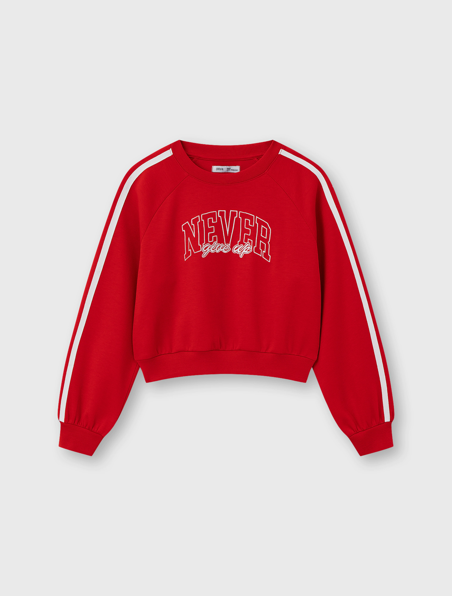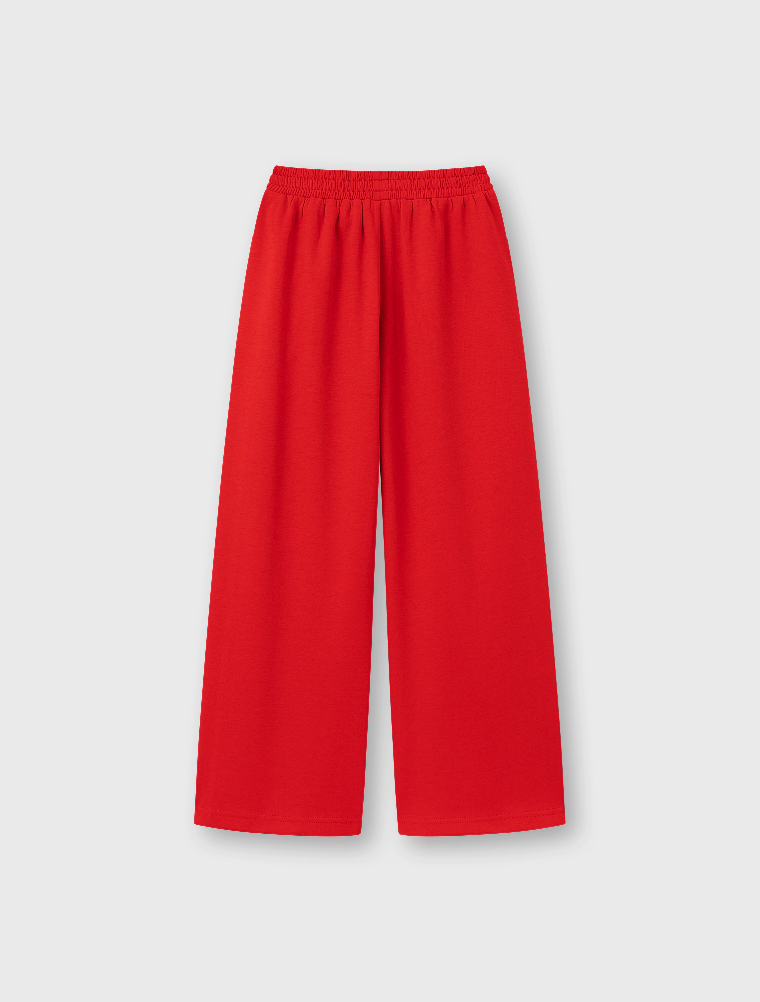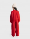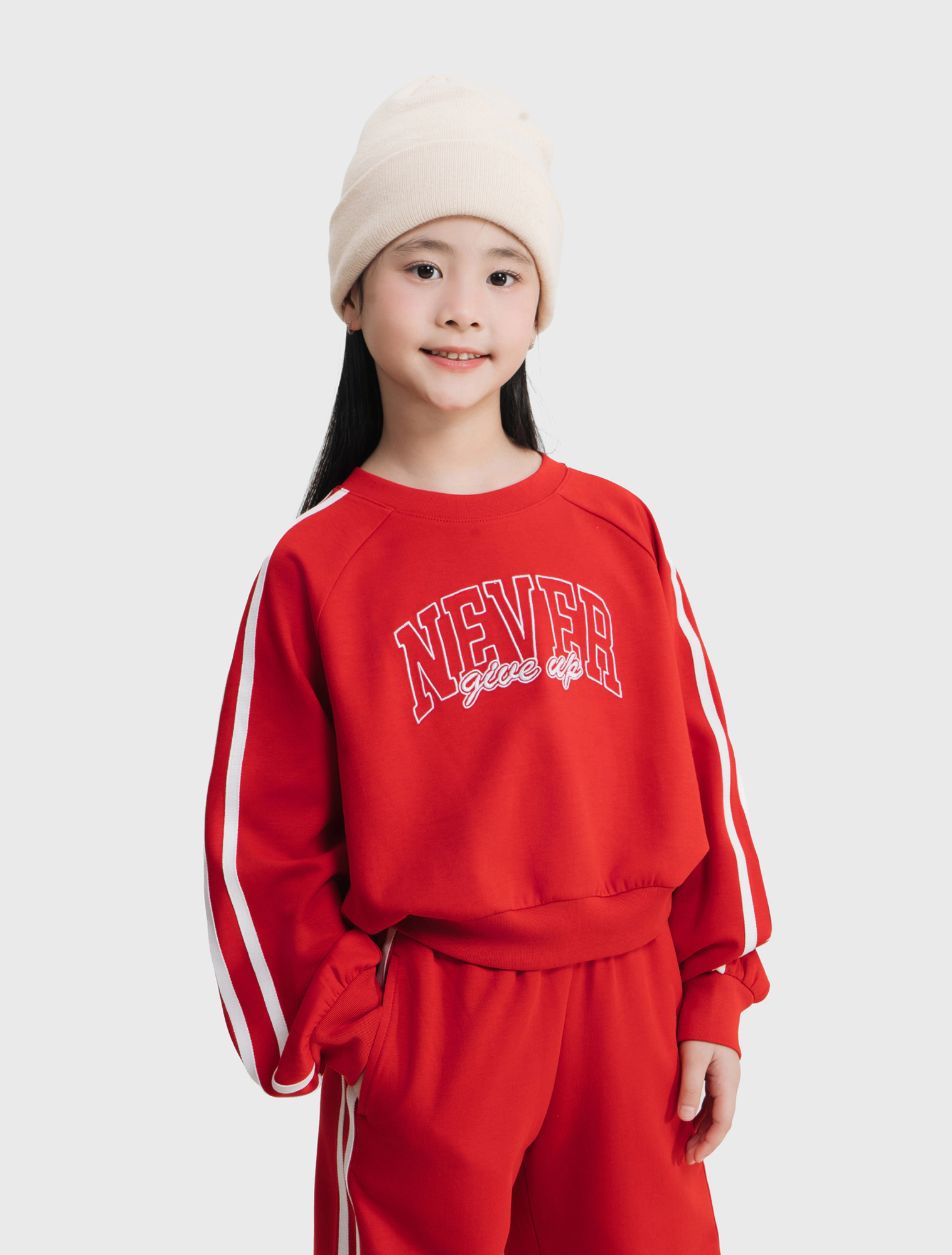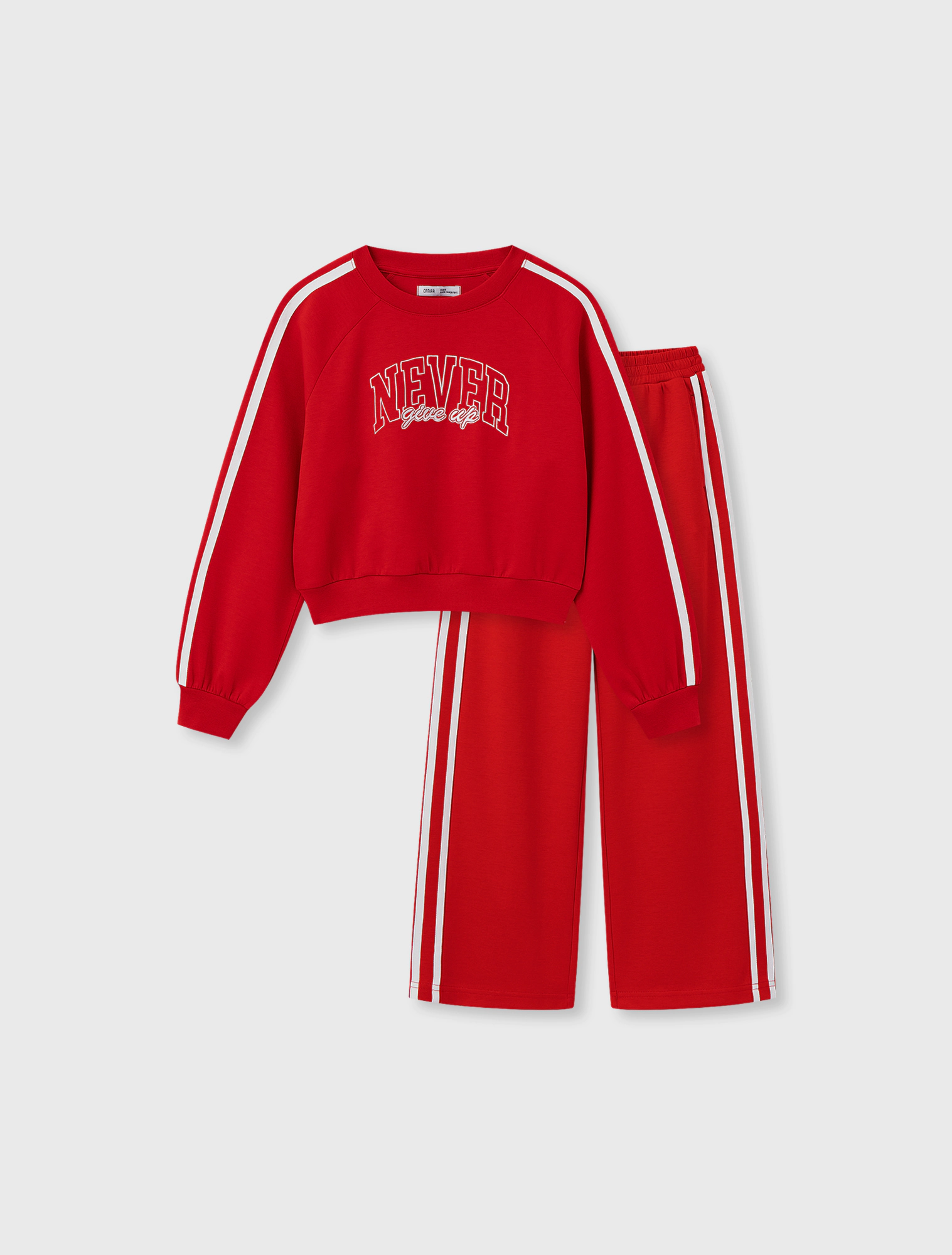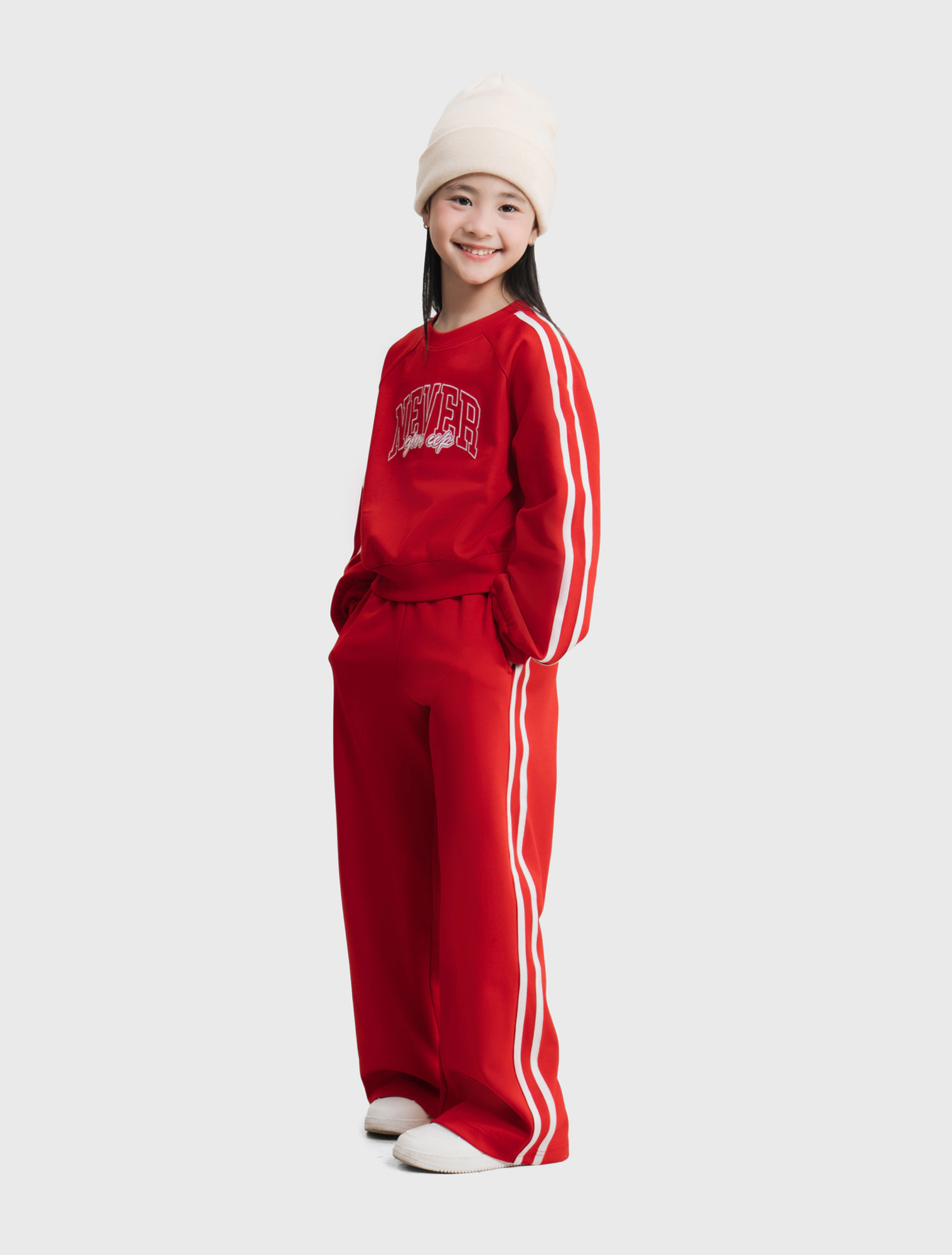 Bộ quần áo bé gái. Áo dài tay kết hợp quần suông trẻ trung hiện đại. Màu đỏ nổi bật, sống tay và sườn quần đè dây dệt trắng trang trí cá tính, đồ họa phù hợp bé gái. Chất liệu Interlock mềm mại, giữ ấm tốt, đứng phom.